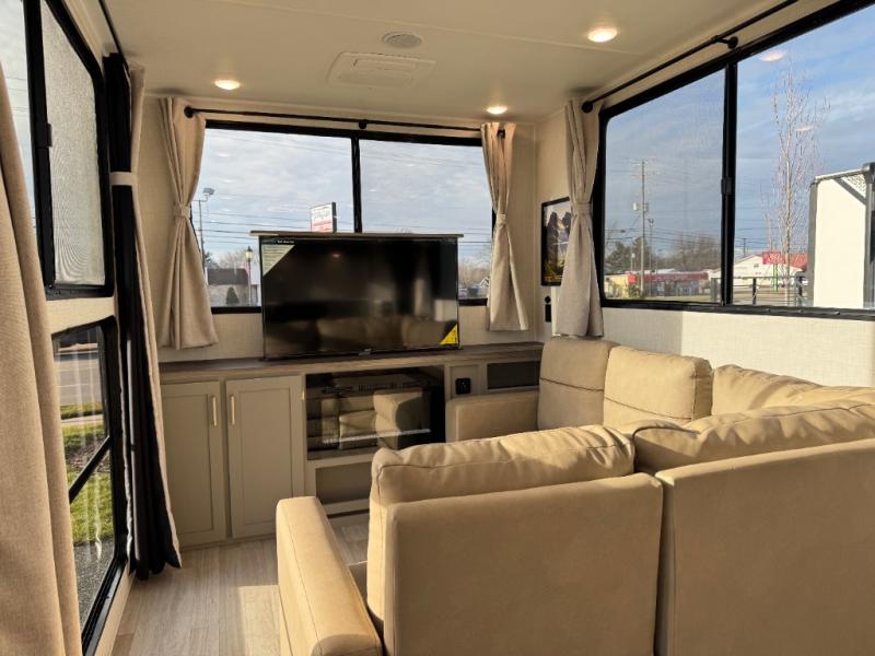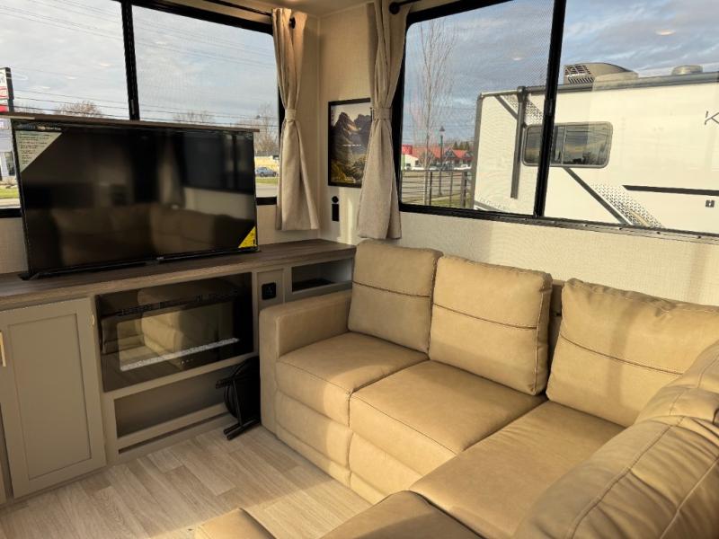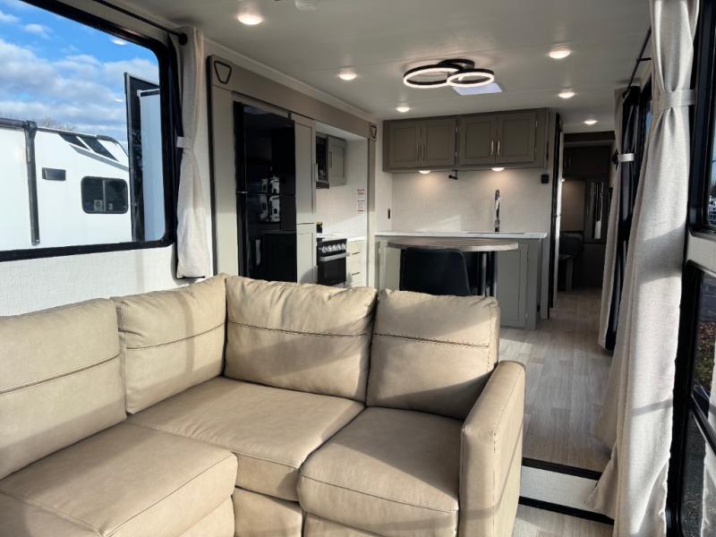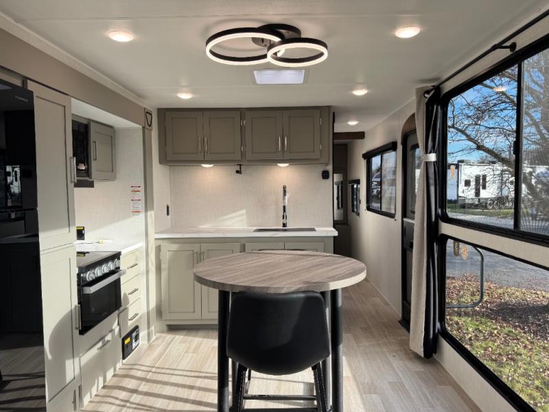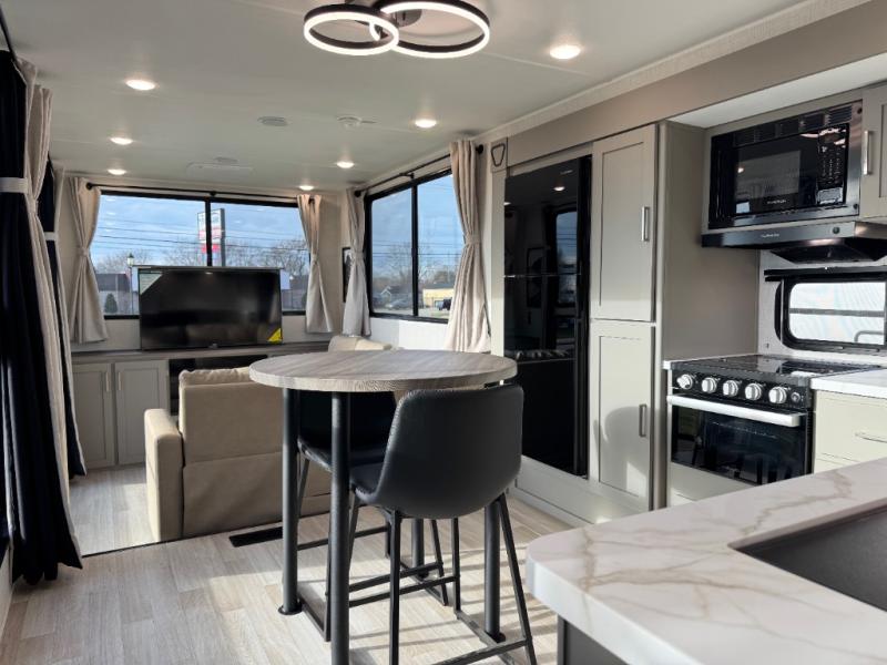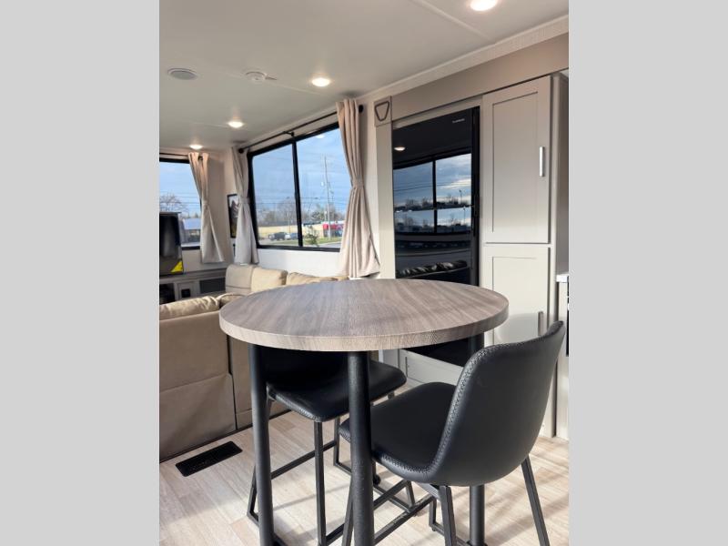 This travel trailer is designed for campers who want residential-style comfort without giving up easy towing, offering a smart, functional layout for everyday living on the road. A sunken living room creates a cozy, separate lounge space, complete with a fireplace and a large sectional sofa that’s perfect for stretching out or hosting friends. In the kitchen area, a bistro table gives you a stylish spot for coffee, meals, or laptops without eating up floor space. At the end of the day, you can retreat to the front bedroom where an Olympic queen bed and dual wardrobes provide extra sleeping room and plenty of storage so you can stay organized and feel at home on every trip.