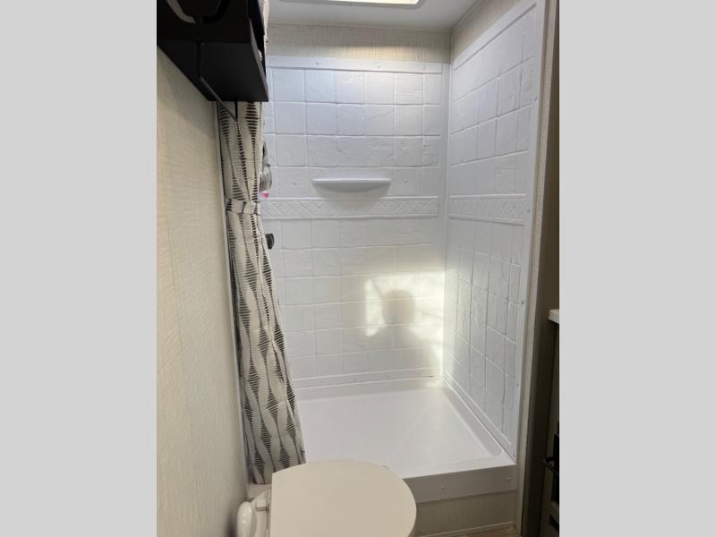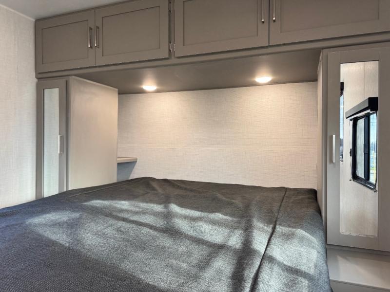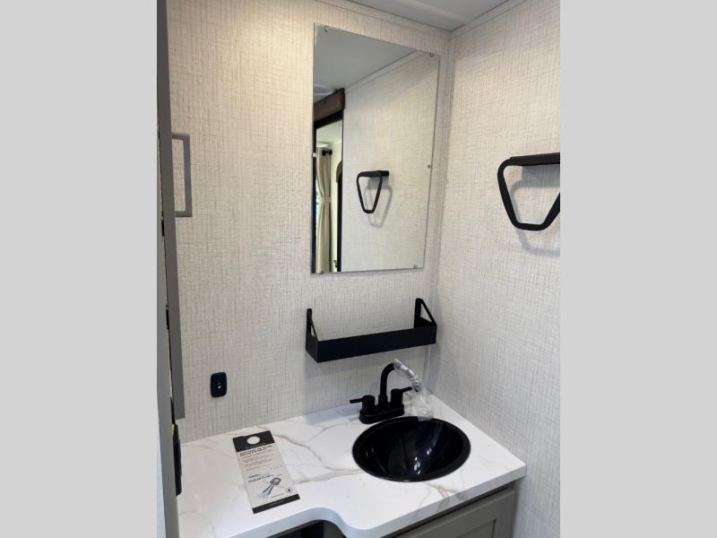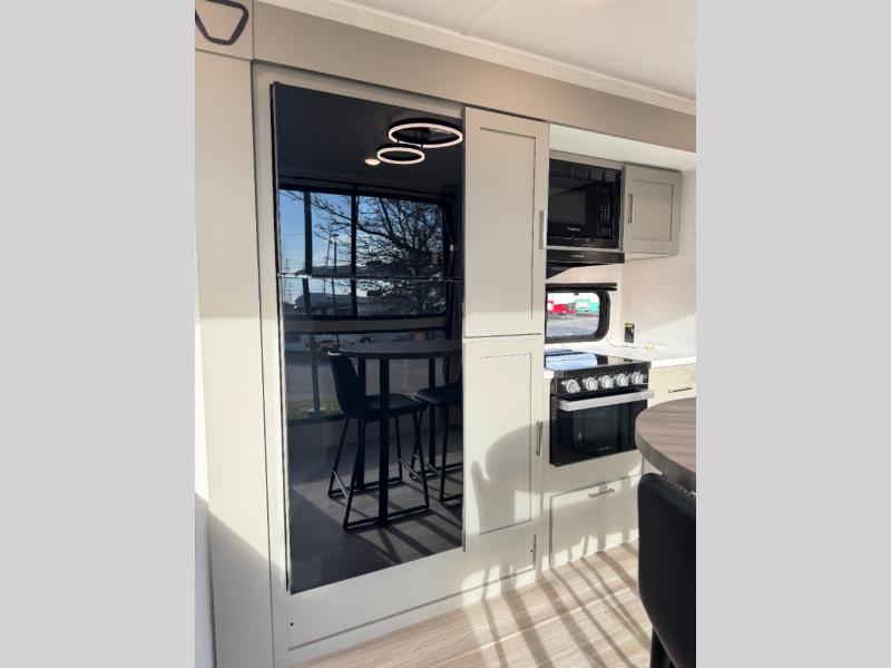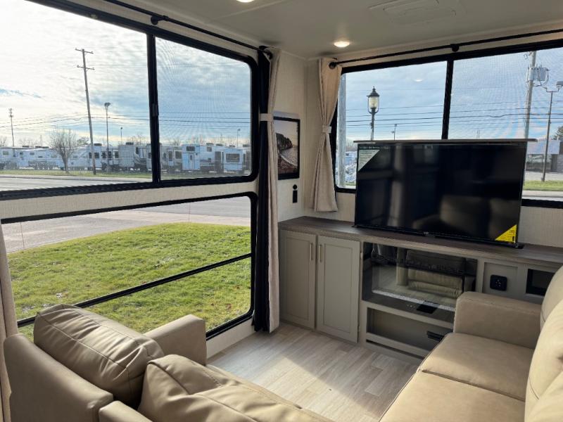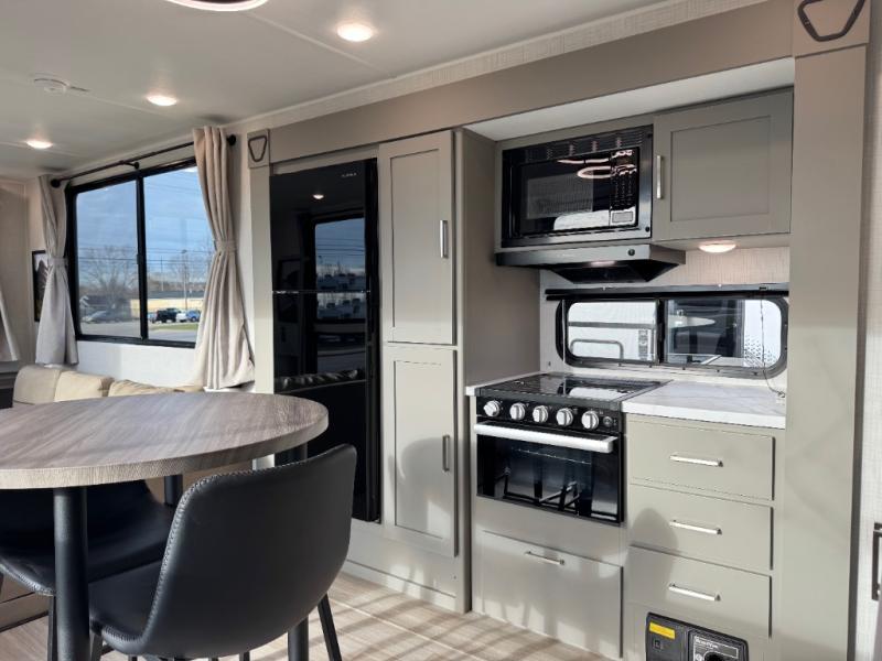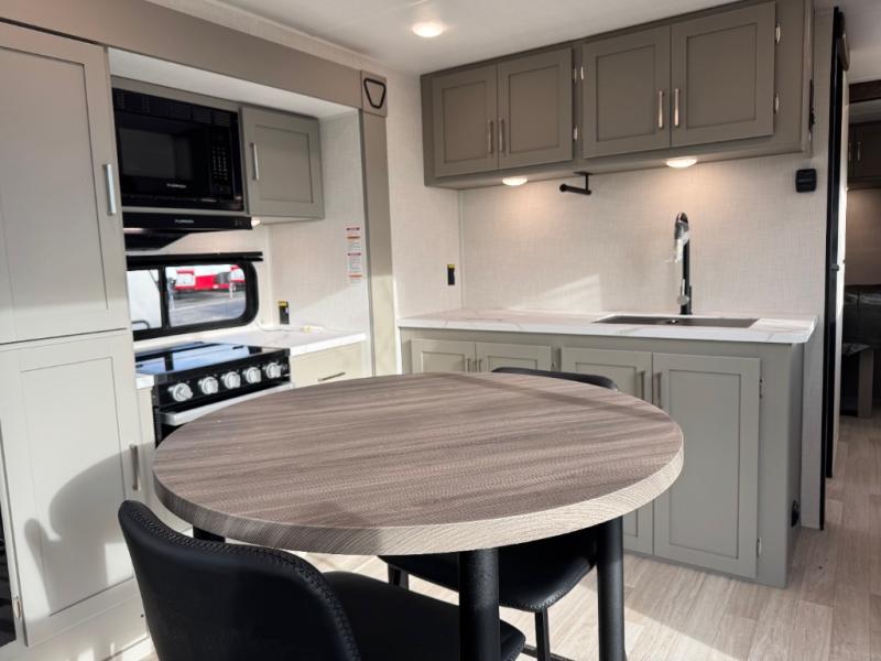 This travel trailer is designed for campers who want residential-style comfort without giving up easy towing, offering a smart, functional layout for everyday living on the road. A sunken living room creates a cozy, separate lounge space, complete with a fireplace and a large sectional sofa that’s perfect for stretching out or hosting friends. In the kitchen area, a bistro table gives you a stylish spot for coffee, meals, or laptops without eating up floor space. At the end of the day, you can retreat to the front bedroom where an Olympic queen bed and dual wardrobes provide extra sleeping room and plenty of storage so you can stay organized and feel at home on every trip.