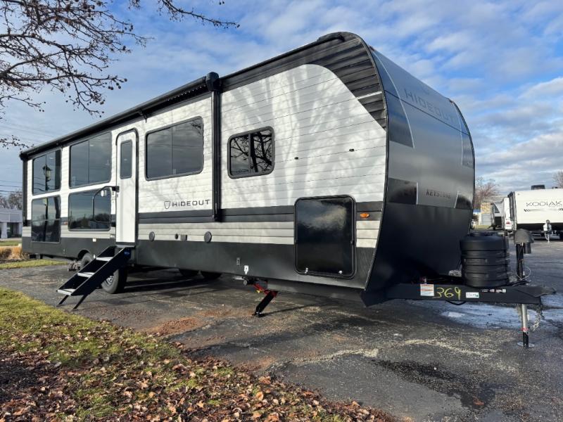 Hideout Max travel trailers by Keystone are built to make the most of every trip, with durable construction, a fully walkable roof with ladder prep, tinted safety glass windows, and solid step entry steps that make getting in and out easy. Standard features like a waterproof drop-frame pass-through for bulky gear, a power awning with LED lights, power stabilizer jacks, and a power tongue jack keep campsite setup simple, while the tankless water heater, SolarFlex™-ready wiring, and 26K dual A/C system on 30-amp service help every Hideout Max feel comfortable and capable, no matter which floorplan you choose.