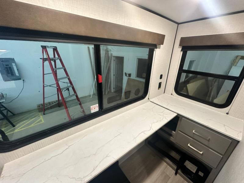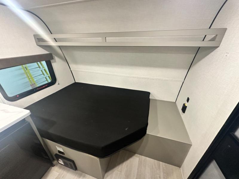 Your small crew will love camping in this lightweight travel trailer. There is a full-size bed up front with an overhead shelf to keep belongings out of the way. The two-burner cooktop and microwave oven will let you make breakfast in the morning, and the bar table with two stools provides a place to dine together. And a private bath with a shower and toilet lets you easily clean up after a day outdoors!