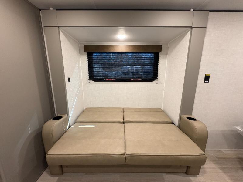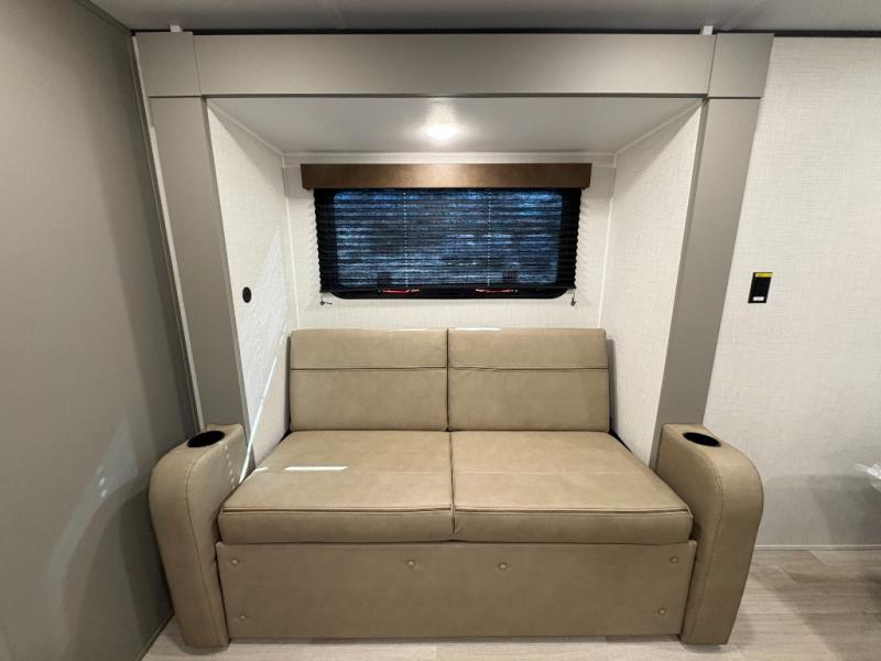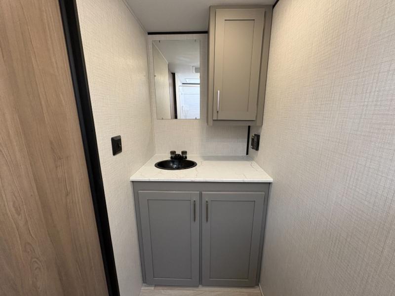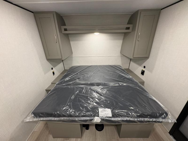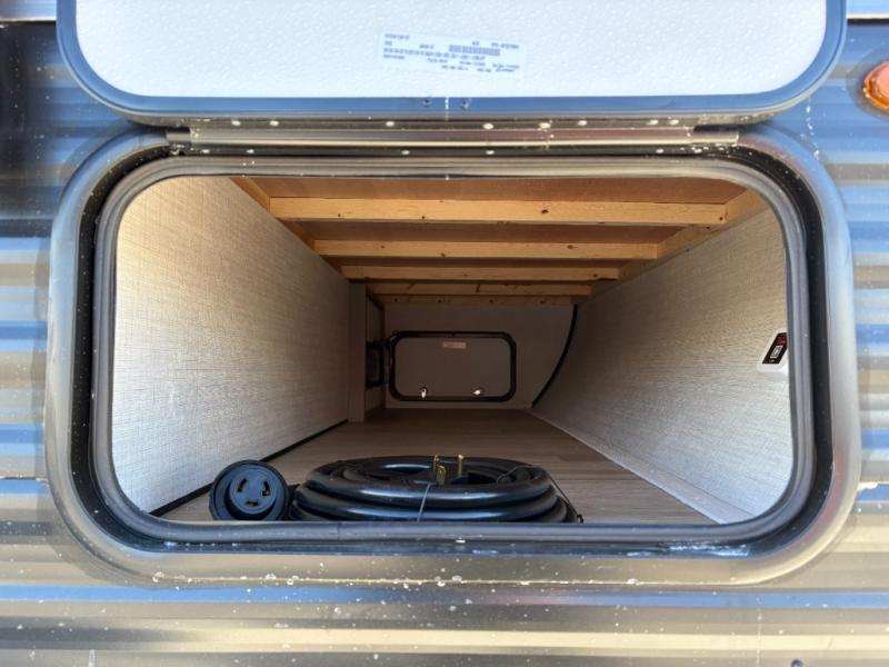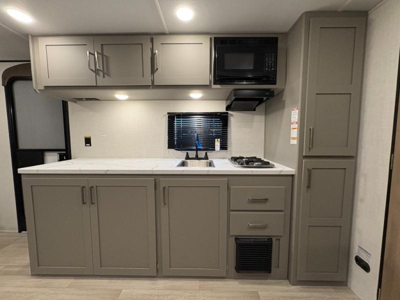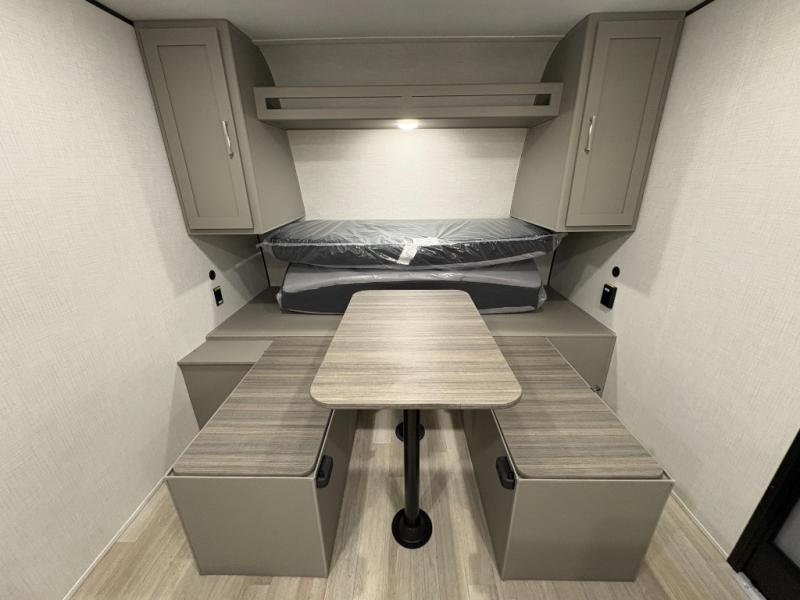 Camping trips just got easier travel trailer that can sleep three to four each night! You'll enjoy more floor space to move about thanks to the sofa slide out, and the full bath is tucked in the back for added privacy. There is generous counter space in the kitchen, along with a two-burner cooktop and microwave oven to cook meals. Up front, you'll find a picnic table to dine at, plus a Murphy style pull-out Olympic RV queen-size bed, giving you both seating and sleeping space. Dual bedside wardrobes will let you keep your clothes organized, and an exterior pass-through storage will be perfect for fishing poles, camp chairs and more!