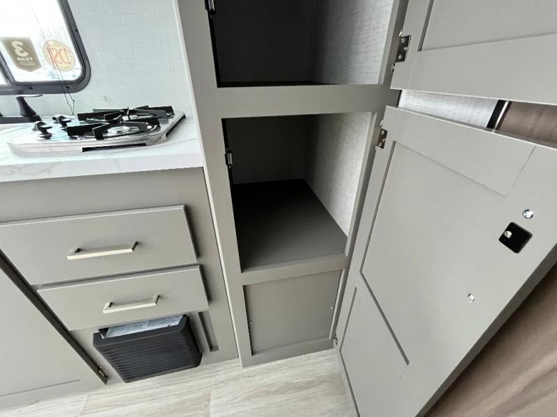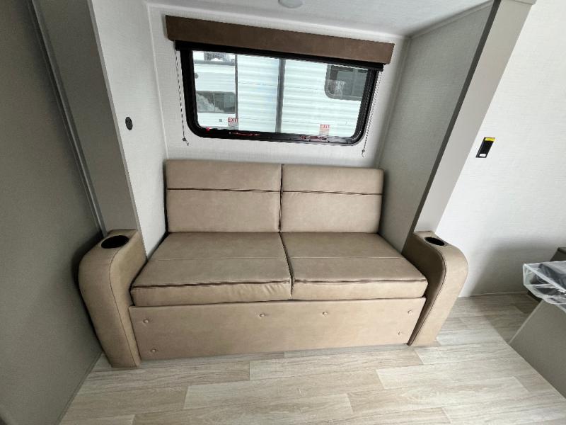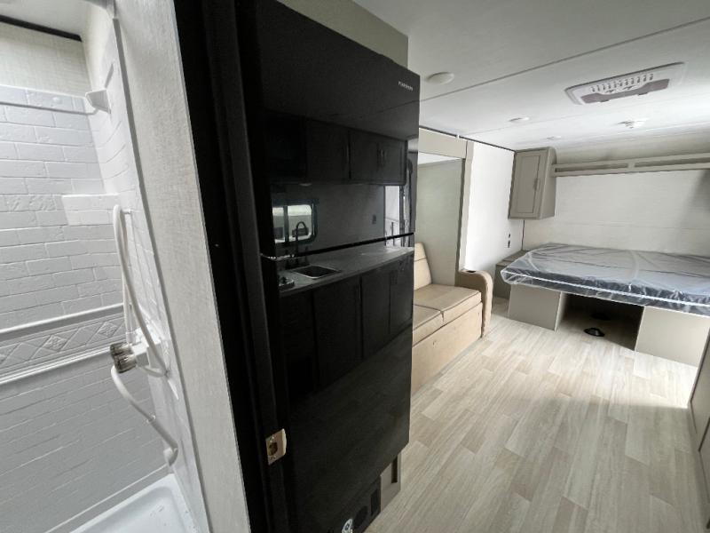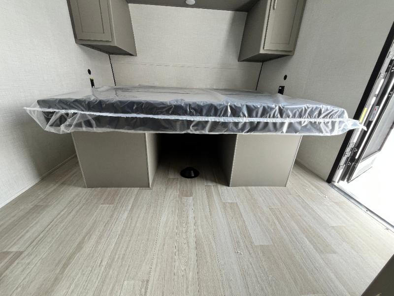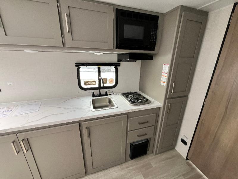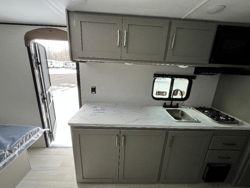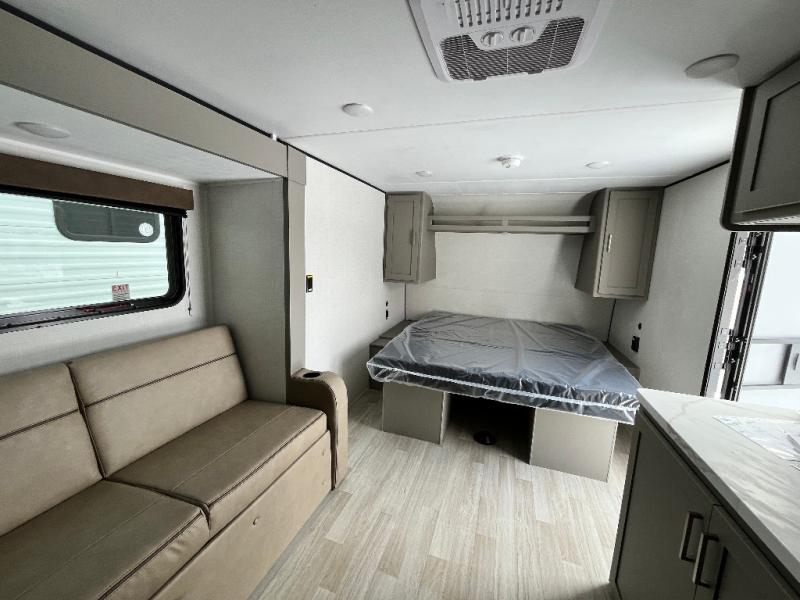 Camping trips just got easier travel trailer that can sleep three to four each night! You'll enjoy more floor space to move about thanks to the sofa slide out, and the full bath is tucked in the back for added privacy. There is generous counter space in the kitchen, along with a two-burner cooktop and microwave oven to cook meals. Up front, you'll find a picnic table to dine at, plus a Murphy style pull-out Olympic RV queen-size bed, giving you both seating and sleeping space. Dual bedside wardrobes will let you keep your clothes organized, and an exterior pass-through storage will be perfect for fishing poles, camp chairs and more!