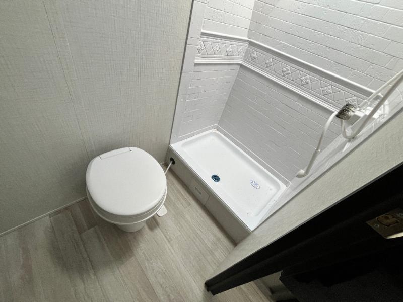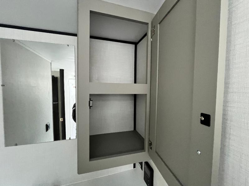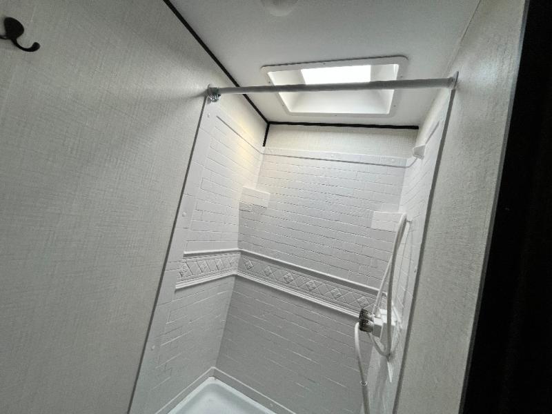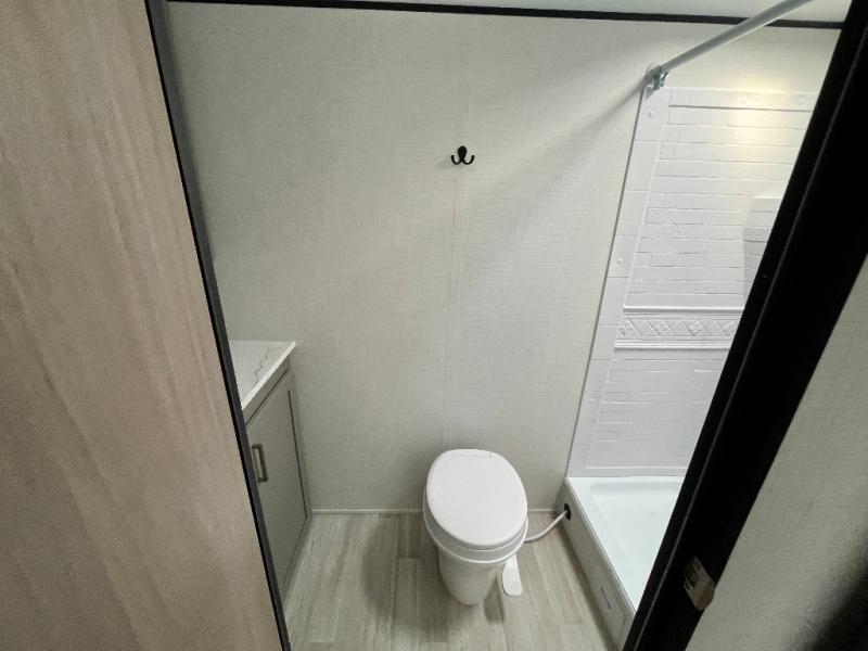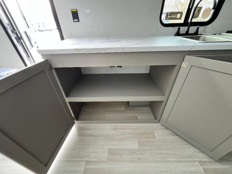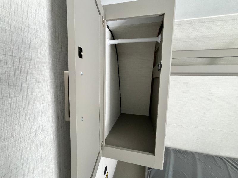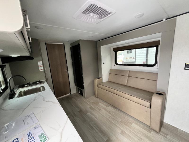 Camping trips just got easier travel trailer that can sleep three to four each night! You'll enjoy more floor space to move about thanks to the sofa slide out, and the full bath is tucked in the back for added privacy. There is generous counter space in the kitchen, along with a two-burner cooktop and microwave oven to cook meals. Up front, you'll find a picnic table to dine at, plus a Murphy style pull-out Olympic RV queen-size bed, giving you both seating and sleeping space. Dual bedside wardrobes will let you keep your clothes organized, and an exterior pass-through storage will be perfect for fishing poles, camp chairs and more!