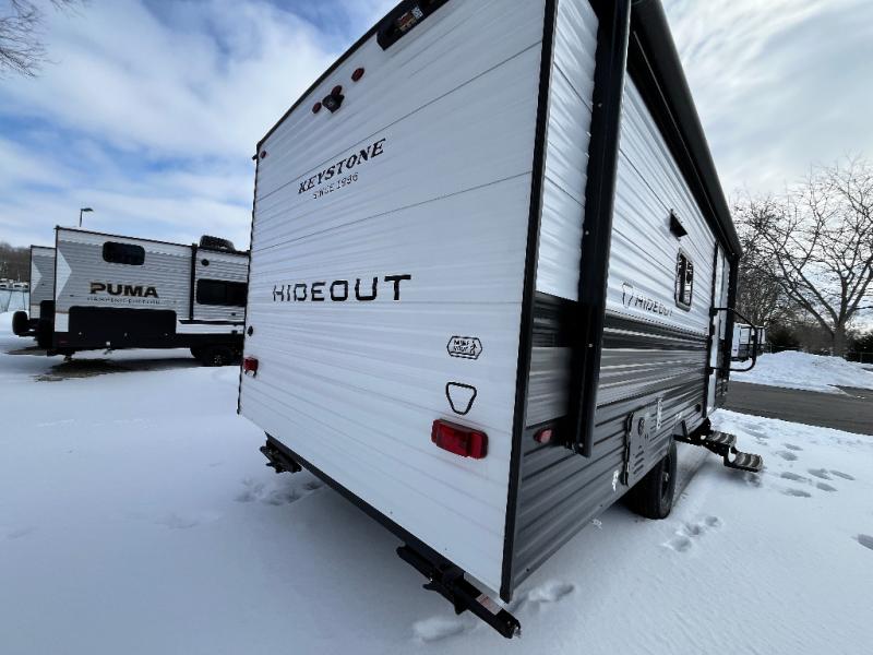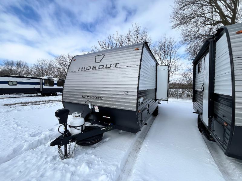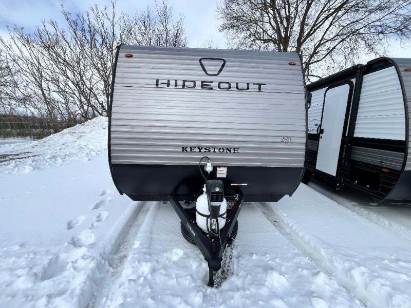 With any Hideout Mini travel trailer by Keystone, you will enjoy lightweight towing thanks to their single axle! The XL tinted safety glass windows are ultra durable, and the power awning will provide protection from the sun as you relax in your camp chairs outside. Each model includes blackout night shades, LED lighting, plus many more interior comforts. There is also a 20K BTU furnace to keep you comfortable, plus a tankless water heater for endless hot showers!