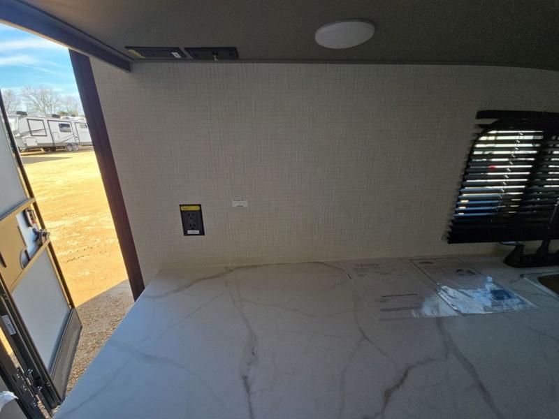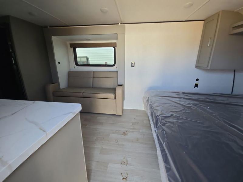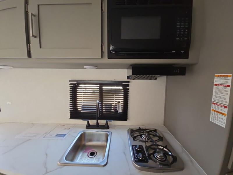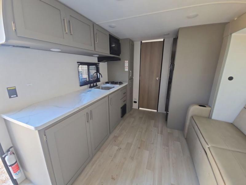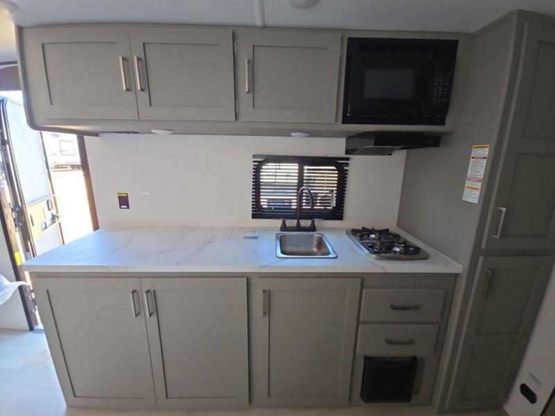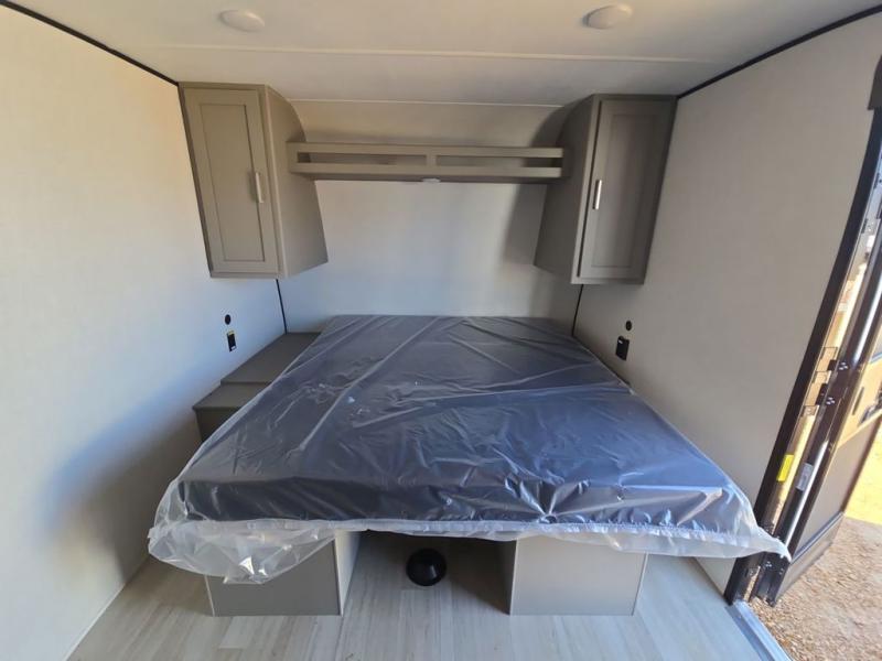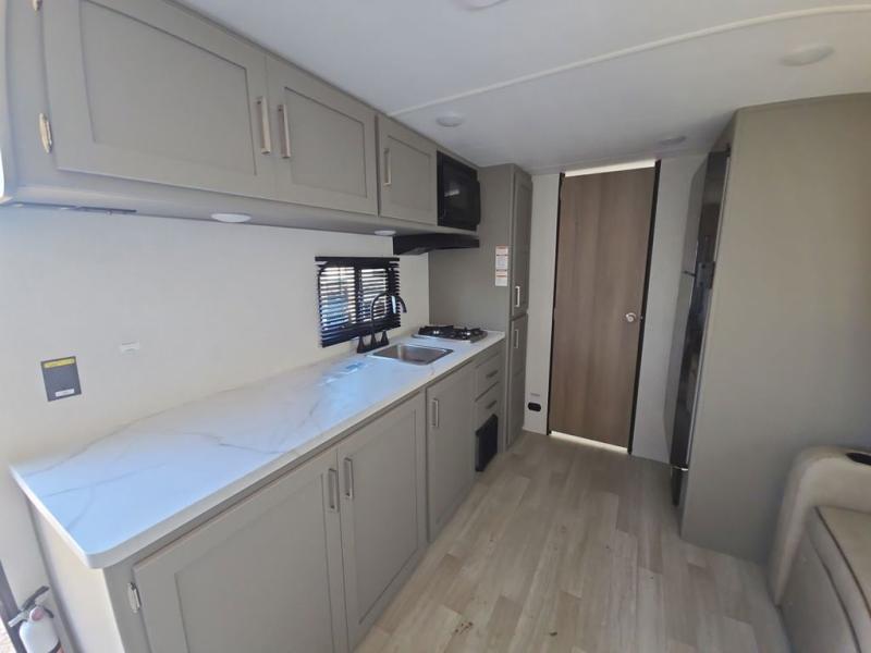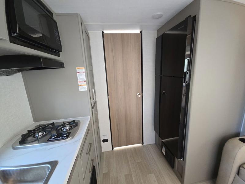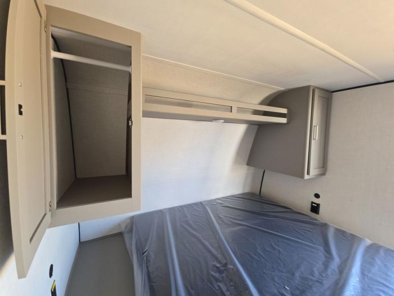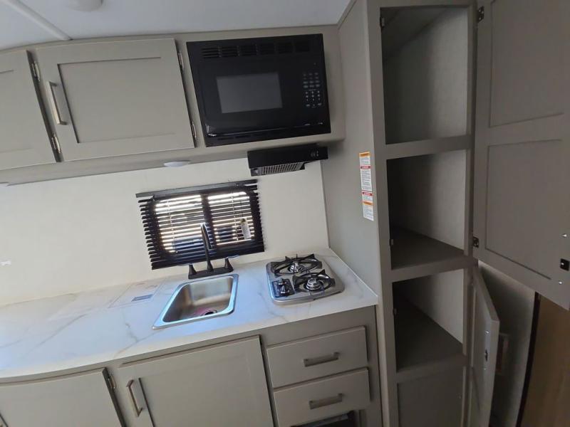 Camping trips just got easier travel trailer that can sleep three to four each night! You'll enjoy more floor space to move about thanks to the sofa slide out, and the full bath is tucked in the back for added privacy. There is generous counter space in the kitchen, along with a two-burner cooktop and microwave oven to cook meals. Up front, you'll find a picnic table to dine at, plus a Murphy style pull-out Olympic RV queen-size bed, giving you both seating and sleeping space. Dual bedside wardrobes will let you keep your clothes organized, and an exterior pass-through storage will be perfect for fishing poles, camp chairs and more!
