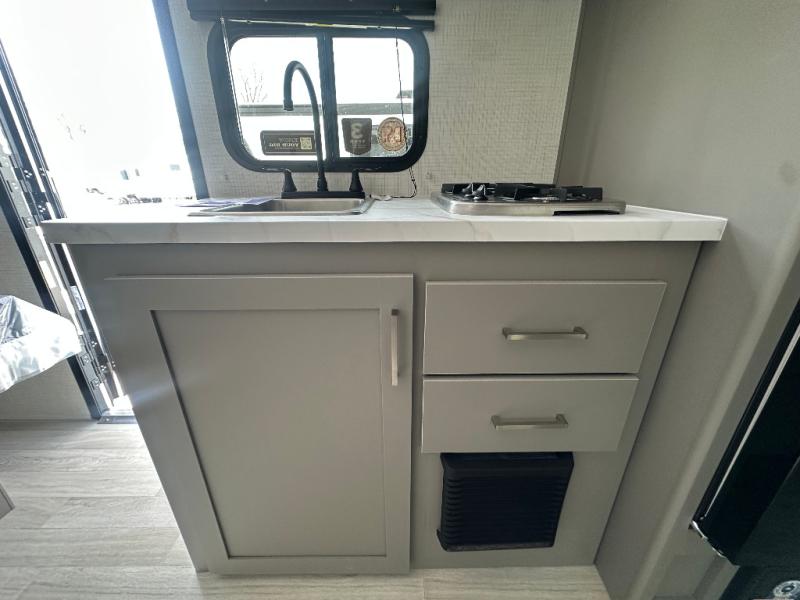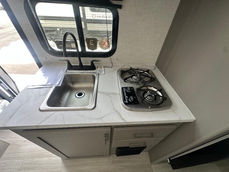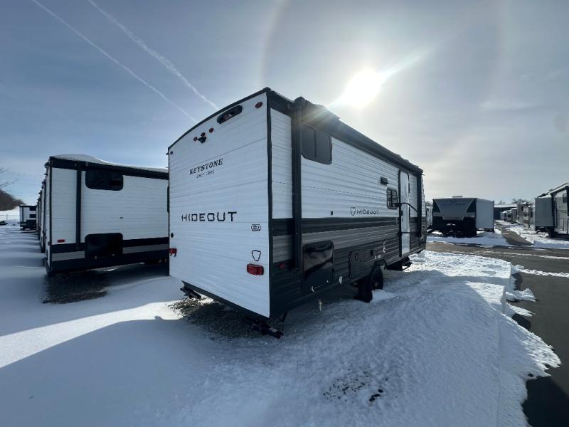 With any Hideout Mini travel trailer by Keystone, you will enjoy lightweight towing thanks to their single axle! The XL tinted safety glass windows are ultra durable, and the power awning will provide protection from the sun as you relax in your camp chairs outside. Each model includes blackout night shades, LED lighting, plus many more interior comforts. There is also a 20K BTU furnace to keep you comfortable, plus a tankless water heater for endless hot showers!