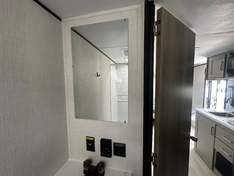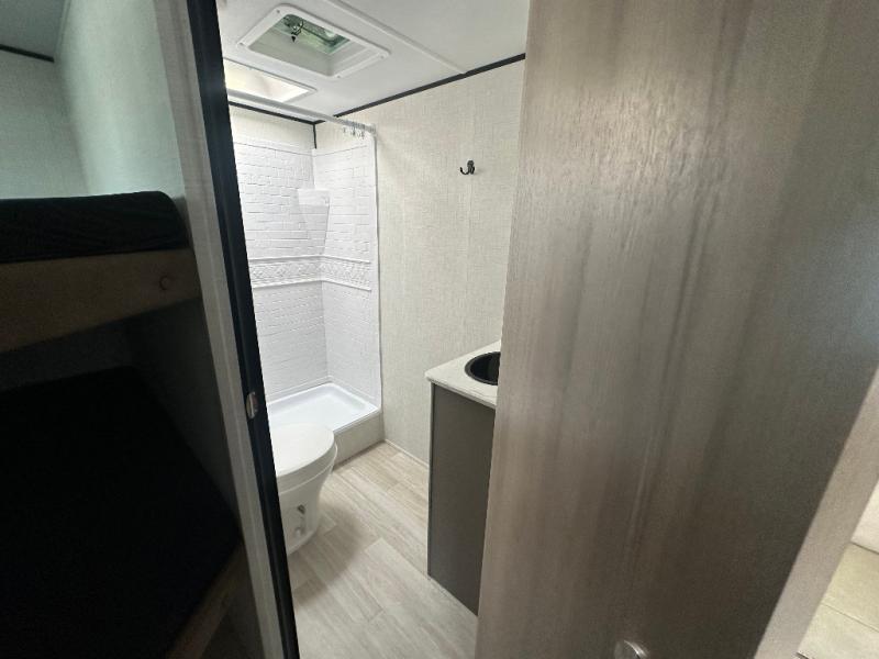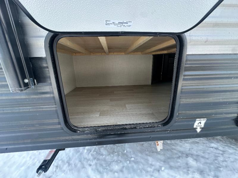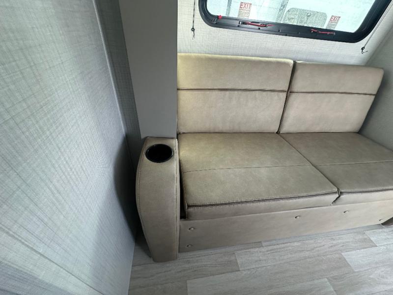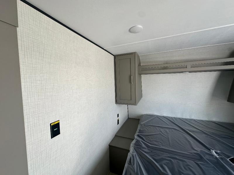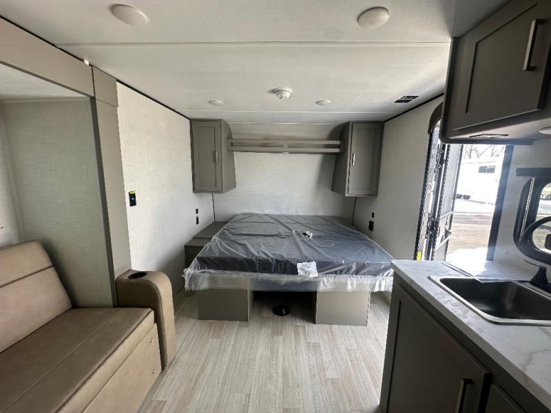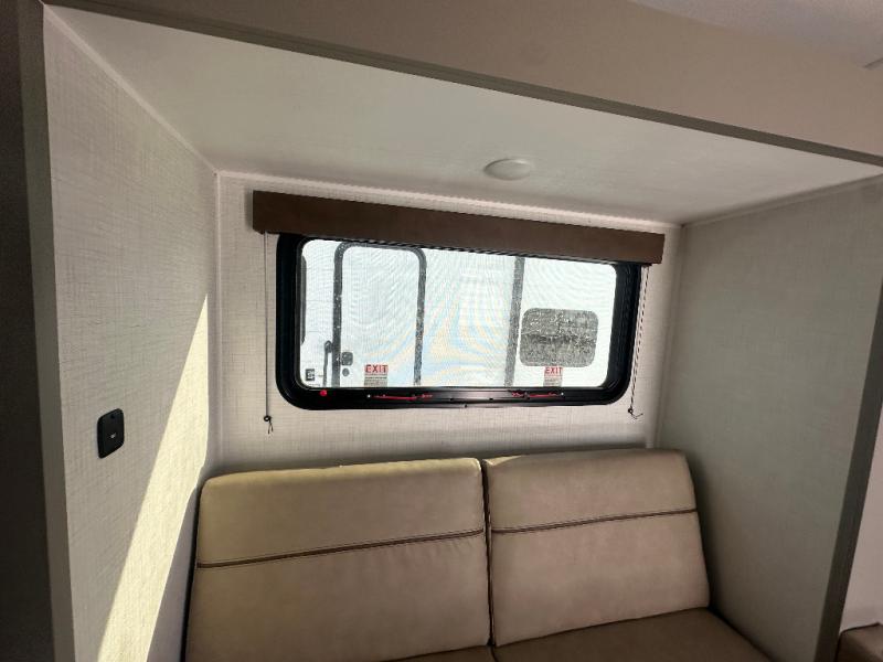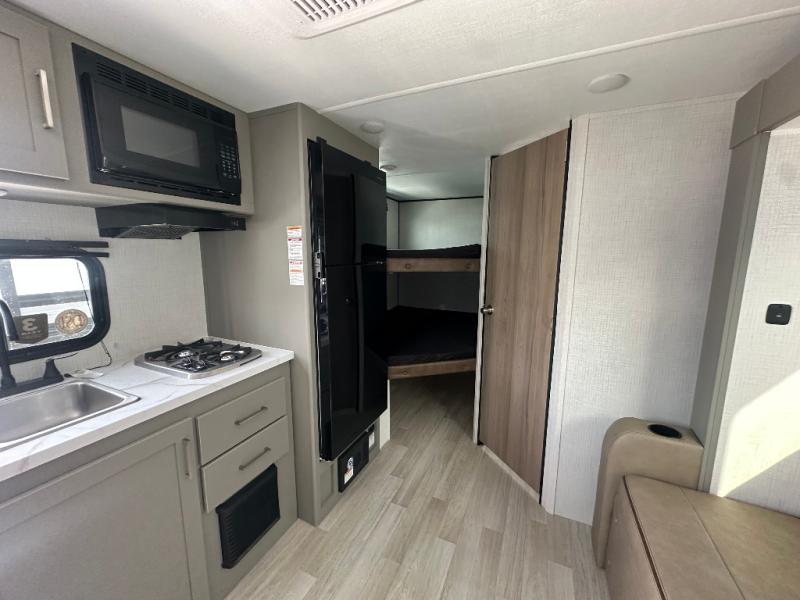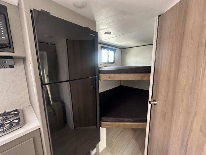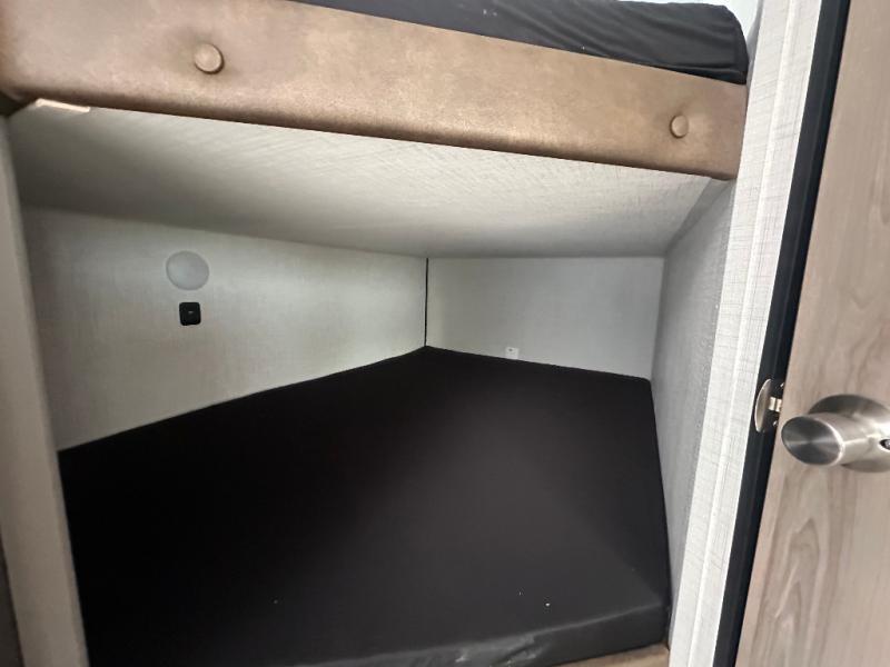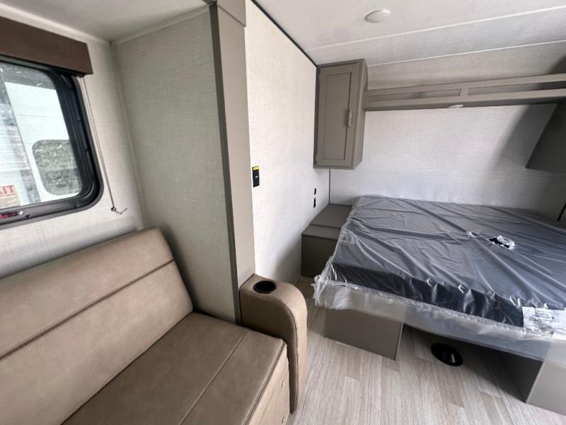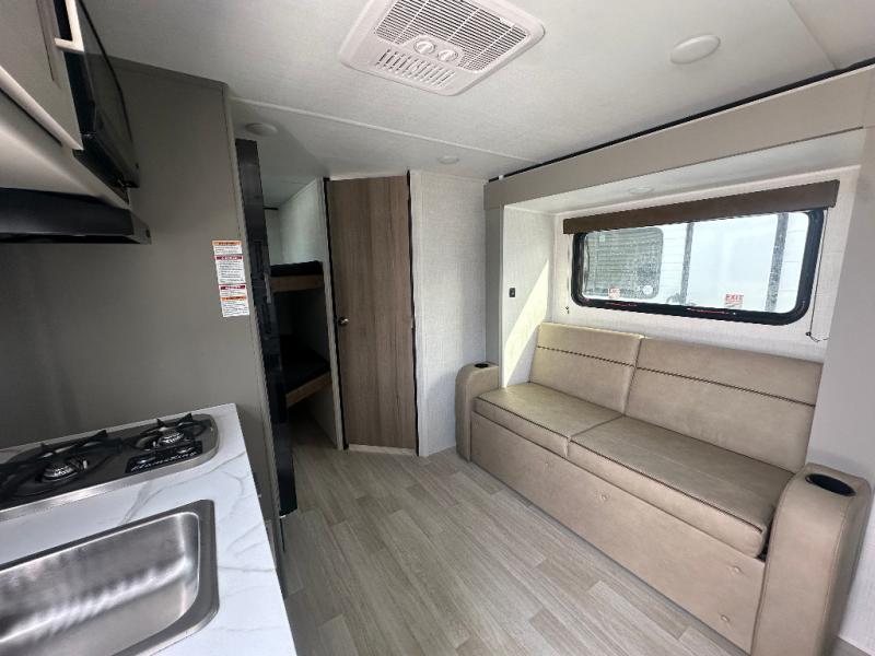 Camping trips just got easier travel trailer with double-size bunks and a sofa slide out for more sleeping and floor space! There is a two-burner cooktop and microwave oven to cook meals each day, plus a 10-cu. ft. 12V refrigerator for food storage. Up front, you'll find a picnic table to dine at, plus a Murphy style pull-out Olympic RV queen-size bed, giving you both seating and sleeping space. Dual bedside wardrobes will let you keep your clothes organized, and an exterior pass-through storage will be perfect for fishing poles, camp chairs and more!