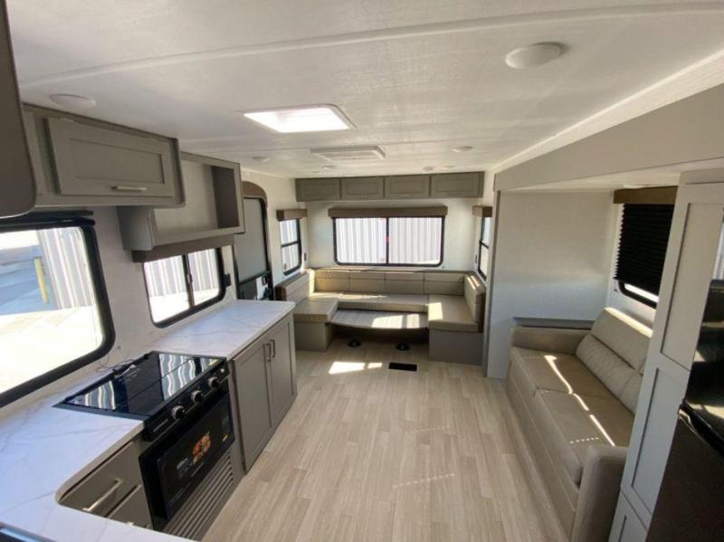 This practical layout makes traveling with family or friends effortless. The rear living area provides plenty of seating and sleeping options, while the walk-through bath adds everyday convenience. Whether you are enjoying breakfast before a day on the water or winding down after sunset, this trailer delivers comfort without complication.