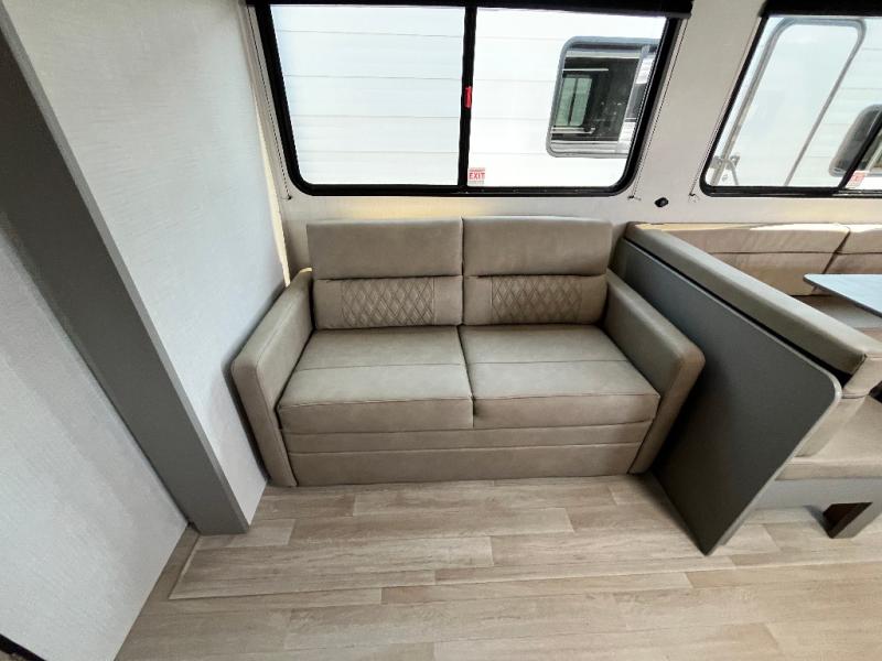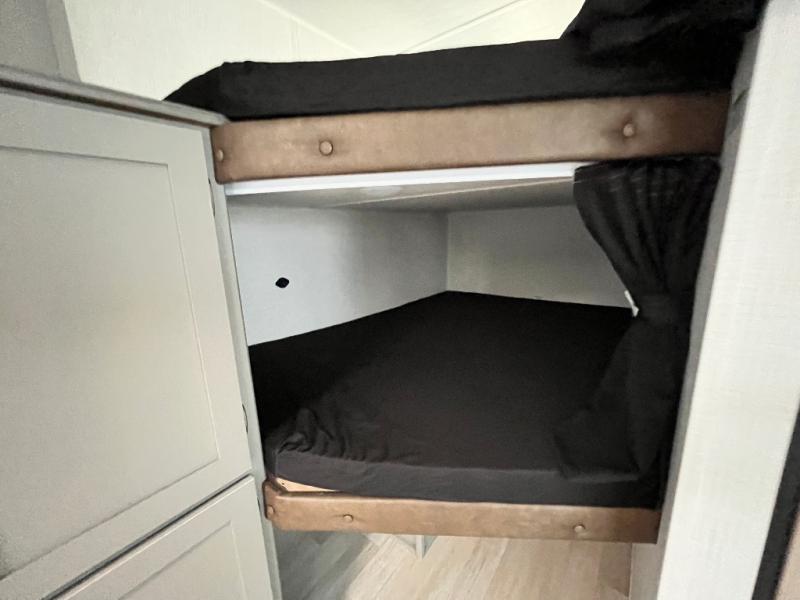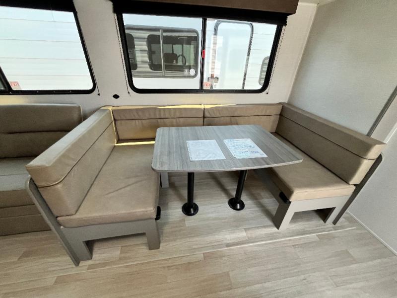 A large slide, front private bedroom, and double-size bunks make this Hideout Sport Double Axle the ultimate travel trailer! You will enjoy a walk-around queen bed in the bedroom plus dual closets and nightstands for your things. The full bath is towards the back and beside the bunks for easy nighttime use, and there is a pass-through storage outside for your gear. Head to the kitchen to prepare lunch on the cooktop, then dine at the U-shaped dinette and sofa within the large slide. If the weather is nice, you might just want to cook outdoors on the outside kitchen under the 18' power awning!