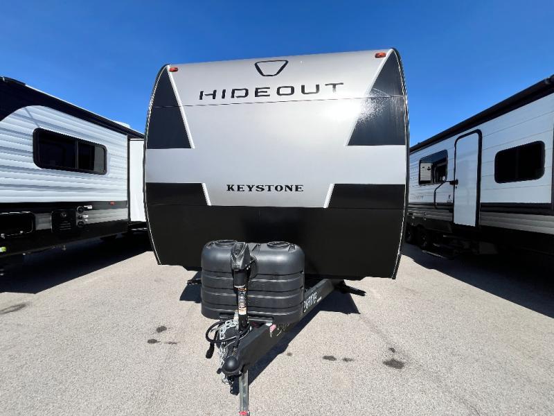 With any Hideout Sport travel trailer by Keystone you will enjoy simplified camping solutions that won't break the bank! Each model is constructed with a durable AlphaPly TPO roof membrane tinted safety glass windows, and an I-beam frame. There are power tongue jacks and heavy duty stabilizer jacks that will make it easier than ever to hitch up and go. An XL entry assist handle will also provide convenience, along with a power awning that will provide much wanted shade during the day. You will feel right at home with stylish decor, blackout night shades, and cozy bed with storage underneath!