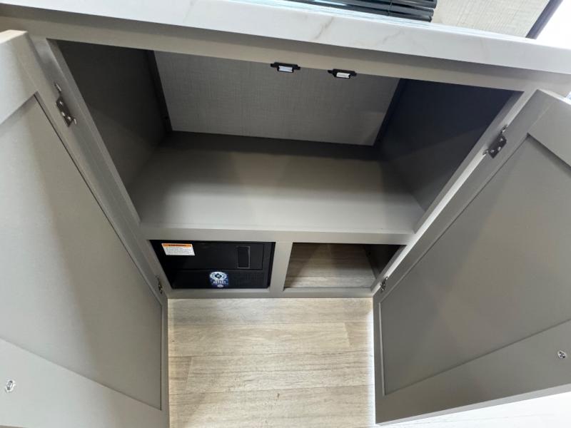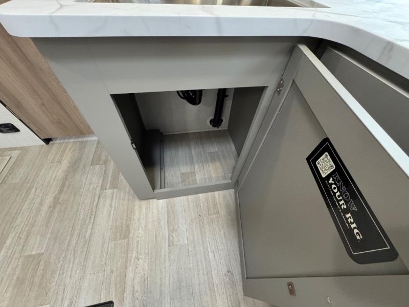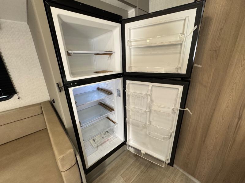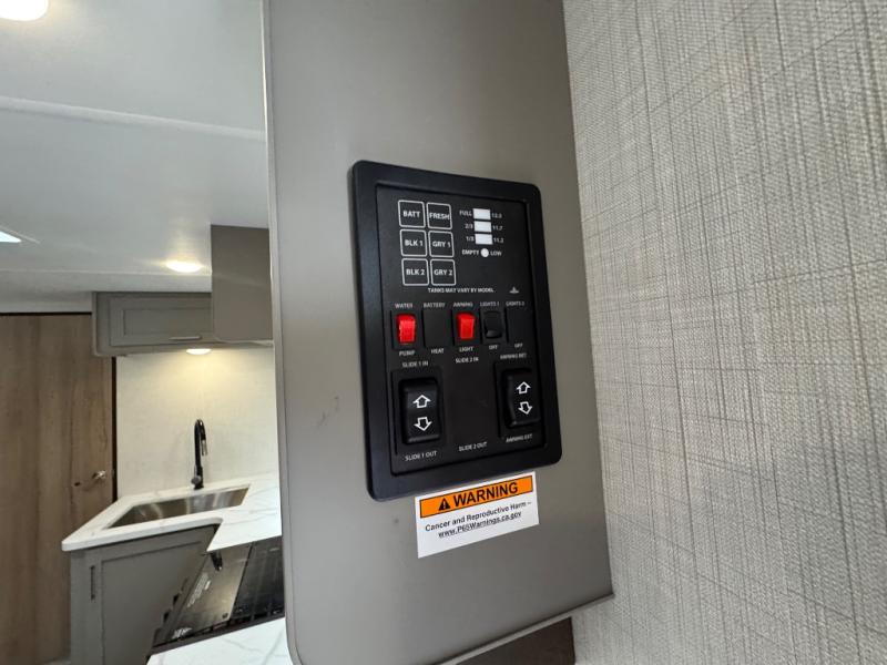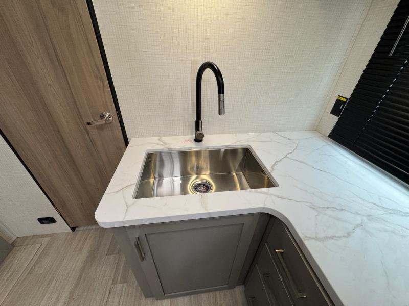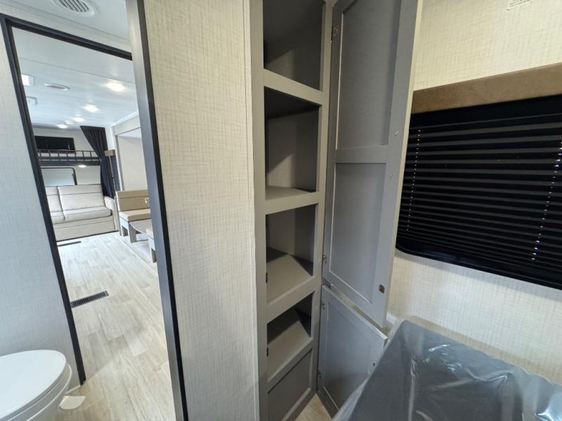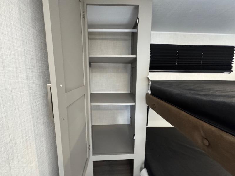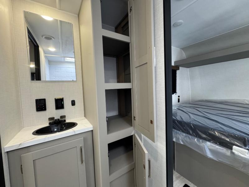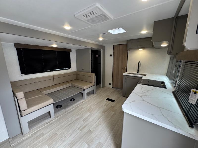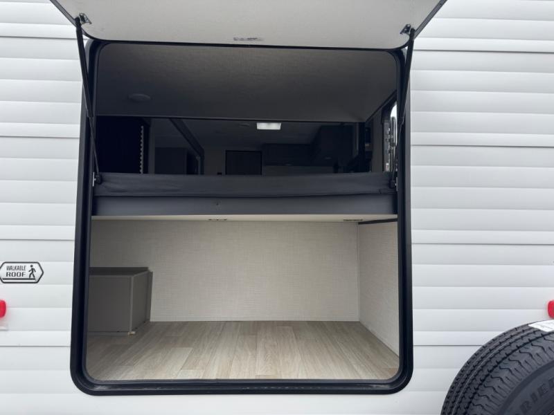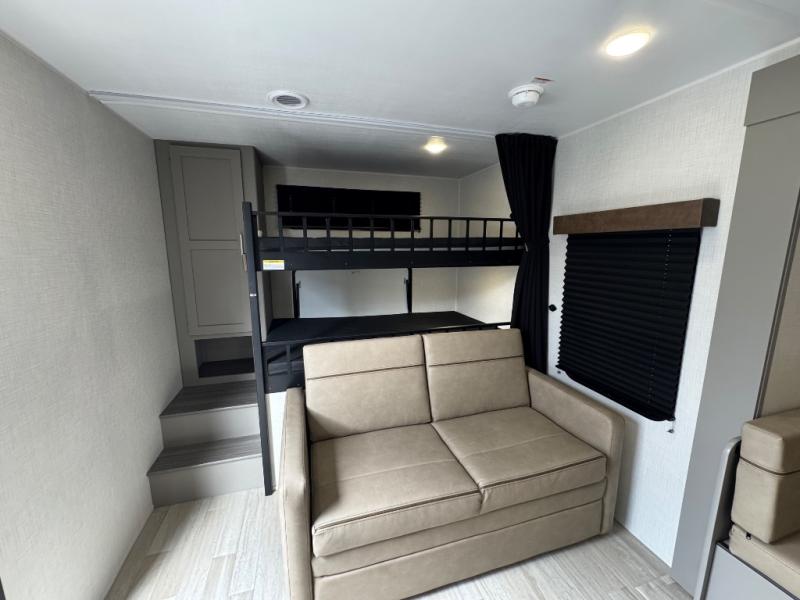 You can easily sleep nine to ten in this travel trailer, so invite the whole gang along! The bunks with flip-up utility storage will allow you to bring along extra gear, plus there is an exterior pass-thru and outside storage so nothing gets left behind. You'll find your own bedroom up front with a queen bed, a private exterior entry door and your own entrance into the walk-through bath! Once lunch has been made, your crew can dine around the U-shaped dinette, relax on the sofa, or enjoy some fresh air under the 18' power awning outdoors!