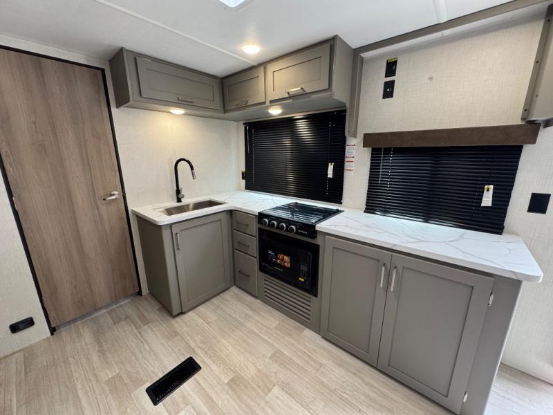 With any Hideout Sport travel trailer by Keystone you will enjoy simplified camping solutions that won't break the bank! Each model is constructed with a durable AlphaPly TPO roof membrane tinted safety glass windows, a walkable roof, and an I-beam frame. There are power tongue jacks and heavy duty stabilizer jacks that will make it easier than ever to hitch up and go. An XL entry assist handle will also provide convenience, along with a power awning that will provide much wanted shade during the day. You will feel right at home with stylish decor, blackout night shades, and cozy bed with storage underneath!