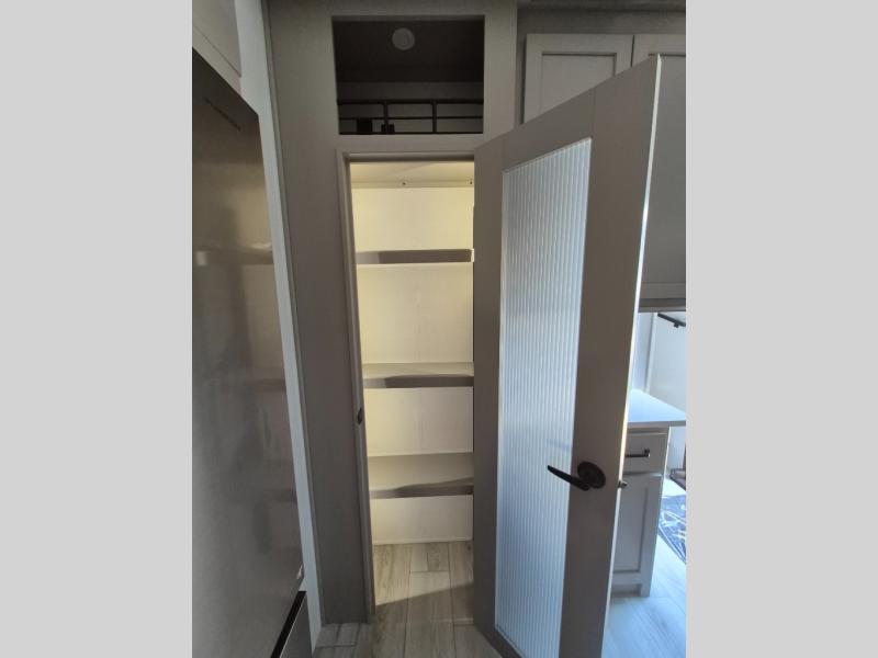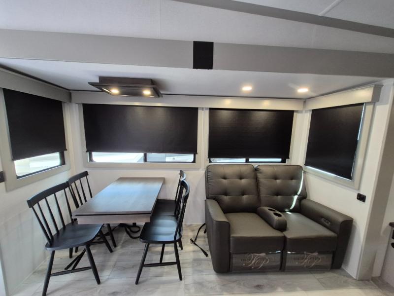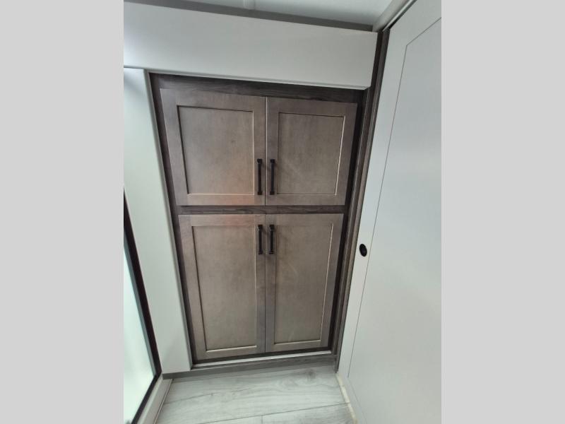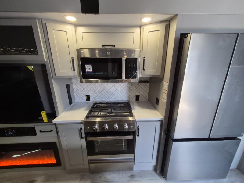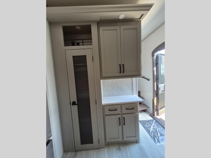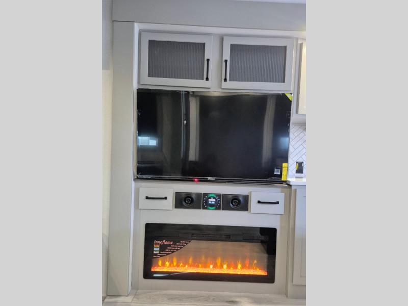 You can take this Montana High Country fifth wheel to the campsite of your choice! You'll have plenty of comfort with the king-size bed in the front master suite, and you can also let some friends or kids sleep on the hide-a-bed sofa in the rear living area. While you watch the 50" TV, you can sit back in the power theater seating, and you can switch on the fireplace for some added heat if it's cool outside. The opposing slides in the main living area are what give you extra space to work freely around the kitchen island, and the coffee station allows you to prepare your afternoon pick-me-up with all of your coffee essentials sitting in one place just like at home.