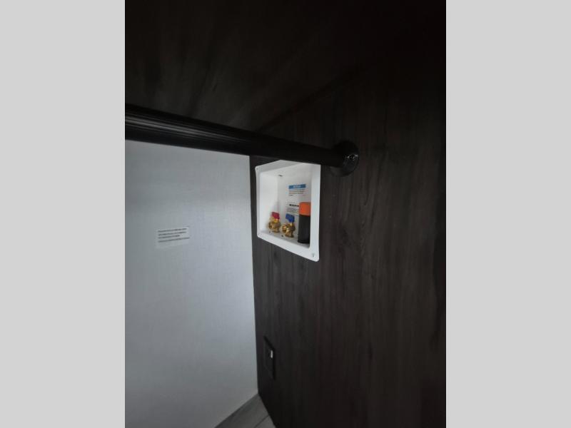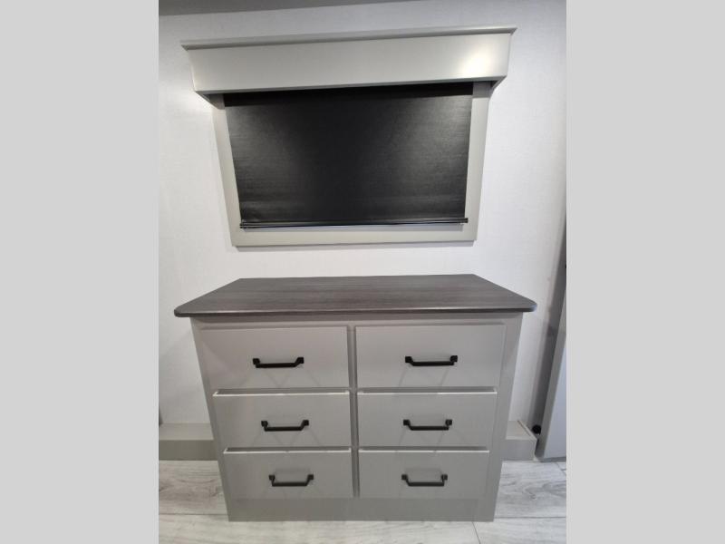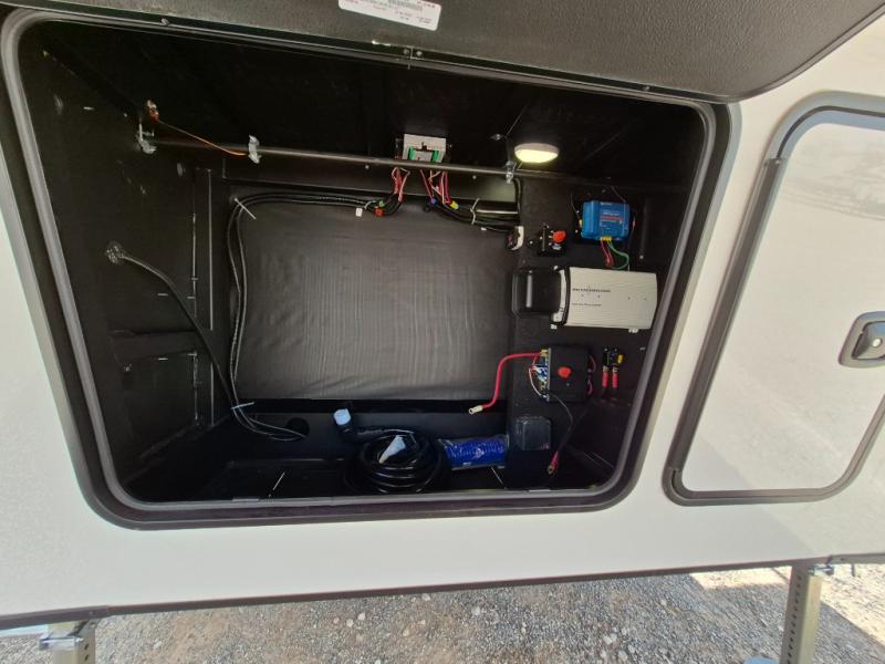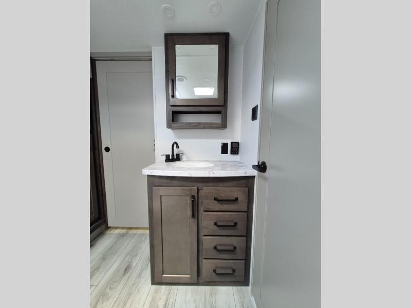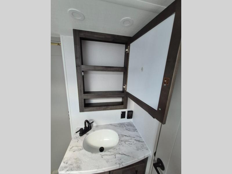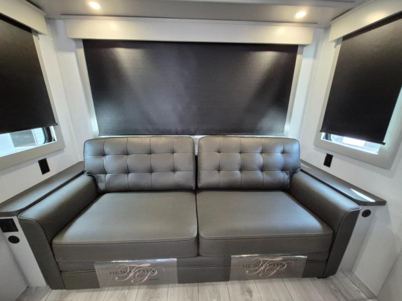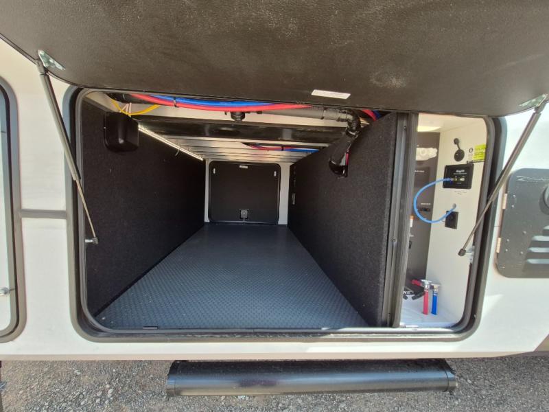 You can take this Montana High Country fifth wheel to the campsite of your choice! You'll have plenty of comfort with the king-size bed in the front master suite, and you can also let some friends or kids sleep on the hide-a-bed sofa in the rear living area. While you watch the 50" TV, you can sit back in the power theater seating, and you can switch on the fireplace for some added heat if it's cool outside. The opposing slides in the main living area are what give you extra space to work freely around the kitchen island, and the coffee station allows you to prepare your afternoon pick-me-up with all of your coffee essentials sitting in one place just like at home.