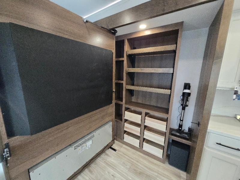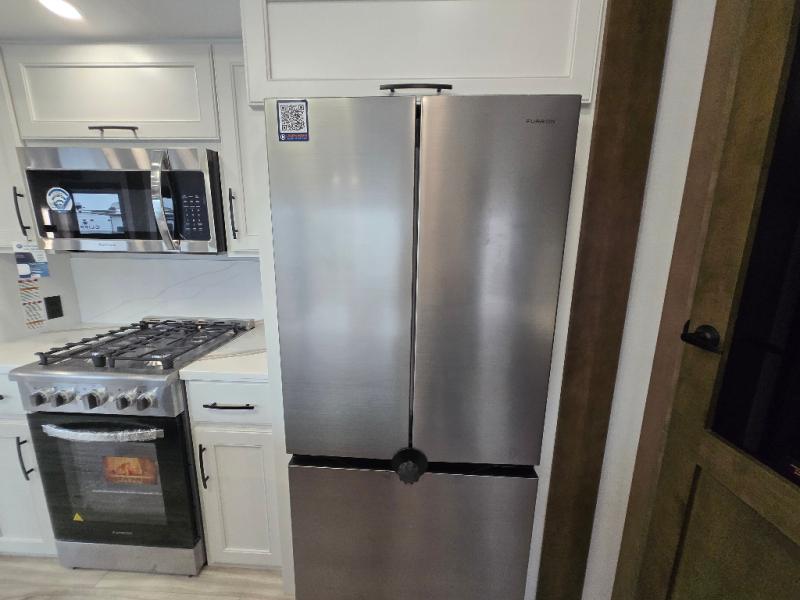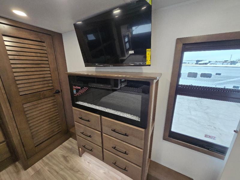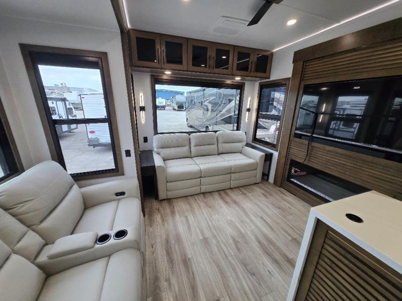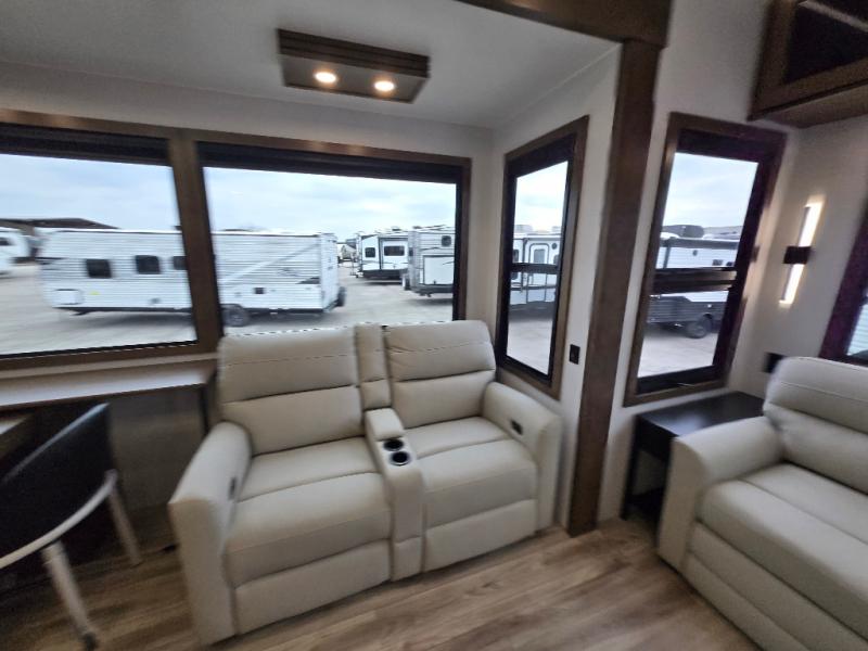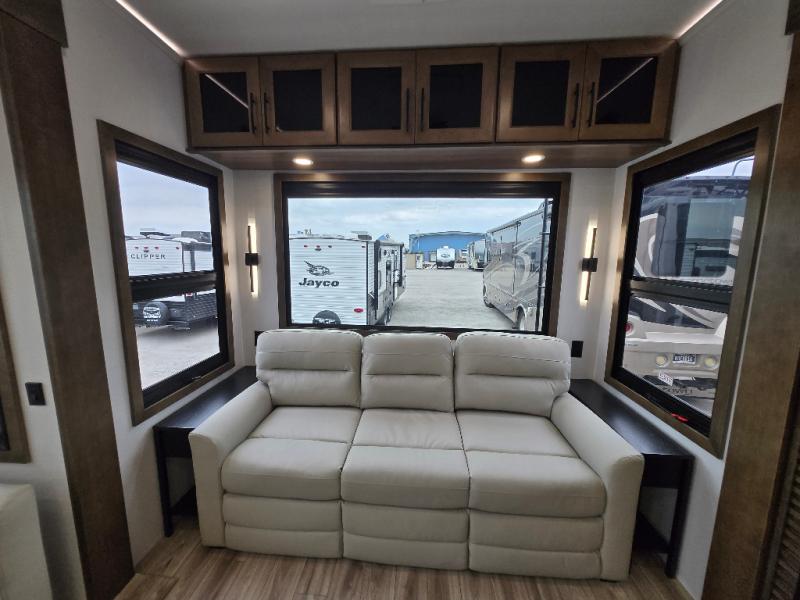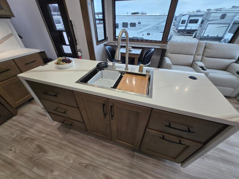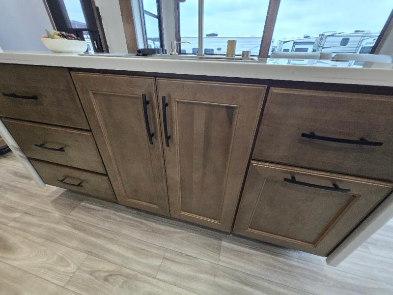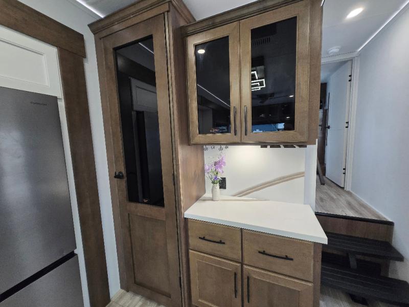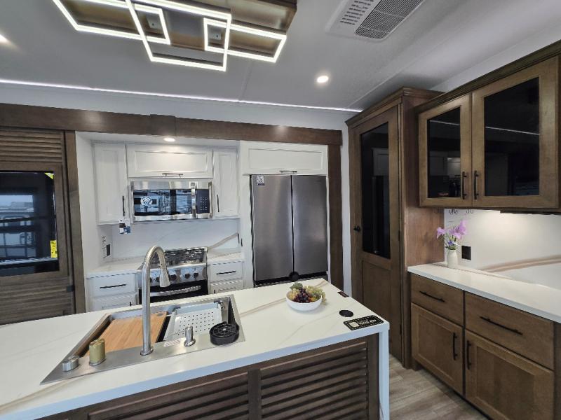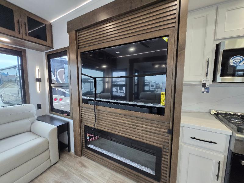 It won't be hard to find comfort in this fifth wheel with triple slides for more space, a spacious front bedroom, and a rear living area with a comfy sofa! Once you've unloaded the exterior pull-out storage tray, you can put out the two awnings, then relax in your camp chairs. A four-burner range inside will let you make lunch for your crew, and a spacious kitchen island will provide more counter space. There is also a pantry, overhead cabinets, plus a second, swing-out hidden pantry behind the entertainment center with a fireplace. The pull-out dinette, power theater seating, and rear sofa will give you plenty of seating options, and the dual opposing slides in the combined kitchen and living area will create an open floorplan you are sure to love. Head towards the front to freshen up in the spacious bath with ample counter space, then enjoy a perfect night's rest in the front bedroom, complete with a king bed slide, dual nightstands, front wardrobe, plus a second wardrobe with washer and dryer prep.