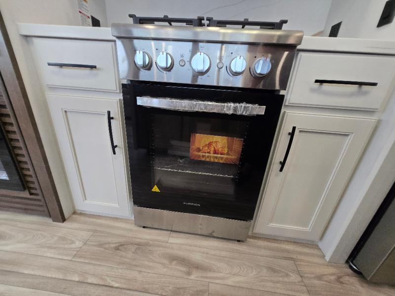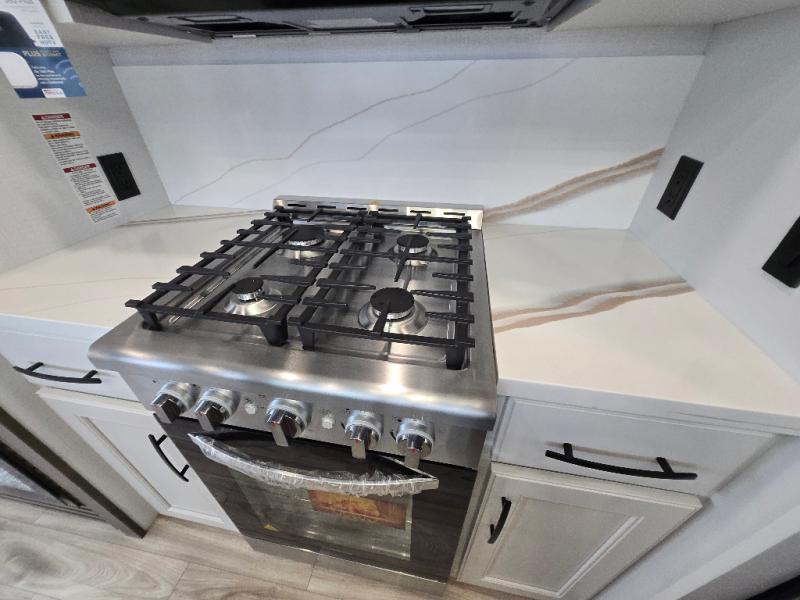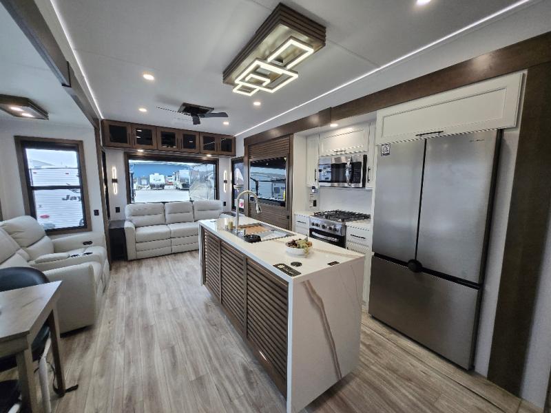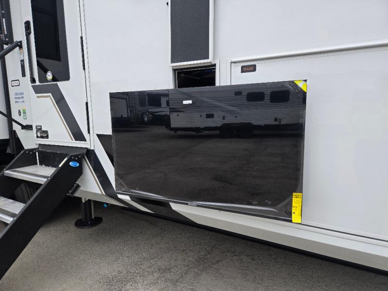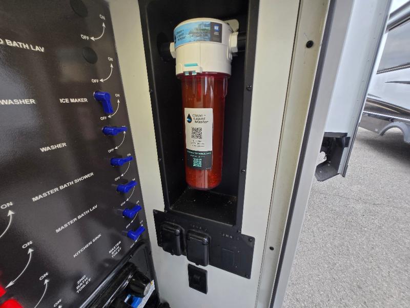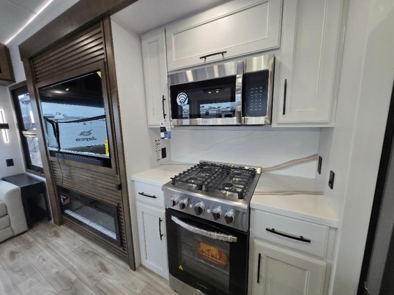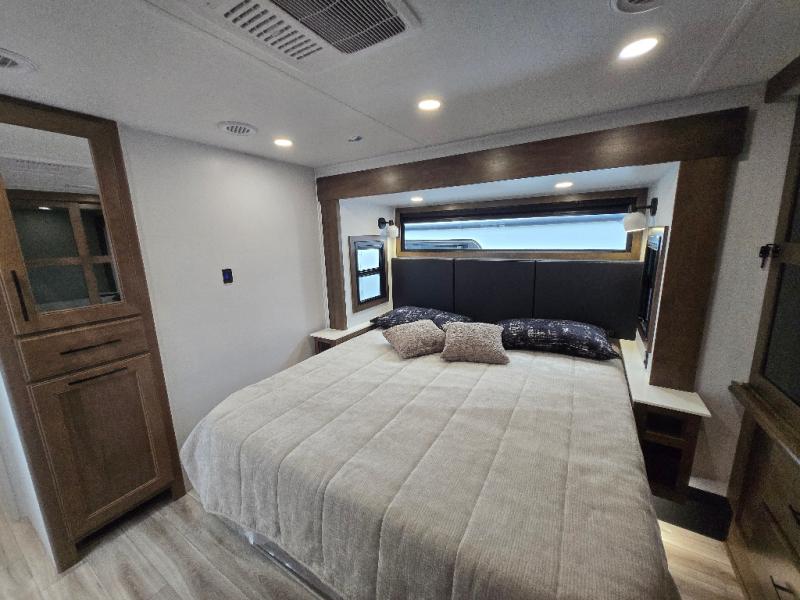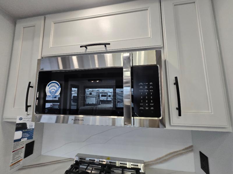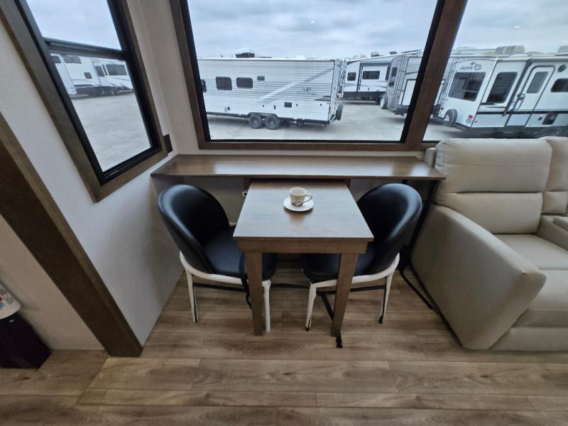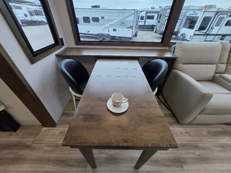 It won't be hard to find comfort in this fifth wheel with triple slides for more space, a spacious front bedroom, and a rear living area with a comfy sofa! Once you've unloaded the exterior pull-out storage tray, you can put out the two awnings, then relax in your camp chairs. A four-burner range inside will let you make lunch for your crew, and a spacious kitchen island will provide more counter space. There is also a pantry, overhead cabinets, plus a second, swing-out hidden pantry behind the entertainment center with a fireplace. The pull-out dinette, power theater seating, and rear sofa will give you plenty of seating options, and the dual opposing slides in the combined kitchen and living area will create an open floorplan you are sure to love. Head towards the front to freshen up in the spacious bath with ample counter space, then enjoy a perfect night's rest in the front bedroom, complete with a king bed slide, dual nightstands, front wardrobe, plus a second wardrobe with washer and dryer prep.
