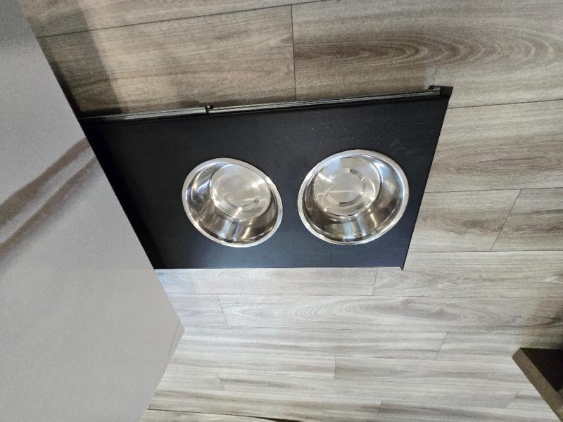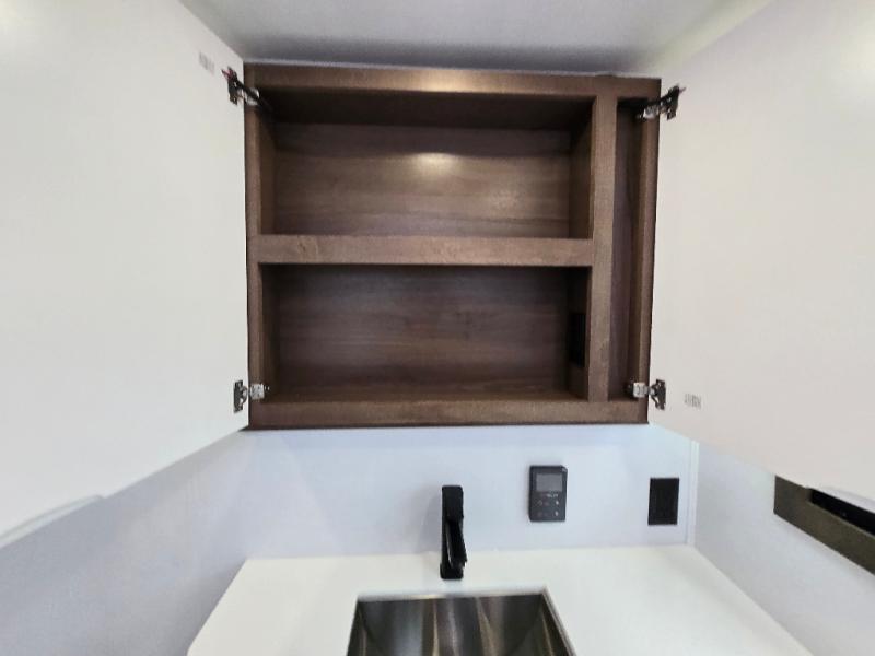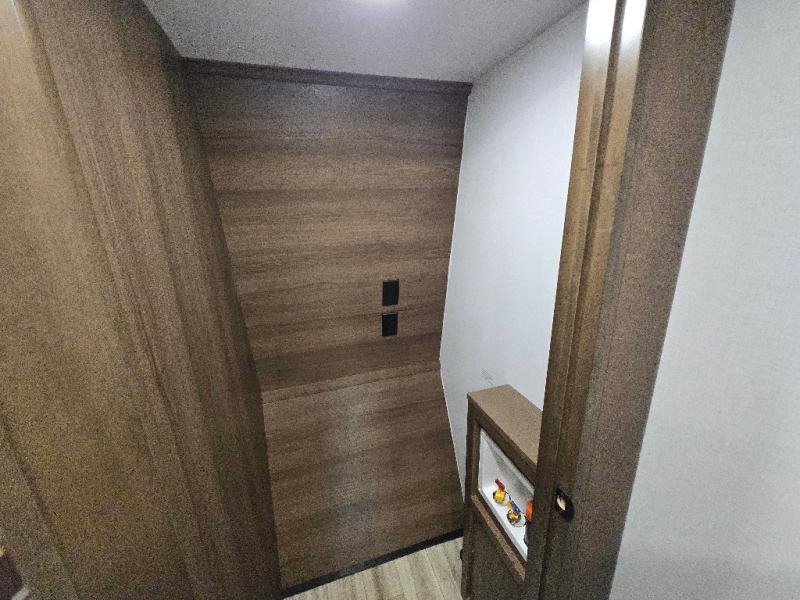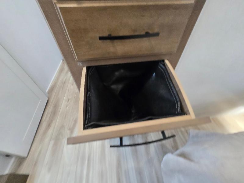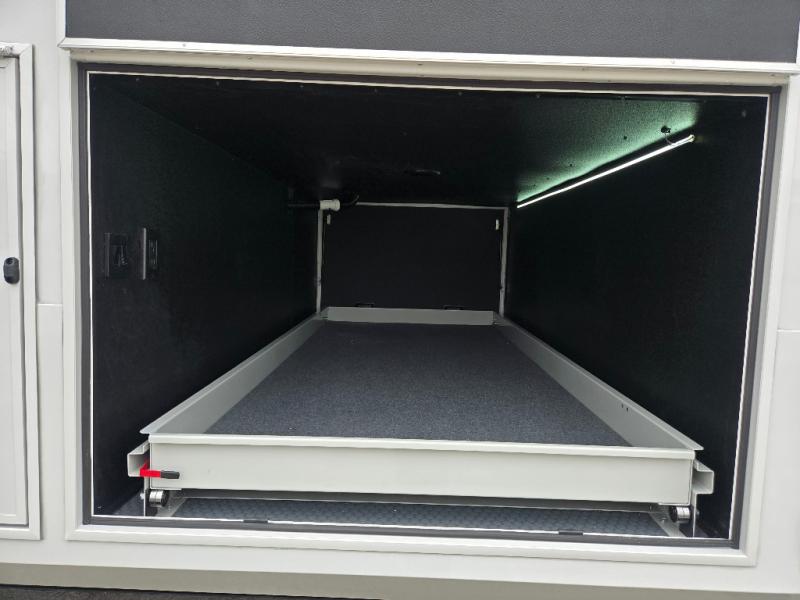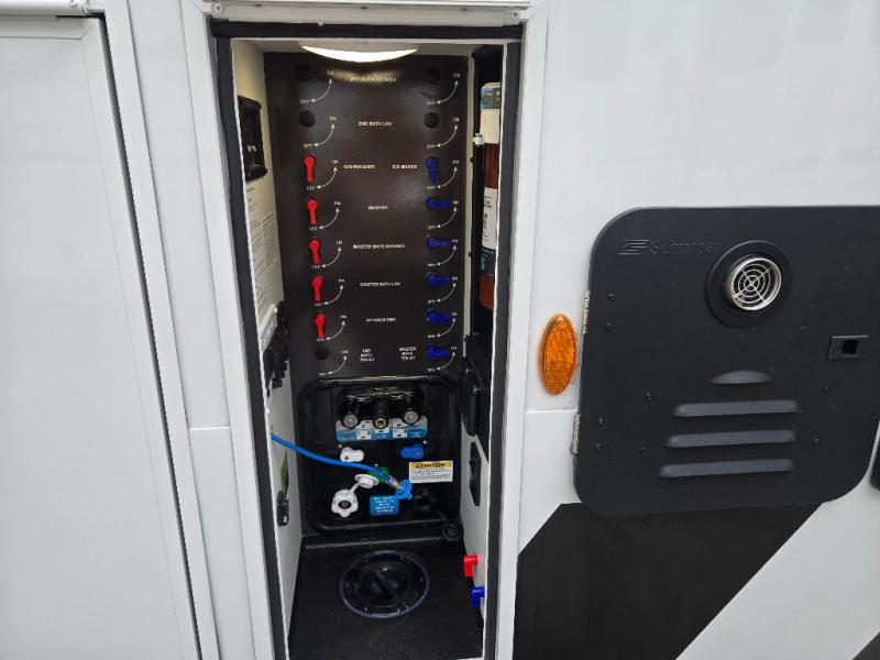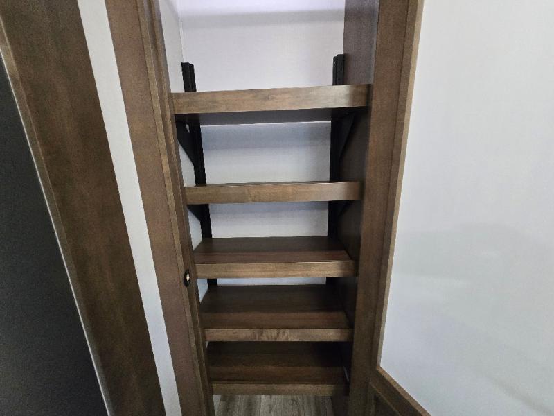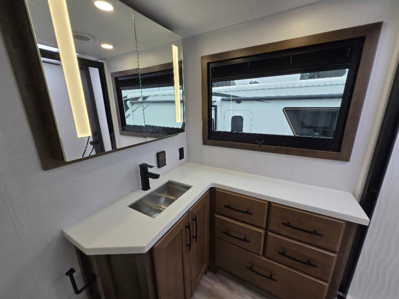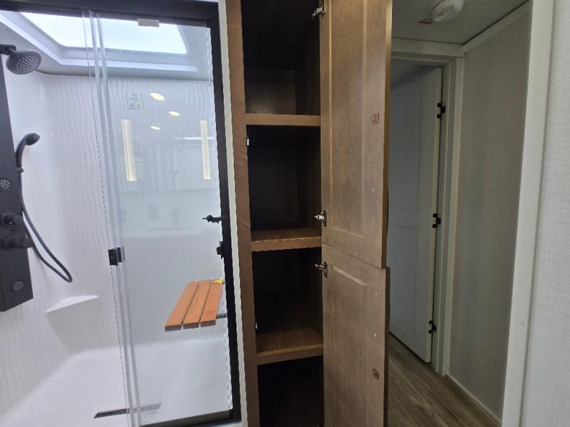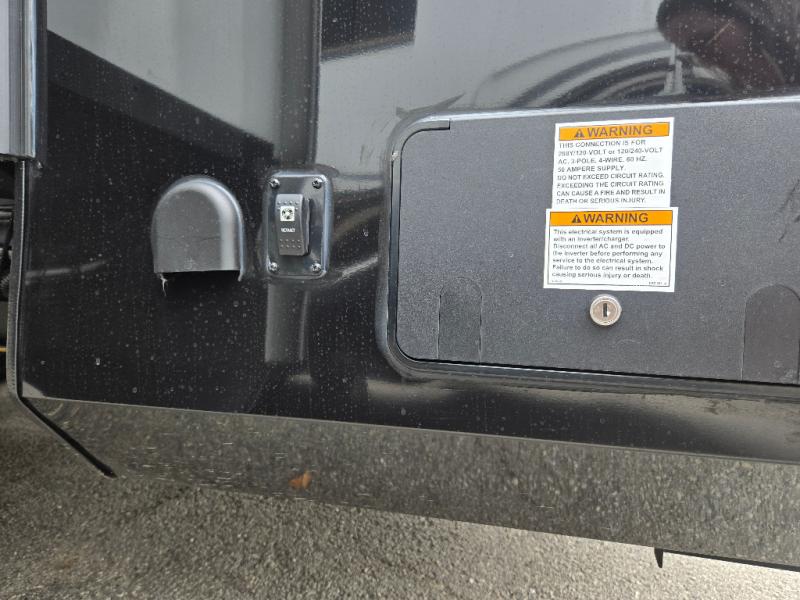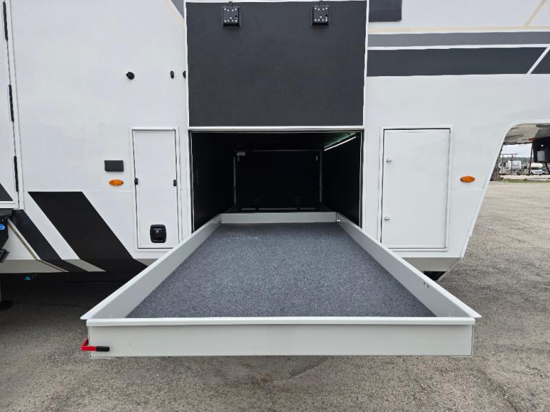 It won't be hard to find comfort in this fifth wheel with triple slides for more space, a spacious front bedroom, and a rear living area with a comfy sofa! Once you've unloaded the exterior pull-out storage tray, you can put out the two awnings, then relax in your camp chairs. A four-burner range inside will let you make lunch for your crew, and a spacious kitchen island will provide more counter space. There is also a pantry, overhead cabinets, plus a second, swing-out hidden pantry behind the entertainment center with a fireplace. The pull-out dinette, power theater seating, and rear sofa will give you plenty of seating options, and the dual opposing slides in the combined kitchen and living area will create an open floorplan you are sure to love. Head towards the front to freshen up in the spacious bath with ample counter space, then enjoy a perfect night's rest in the front bedroom, complete with a king bed slide, dual nightstands, front wardrobe, plus a second wardrobe with washer and dryer prep.