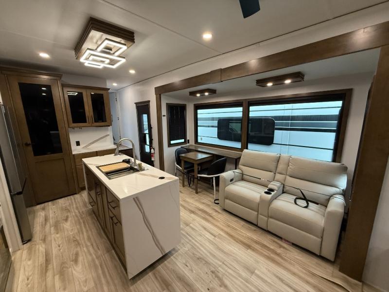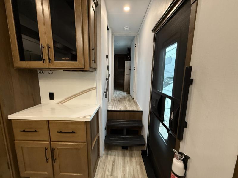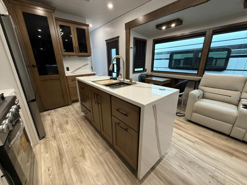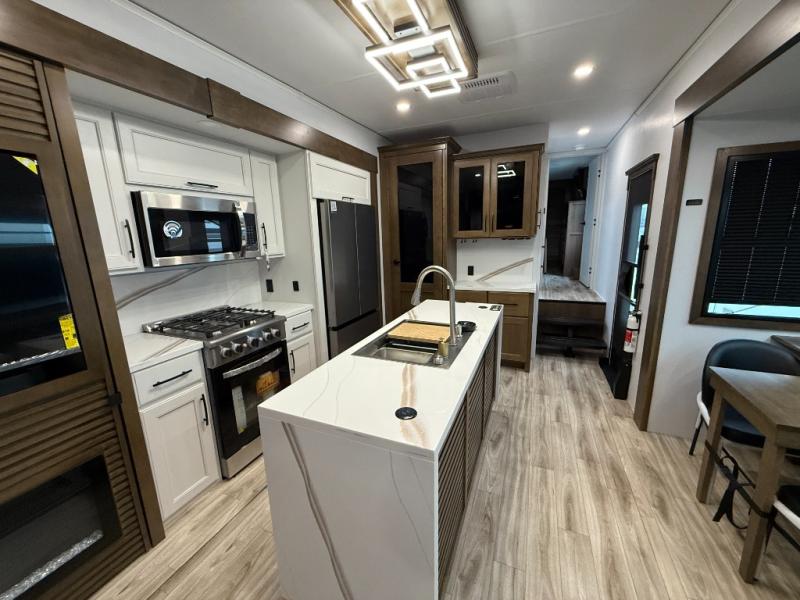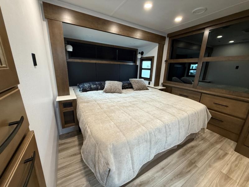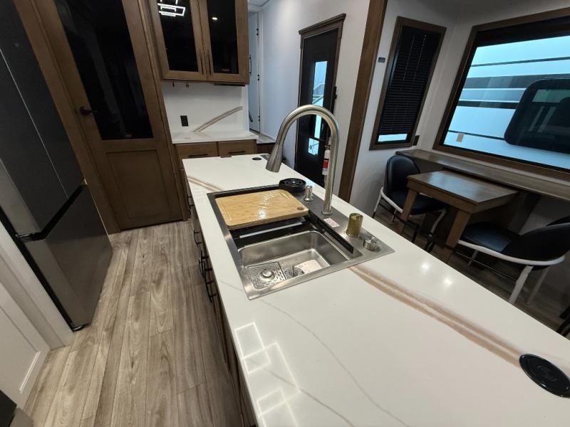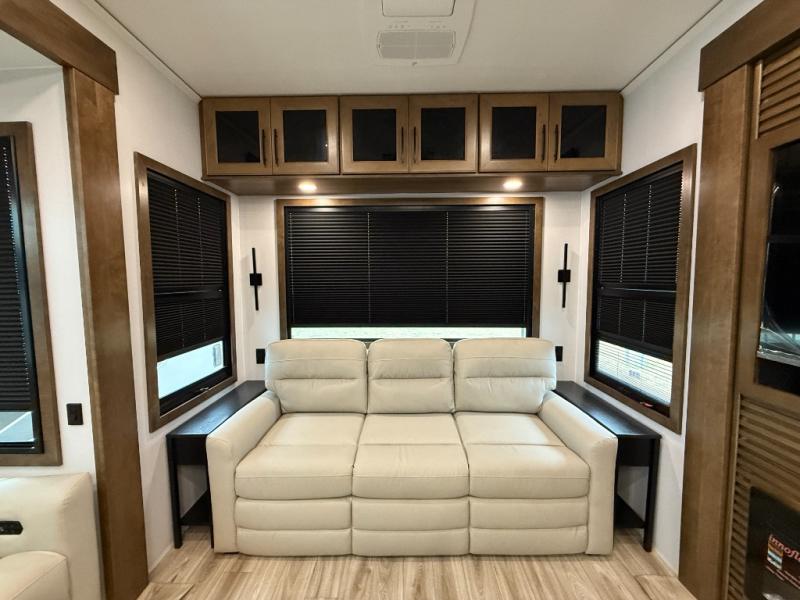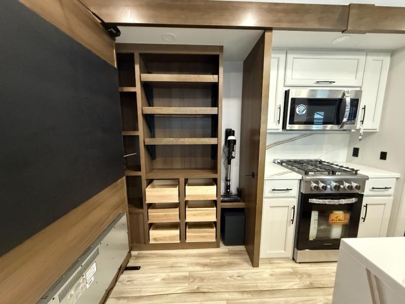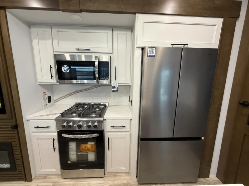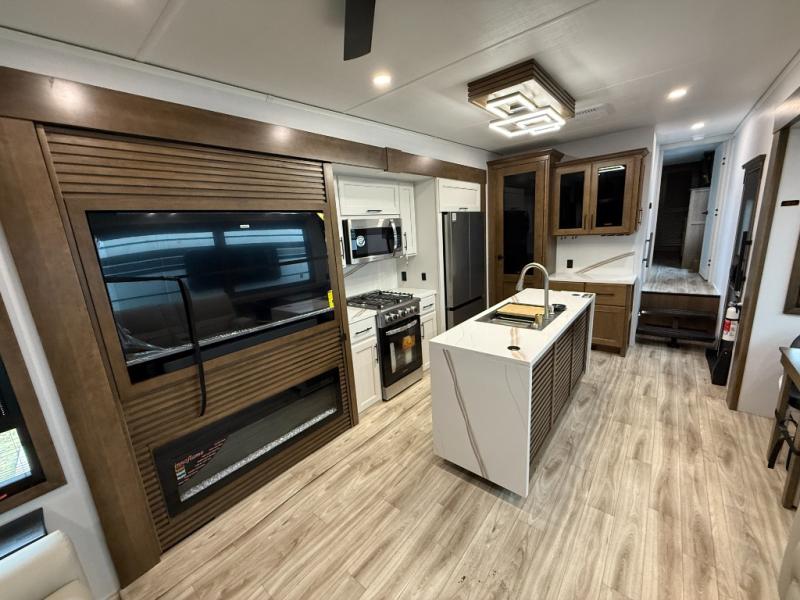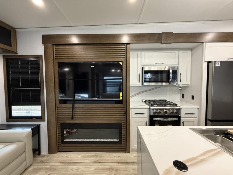 It won't be hard to find comfort in this fifth wheel with triple slides for more space, a spacious front bedroom, and a rear living area with a comfy sofa! Once you've unloaded the exterior pull-out storage tray, you can put out the two awnings, then relax in your camp chairs. A four-burner range inside will let you make lunch for your crew, and a spacious kitchen island will provide more counter space. There is also a pantry, overhead cabinets, plus a second, swing-out hidden pantry behind the entertainment center with a fireplace. The pull-out dinette, power theater seating, and rear sofa will give you plenty of seating options, and the dual opposing slides in the combined kitchen and living area will create an open floorplan you are sure to love. Head towards the front to freshen up in the spacious bath with ample counter space, then enjoy a perfect night's rest in the front bedroom, complete with a king bed slide, dual nightstands, front wardrobe, plus a second wardrobe with washer and dryer prep.