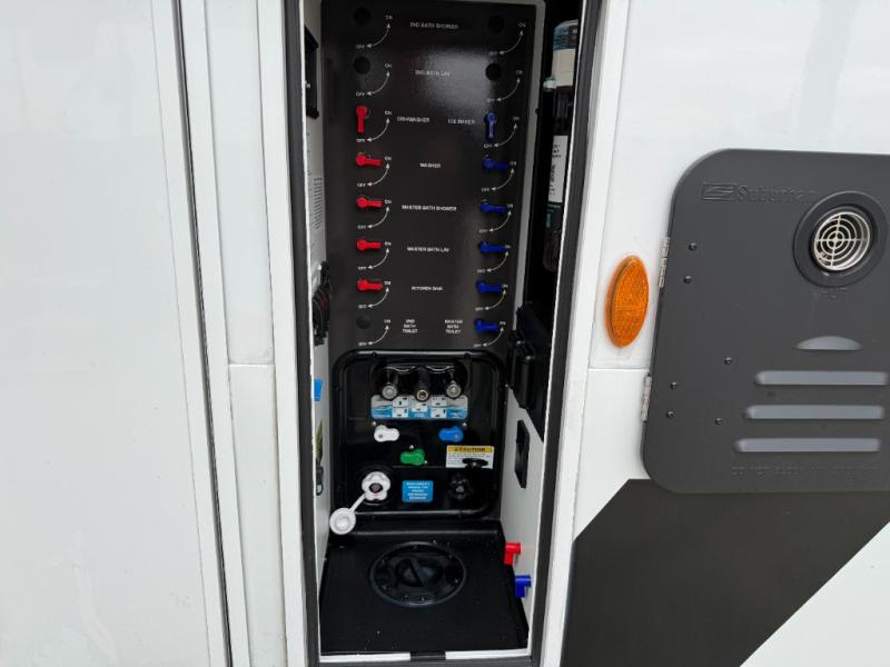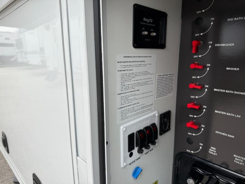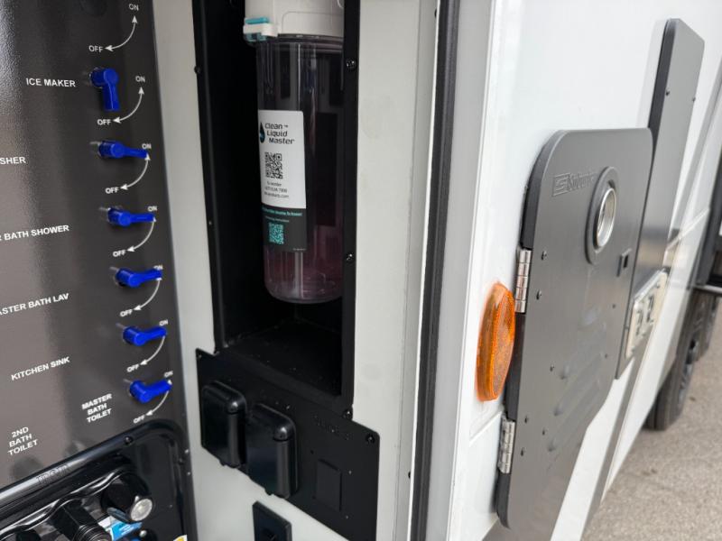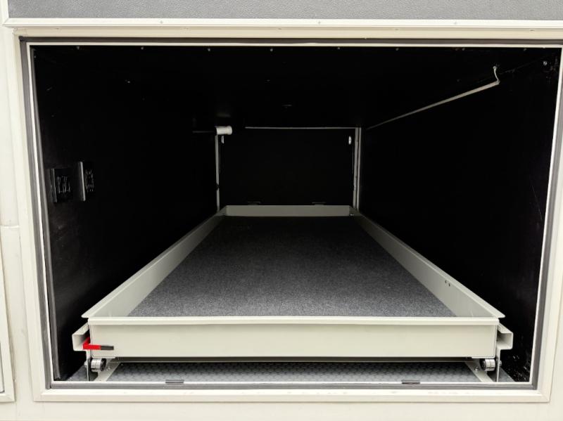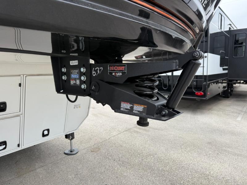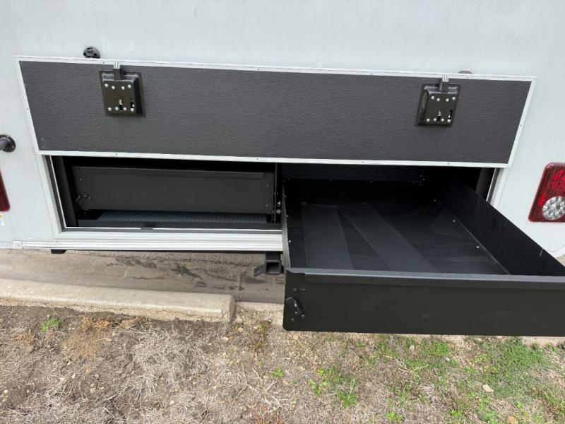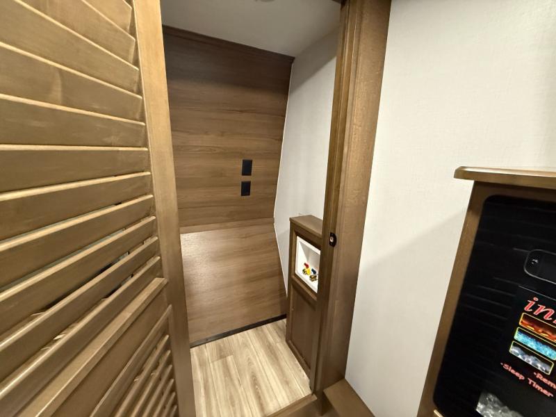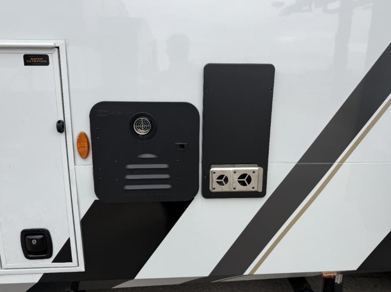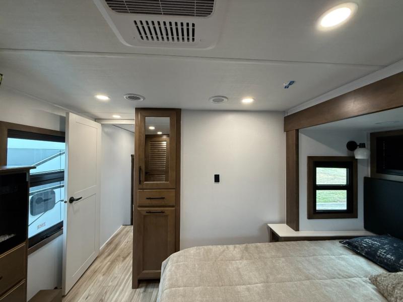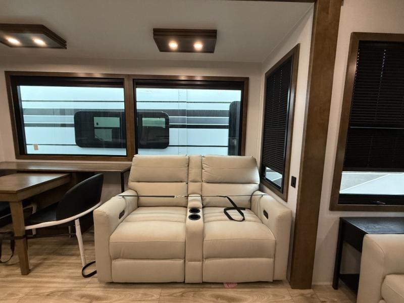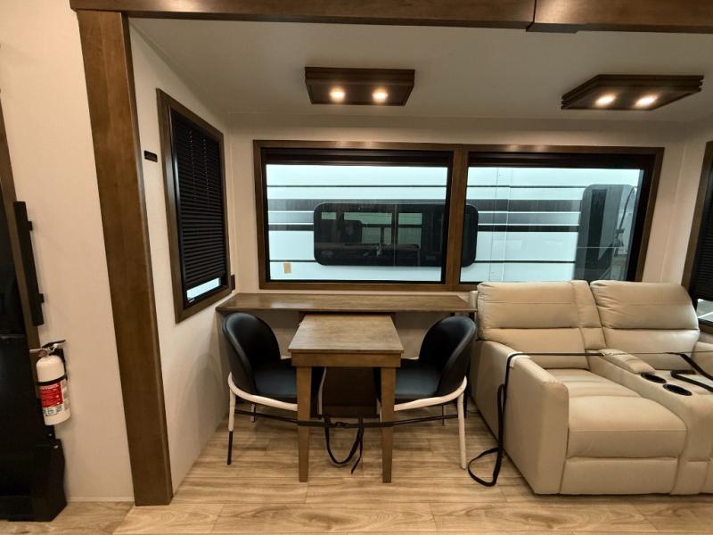It won't be hard to find comfort in this fifth wheel with triple slides for more space, a spacious front bedroom, and a rear living area with a comfy sofa! Once you've unloaded the exterior pull-out storage tray, you can put out the two awnings, then relax in your camp chairs. A four-burner range inside will let you make lunch for your crew, and a spacious kitchen island will provide more counter space. There is also a pantry, overhead cabinets, plus a second, swing-out hidden pantry behind the entertainment center with a fireplace. The pull-out dinette, power theater seating, and rear sofa will give you plenty of seating options, and the dual opposing slides in the combined kitchen and living area will create an open floorplan you are sure to love. Head towards the front to freshen up in the spacious bath with ample counter space, then enjoy a perfect night's rest in the front bedroom, complete with a king bed slide, dual nightstands, front wardrobe, plus a second wardrobe with washer and dryer prep.