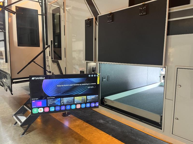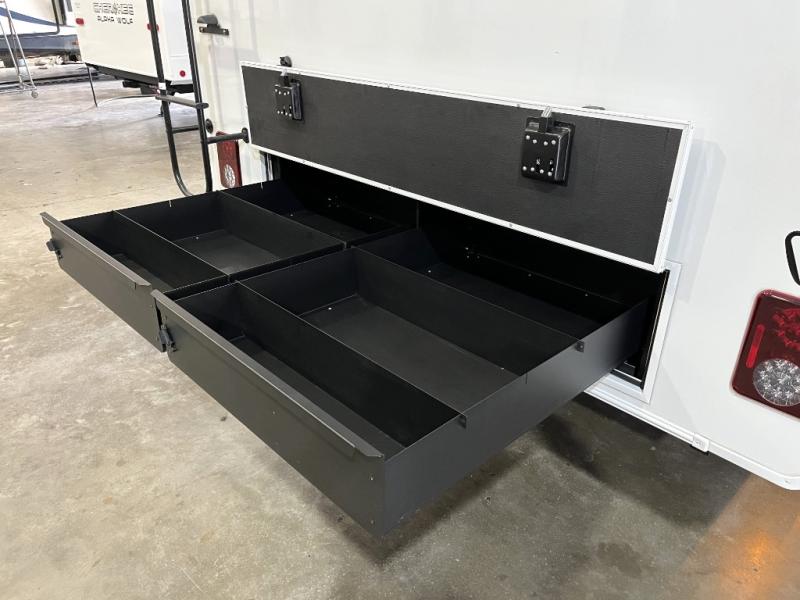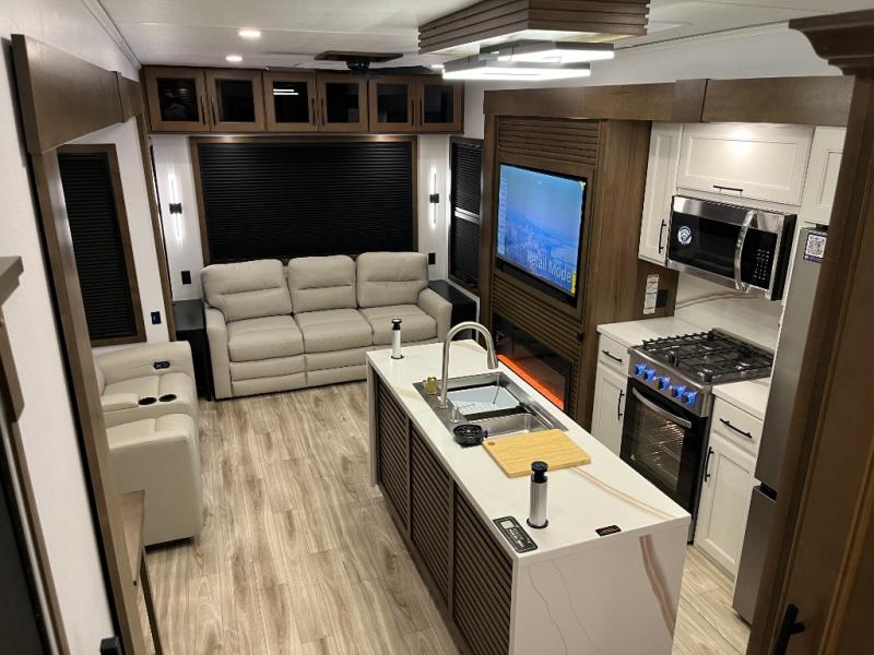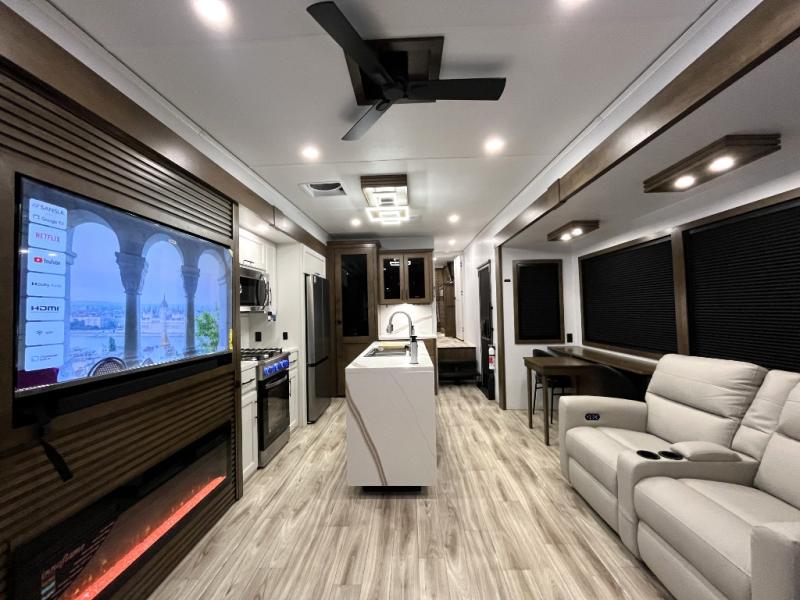 It won't be hard to find comfort in this fifth wheel with triple slides for more space, a spacious front bedroom, and a rear living area with a comfy sofa! Once you've unloaded the exterior pull-out storage tray, you can put out the two awnings, then relax in your camp chairs. A four-burner range inside will let you make lunch for your crew, and a spacious kitchen island will provide more counter space. There is also a pantry, overhead cabinets, plus a second, swing-out hidden pantry behind the entertainment center with a fireplace. The pull-out dinette, power theater seating, and rear sofa will give you plenty of seating options, and the dual opposing slides in the combined kitchen and living area will create an open floorplan you are sure to love. Head towards the front to freshen up in the spacious bath with ample counter space, then enjoy a perfect night's rest in the front bedroom, complete with a king bed slide, dual nightstands, front wardrobe, plus a second wardrobe with washer and dryer prep.