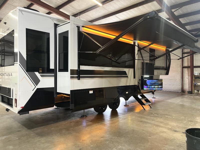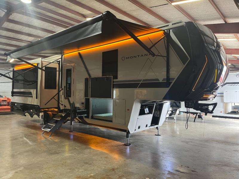 Enjoy luxury, innovation, and the outdoors in any one of Montana's finest fifth wheels. Each set the standard with exceptional features, and exciting factory installed options to provide you a great home on the road. Keystone's 12" I-beam chassis with z-frame technology provides a strong and durable foundation to your fifth wheel, and the four-season living package will help extend your camping season. There are also square frameless windows outside, along with storage solutions, and a hydraulic leveling system that will have you set up in no-time! Inside, you'll love the hardwood cabinetry, solid surface countertops, spacious showers, and cozy bedrooms!