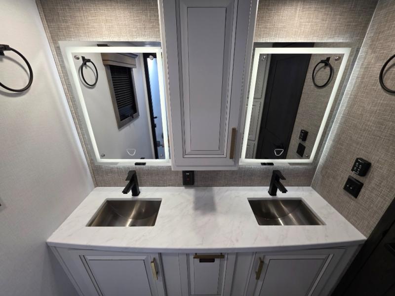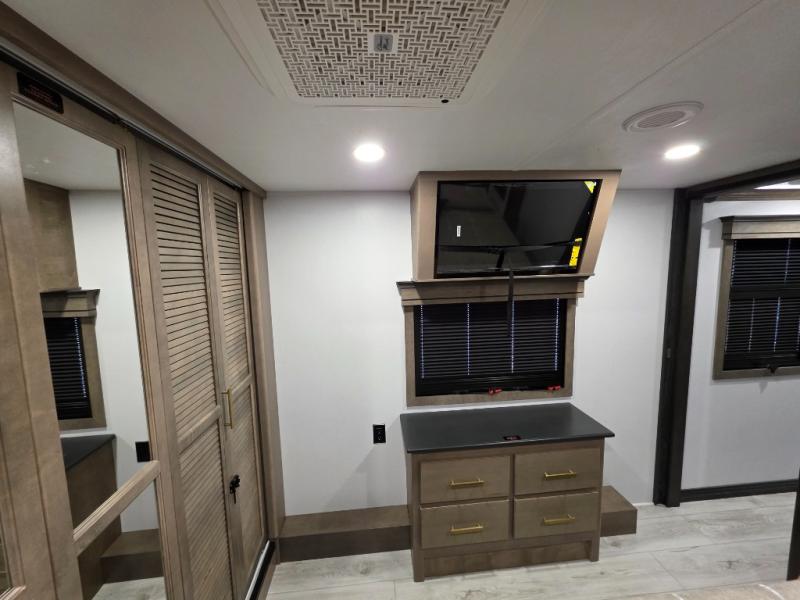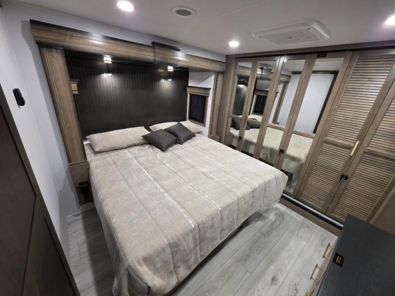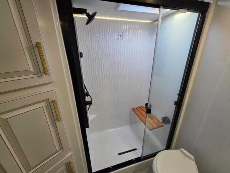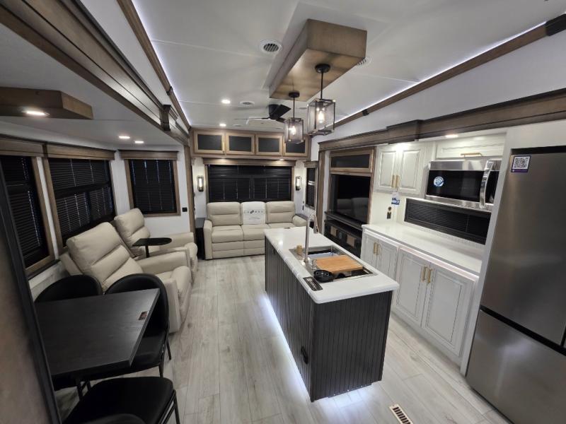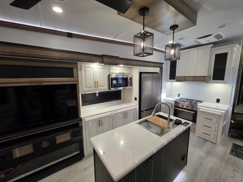 Luxury abounds throughout this fifth wheel! Starting in the kitchen with the island, two pull out pantries with extra countertop space above it, a 24" range with hidden storage, and a pull out countertop for more prepping space. The full bathroom has a 48" x 30" fiberglass shower with a seat, decorative glass enclosure, and skylight above it for more natural lighting as two get ready at once with the dual sink vanity. Sleep like a baby in the front private bedroom on the king bed slide with storage underneath and keep your clothes looking their best with two closets and additional storage. The rear living area offers true relaxation with a hide-a-bed sofa and residential power recliners across from the entertainment center with a 5,000 BTU decorative fireplace heater and 50" Smart TV to watch your favorite movies!