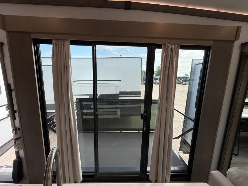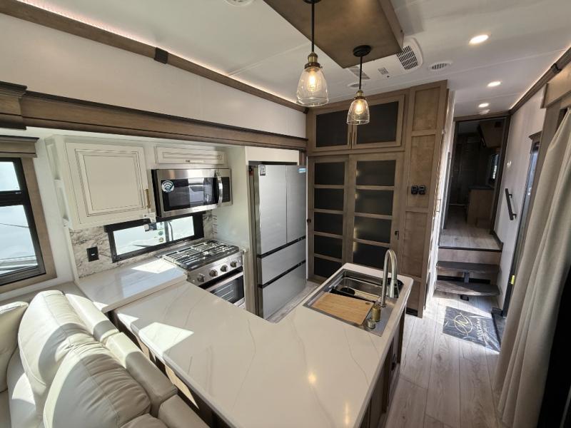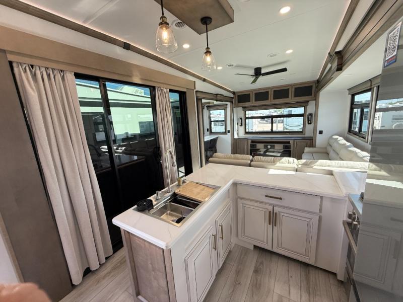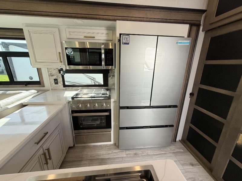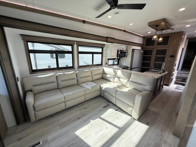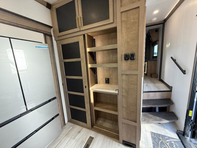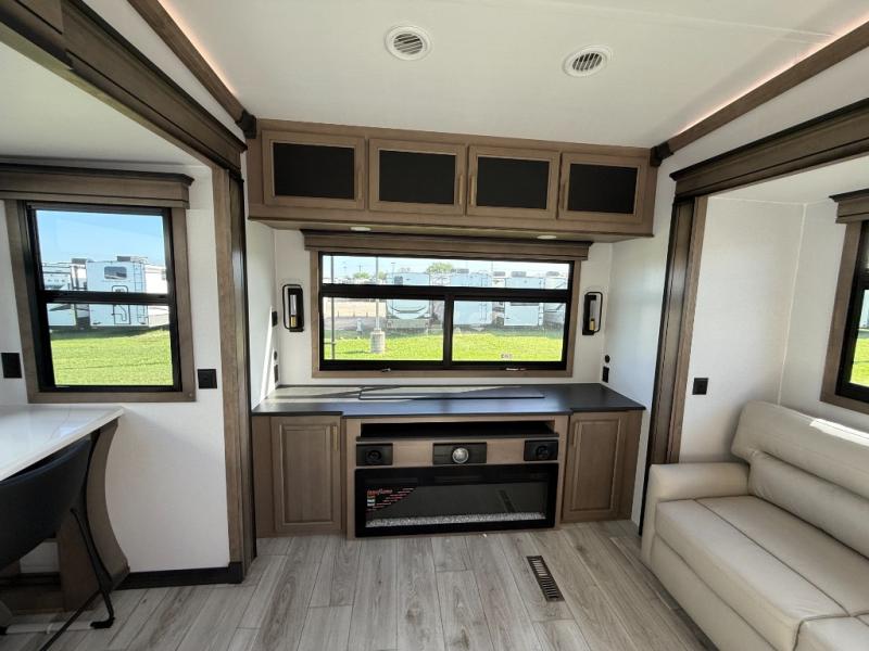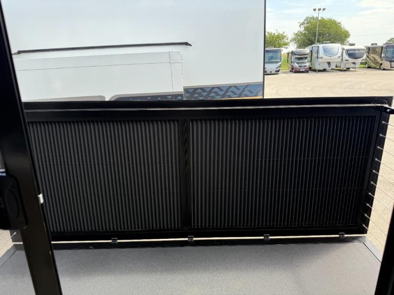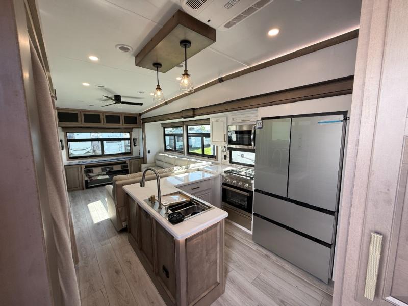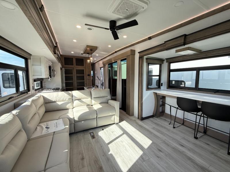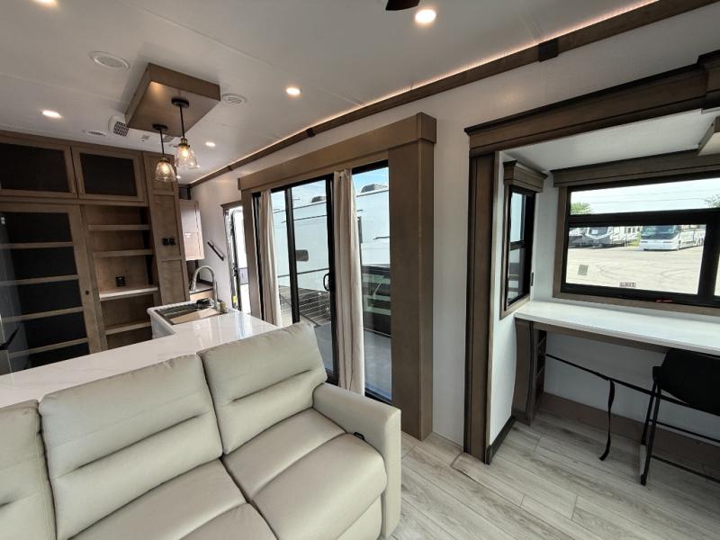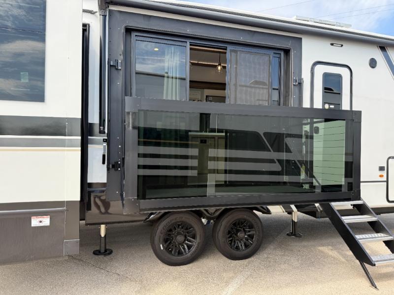 Luxury abounds throughout this fifth wheel starting in the centrally located kitchen featuring an L-shaped counter, a pull down storage pantry, a 24" range with an overhead convection microwave, and an 18 cu. ft. residential refrigerator with ice an maker. Just up the steps to the right of the entry, you will find a spacious bathroom featuring a 48" x 30" fiberglass shower with a seat, decorative glass enclosure, linen cabinet, and skylight above it for more natural lighting. Sleep like a baby in the front private bedroom on the king bed slide with storage underneath, and keep your clothes looking their best with the front closets. The rear entertainment living area offers true relaxation with L-shaped seating including a hide-a-bed sofa along the roadside, and powered theater seating facing the entertainment center with a 5,000 BTU decorative fireplace heater and Smart TV to watch your favorite movies! And don't overlook the best part, the powered side patio to entertain guests!