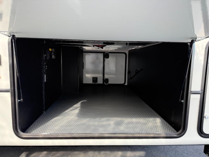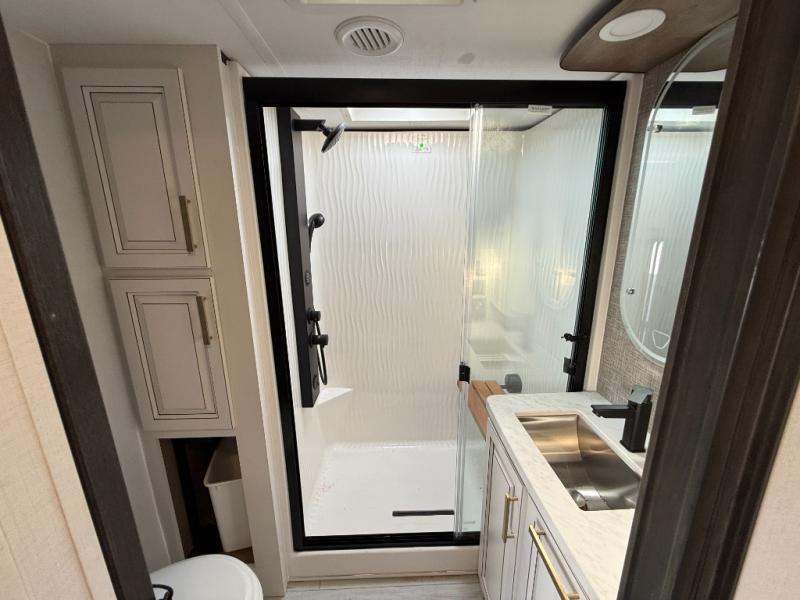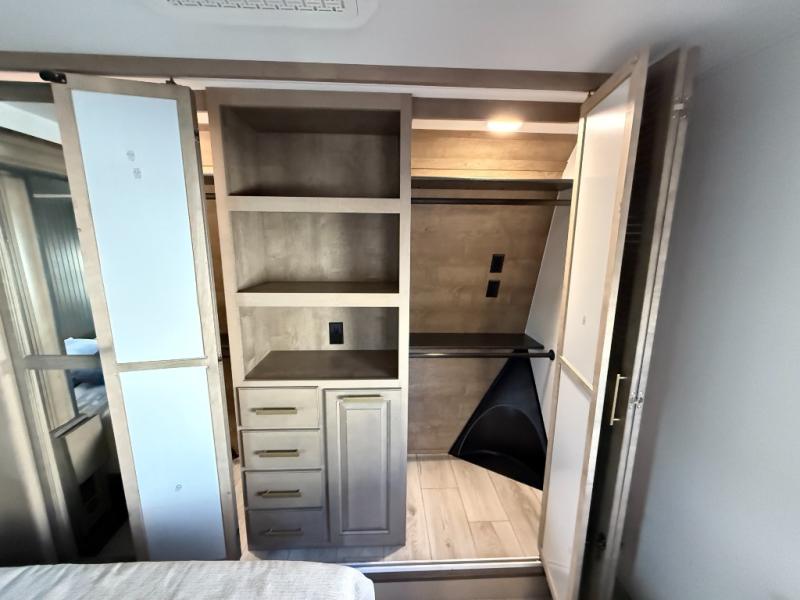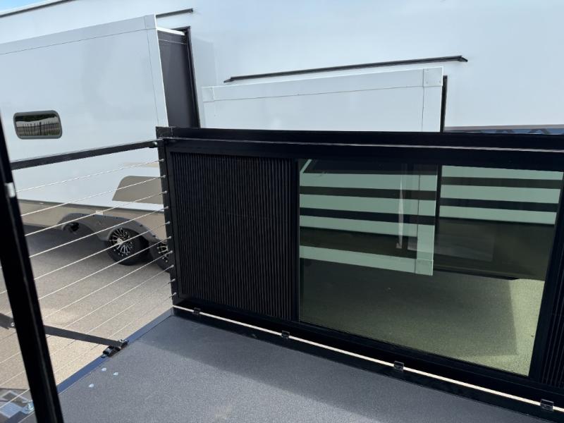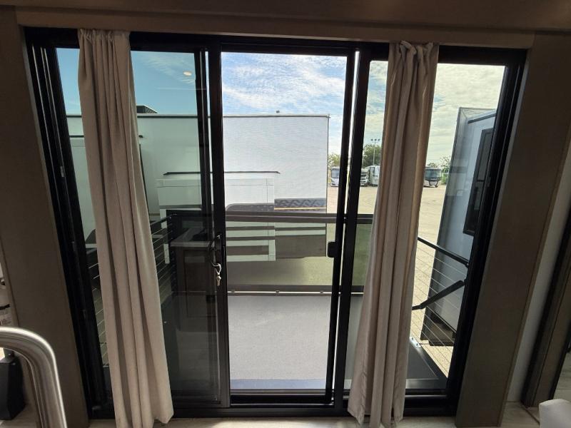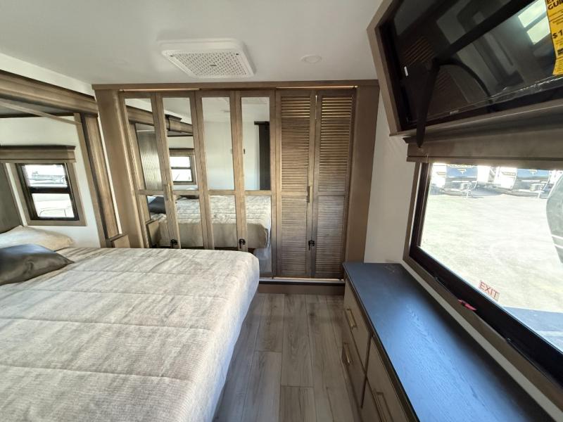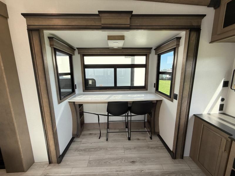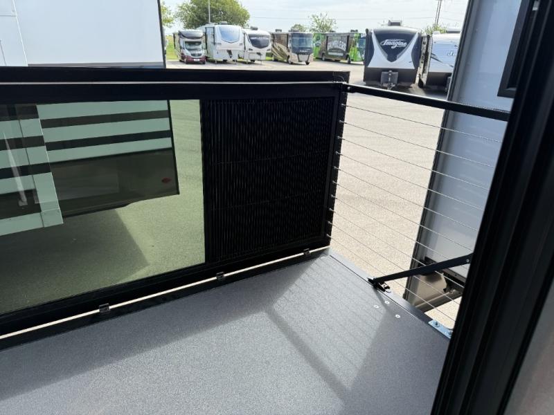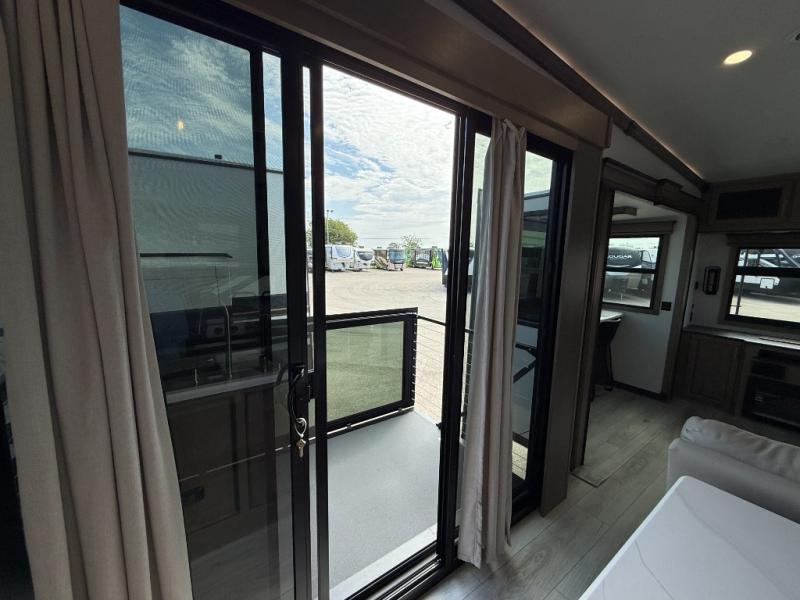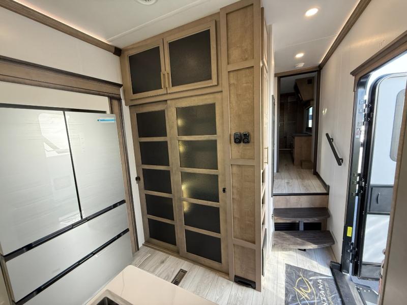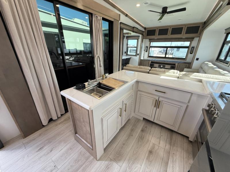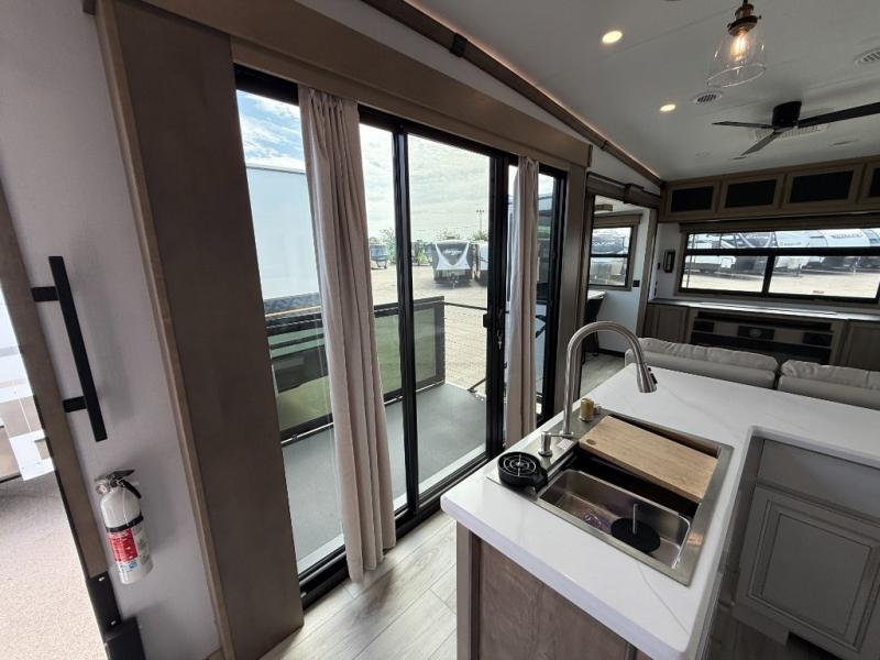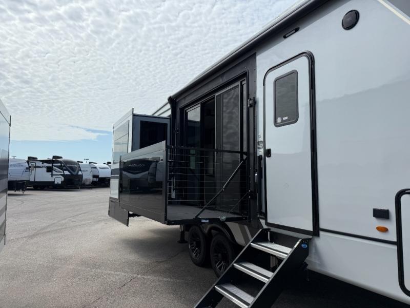 Luxury abounds throughout this fifth wheel starting in the centrally located kitchen featuring an L-shaped counter, a pull down storage pantry, a 24" range with an overhead convection microwave, and an 18 cu. ft. residential refrigerator with ice an maker. Just up the steps to the right of the entry, you will find a spacious bathroom featuring a 48" x 30" fiberglass shower with a seat, decorative glass enclosure, linen cabinet, and skylight above it for more natural lighting. Sleep like a baby in the front private bedroom on the king bed slide with storage underneath, and keep your clothes looking their best with the front closets. The rear entertainment living area offers true relaxation with L-shaped seating including a hide-a-bed sofa along the roadside, and powered theater seating facing the entertainment center with a 5,000 BTU decorative fireplace heater and Smart TV to watch your favorite movies! And don't overlook the best part, the powered side patio to entertain guests!