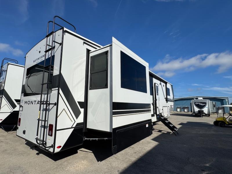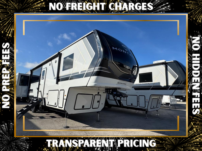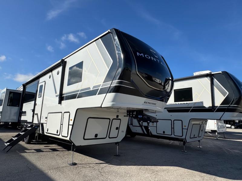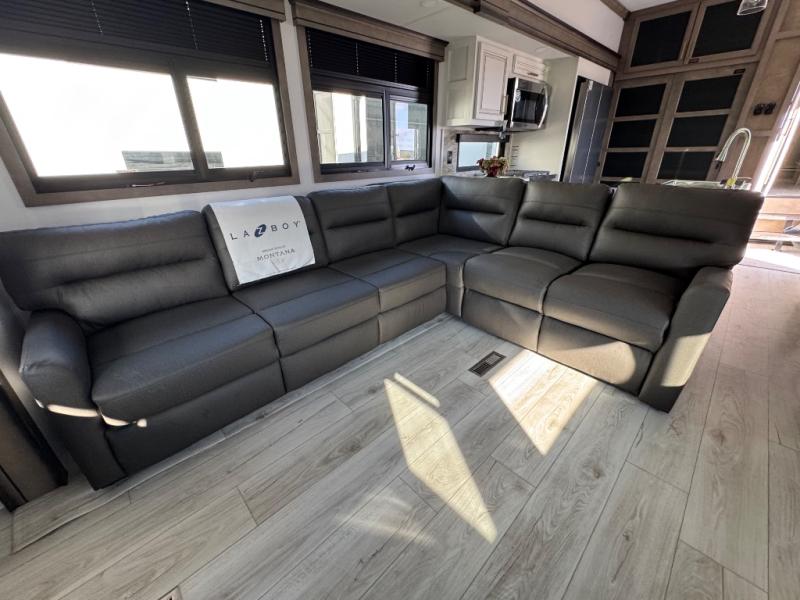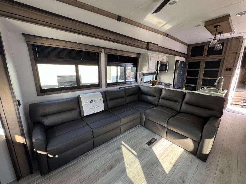 Enjoy luxury, innovation, and the outdoors in any one of Montana's finest fifth wheels. Each set the standard with exceptional features, and exciting factory installed options to provide you a great home on the road. Keystone's 12" I-beam chassis with z-frame technology provides a strong and durable foundation to your fifth wheel, and the four season living package will help extend your camping season. A few other construction features you will appreciate include a MORryde CRE3000 suspension, a fully walkable roof with an alpha seamless TPO membrane system, and 4k square frameless tinted safety glass windows. Each feature stylish interiors with two decor choices paired with beautiful hardwood cabinetry, Beauflor vinyl flooring throughout, central vacuum, plus a La-Z-Boy furniture package for all-around comfort!
