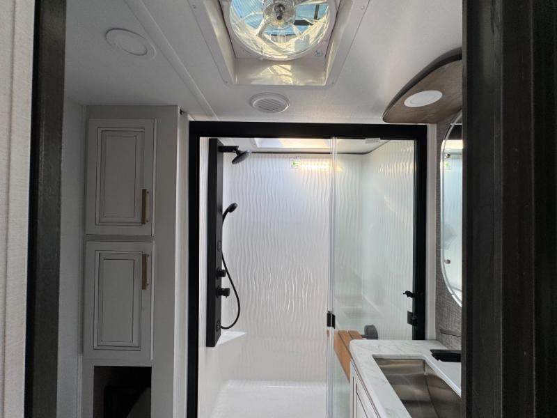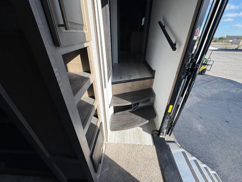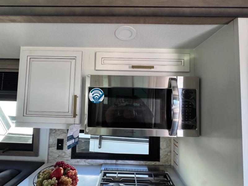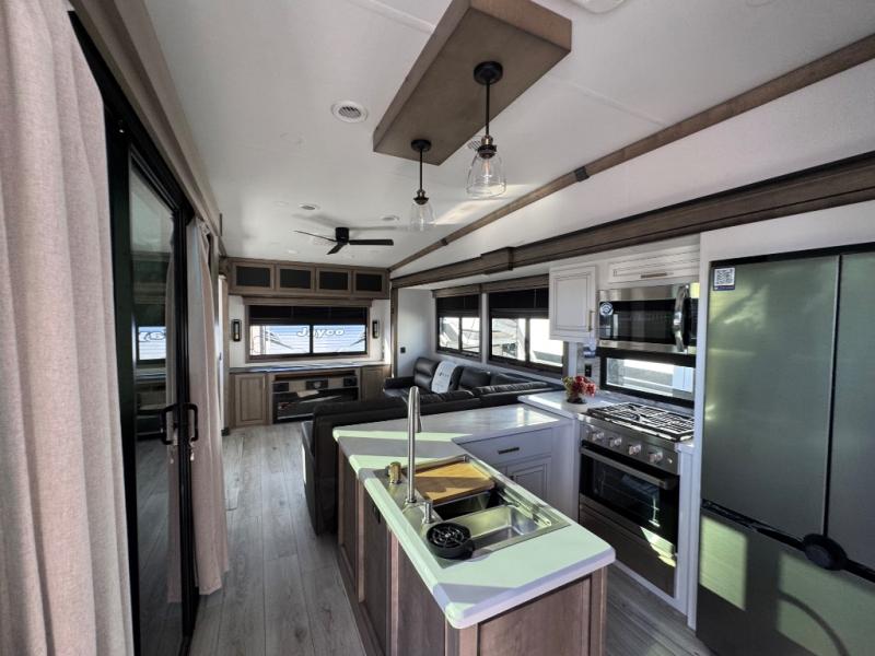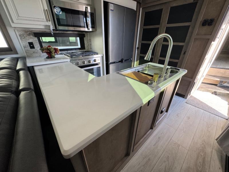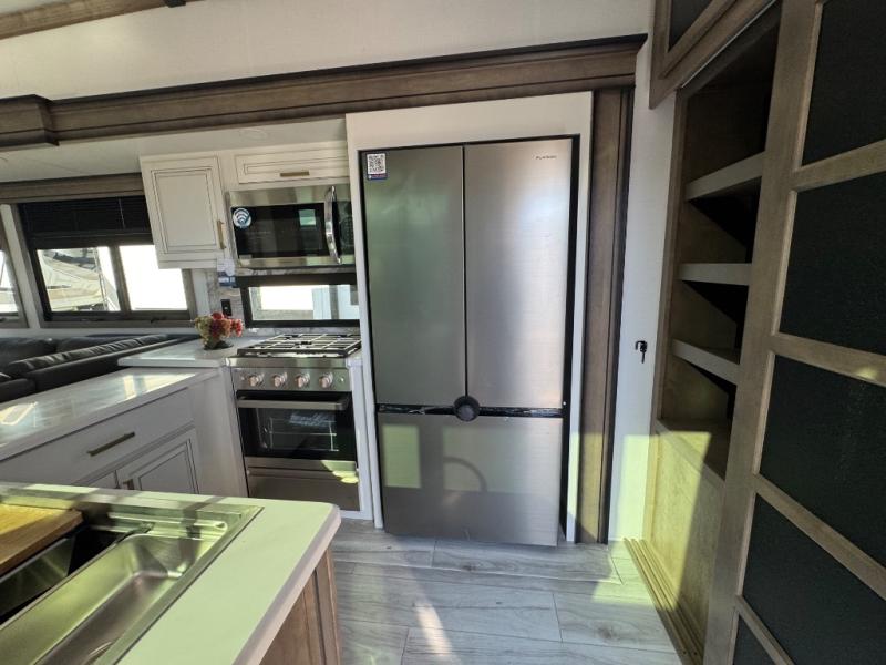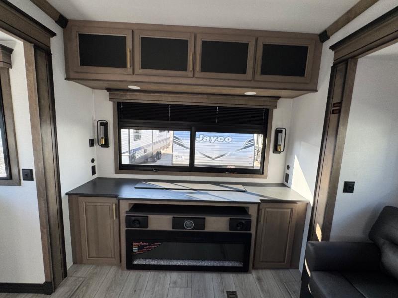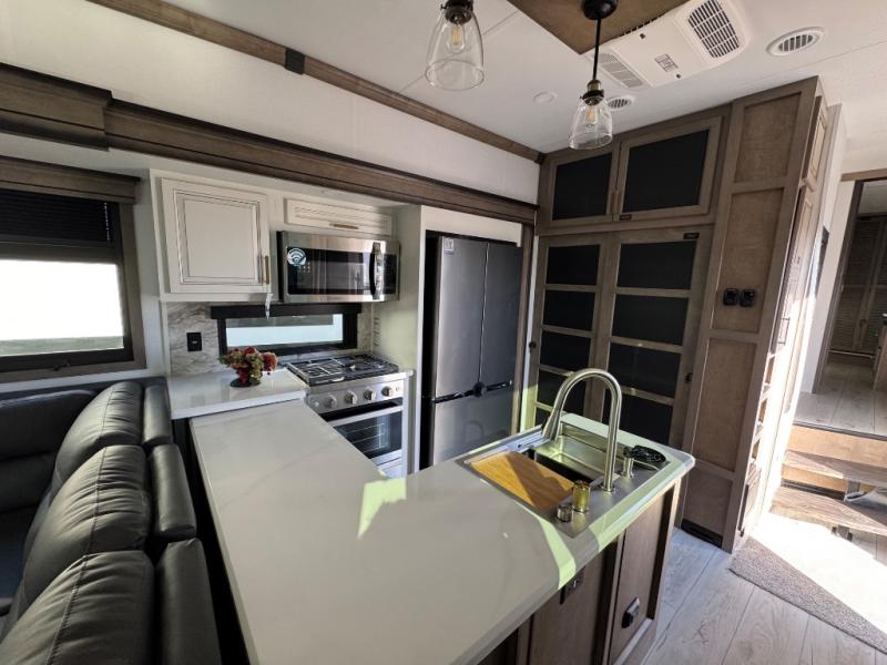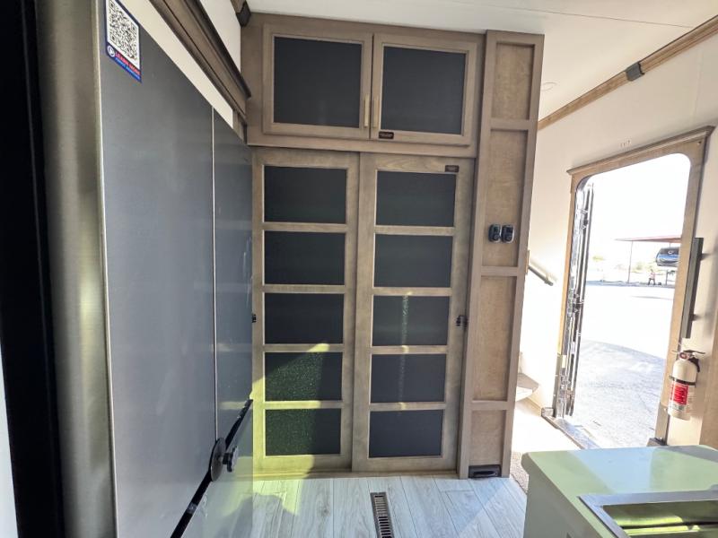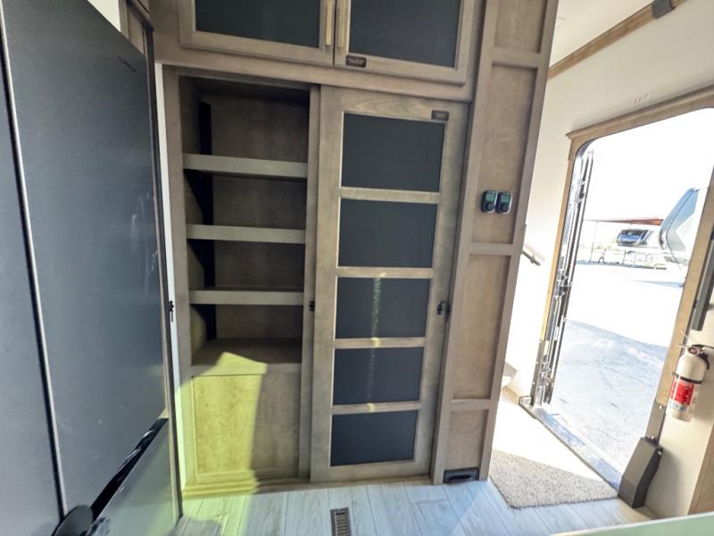 Luxury abounds throughout this fifth wheel starting in the centrally located kitchen featuring an L-shaped counter, a pull down storage pantry, a 24" range with an overhead convection microwave, and an 18 cu. ft. residential refrigerator with ice an maker. Just up the steps to the right of the entry, you will find a spacious bathroom featuring a 48" x 30" fiberglass shower with a seat, decorative glass enclosure, linen cabinet, and skylight above it for more natural lighting. Sleep like a baby in the front private bedroom on the king bed slide with storage underneath, and keep your clothes looking their best with the front closets. The rear entertainment living area offers true relaxation with L-shaped seating including a hide-a-bed sofa along the roadside, and powered theater seating facing the entertainment center with a 5,000 BTU decorative fireplace heater and Smart TV to watch your favorite movies! And don't overlook the best part, the powered side patio to entertain guests!