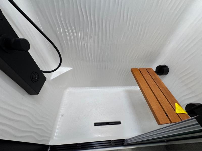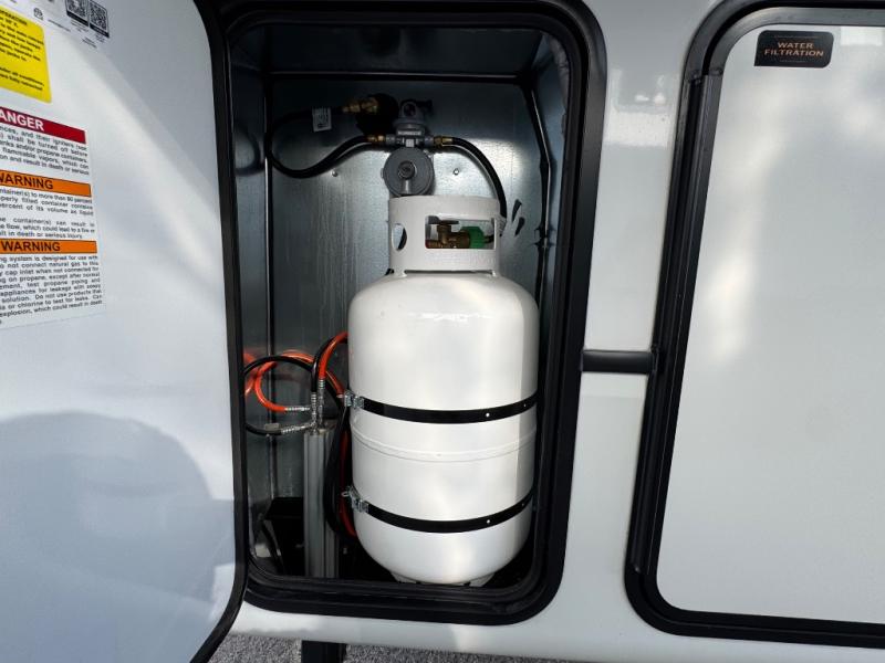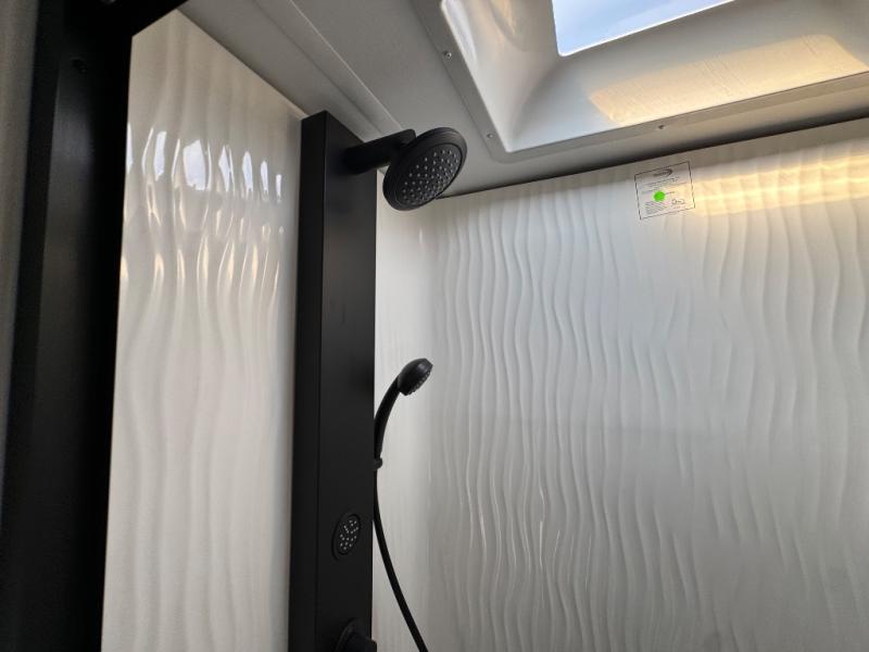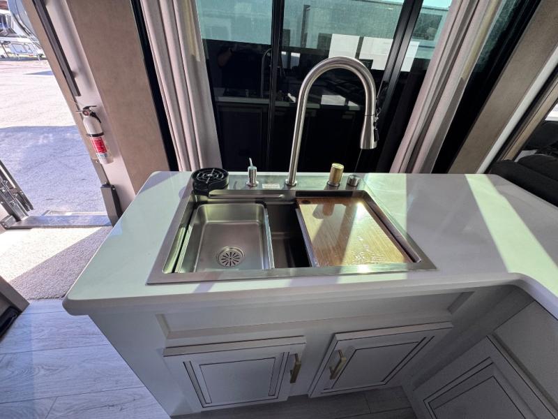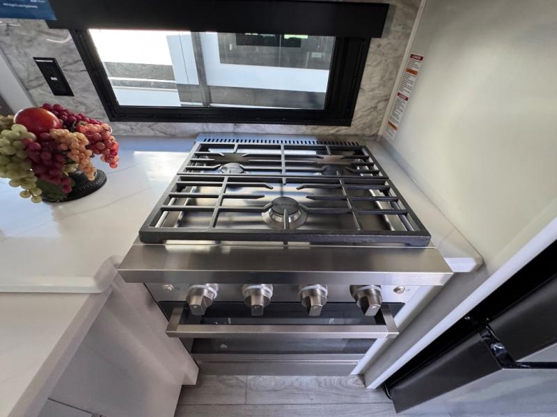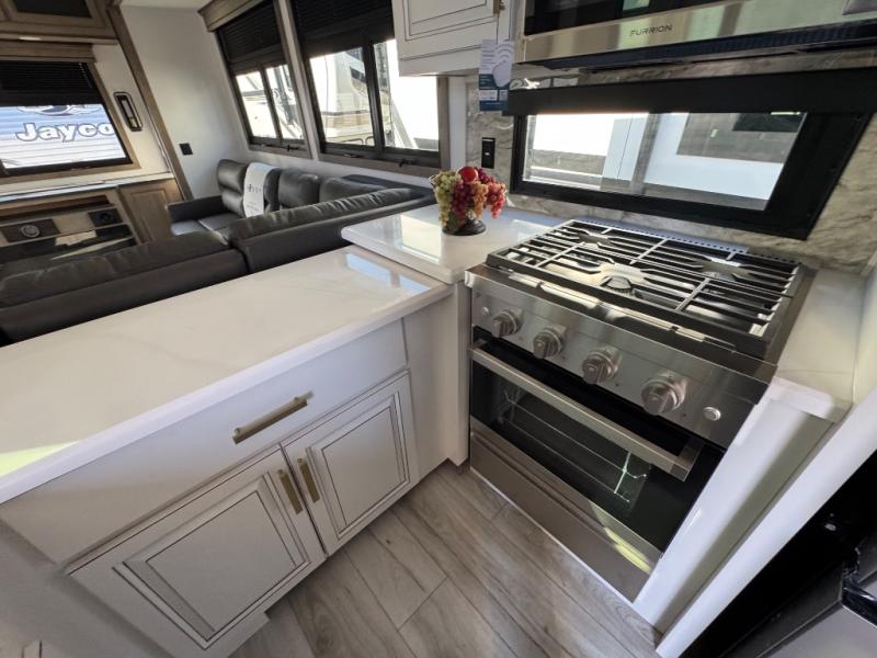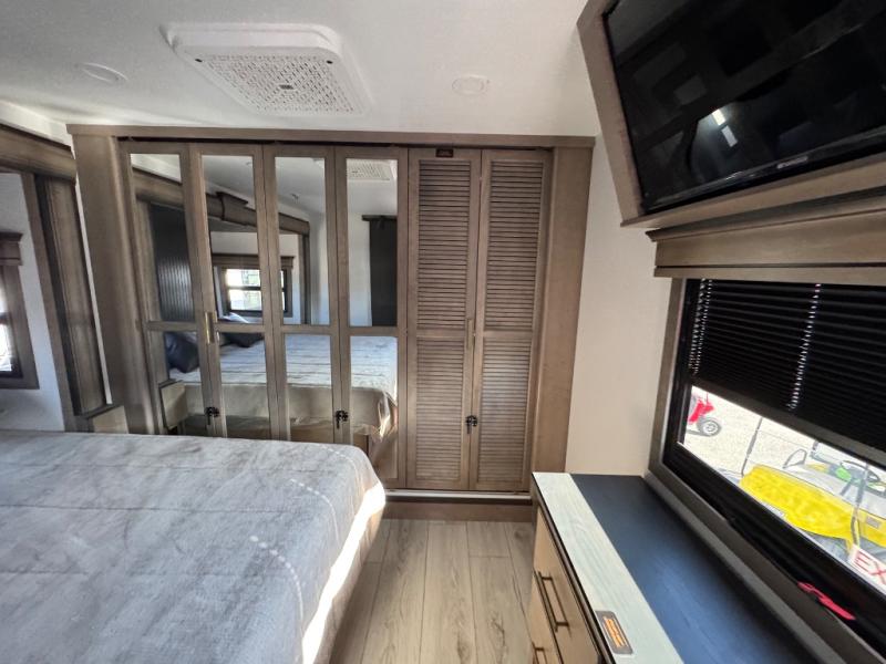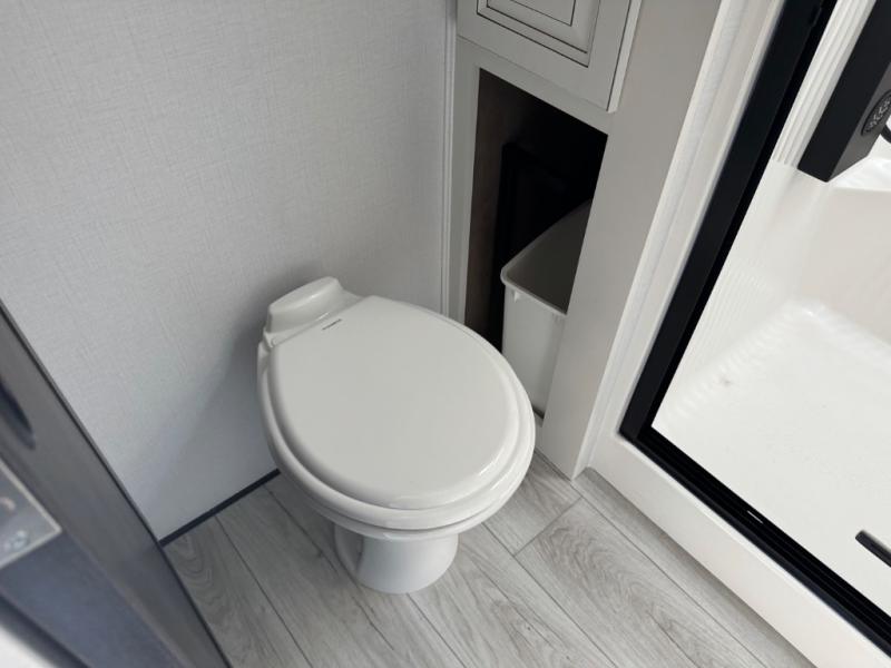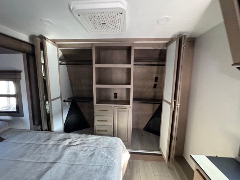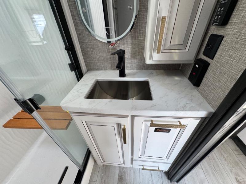 Luxury abounds throughout this fifth wheel starting in the centrally located kitchen featuring an L-shaped counter, a pull down storage pantry, a 24" range with an overhead convection microwave, and an 18 cu. ft. residential refrigerator with ice an maker. Just up the steps to the right of the entry, you will find a spacious bathroom featuring a 48" x 30" fiberglass shower with a seat, decorative glass enclosure, linen cabinet, and skylight above it for more natural lighting. Sleep like a baby in the front private bedroom on the king bed slide with storage underneath, and keep your clothes looking their best with the front closets. The rear entertainment living area offers true relaxation with L-shaped seating including a hide-a-bed sofa along the roadside, and powered theater seating facing the entertainment center with a 5,000 BTU decorative fireplace heater and Smart TV to watch your favorite movies! And don't overlook the best part, the powered side patio to entertain guests!