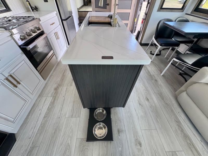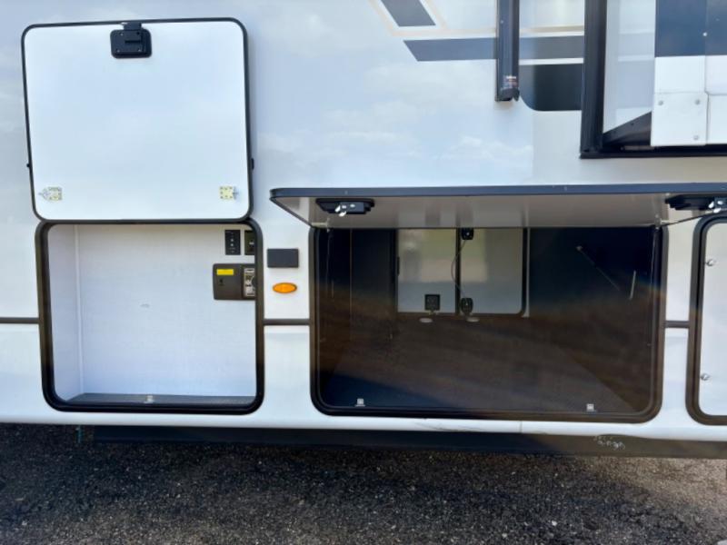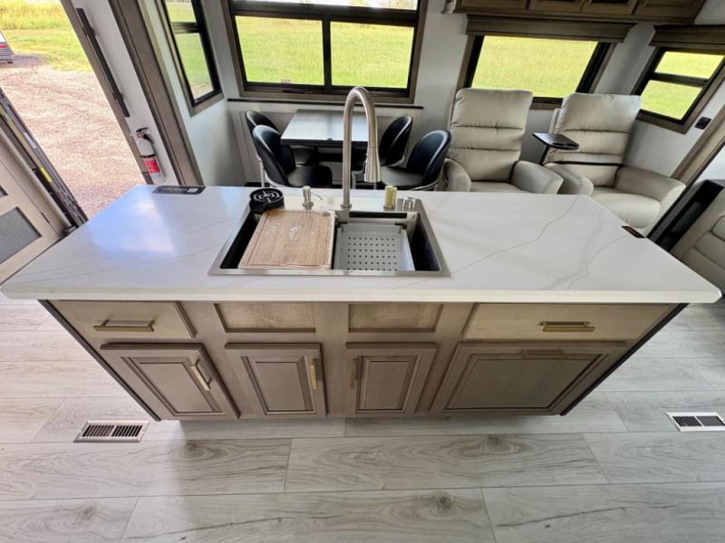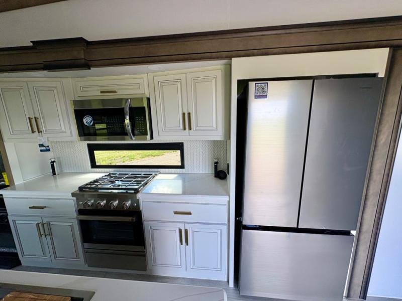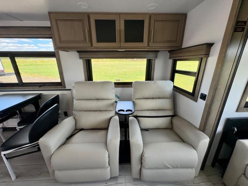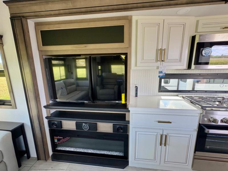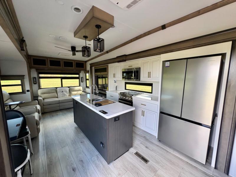 Enjoy a home away from home with this fifth wheel! The front private bedroom has a king bed slide with storage underneath across from a 32" Smart HDTV with drawers below it, a large front closet, and a sliding door to close it all off. Freshen up each morning in the full bathroom with the 48" x 30" fiberglass shower with a seat and skylight above for more natural lighting as you get ready at the dual sink vanity. The kitchen has everything you need to prepare your best meals including extra countertop space on the kitchen island and even a closet with washer/dryer prep so you can quickly grab a clean dish towel. Enjoy your meals at the pivot dinette and then relax on the rear hide-a-bed sofa or the residential power recliners across from the entertainment center with a 5,000 BTU decorative fireplace heater. There is even a 50" Smart HDTV to watch your favorite movies!