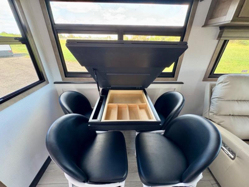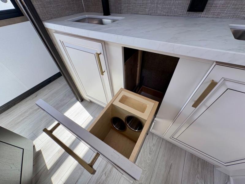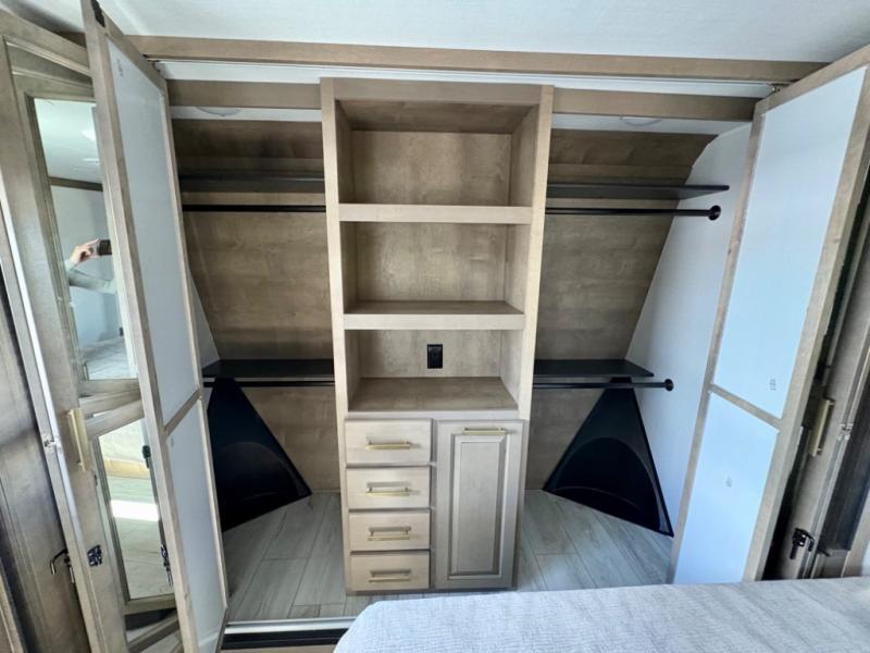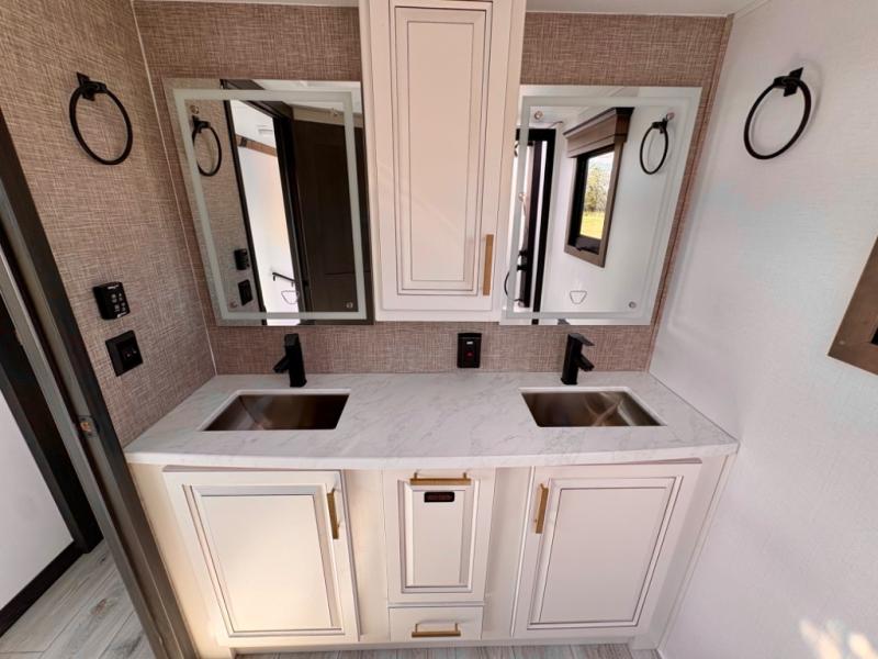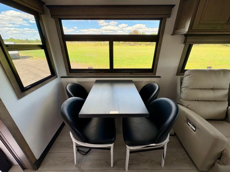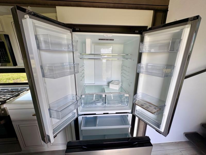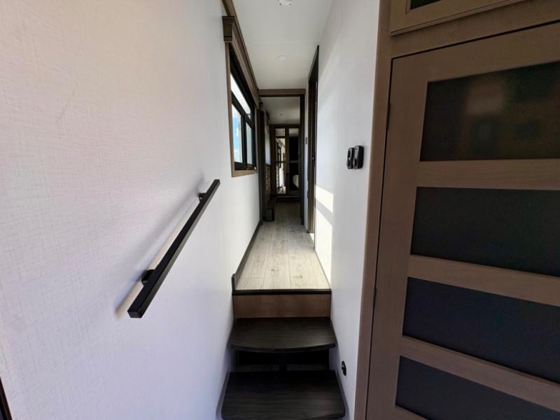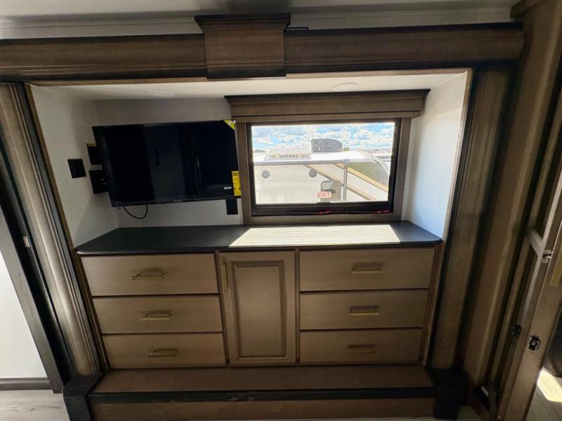 Enjoy a home away from home with this fifth wheel! The front private bedroom has a king bed slide with storage underneath across from a 32" Smart HDTV with drawers below it, a large front closet, and a sliding door to close it all off. Freshen up each morning in the full bathroom with the 48" x 30" fiberglass shower with a seat and skylight above for more natural lighting as you get ready at the dual sink vanity. The kitchen has everything you need to prepare your best meals including extra countertop space on the kitchen island and even a closet with washer/dryer prep so you can quickly grab a clean dish towel. Enjoy your meals at the pivot dinette and then relax on the rear hide-a-bed sofa or the residential power recliners across from the entertainment center with a 5,000 BTU decorative fireplace heater. There is even a 50" Smart HDTV to watch your favorite movies!
