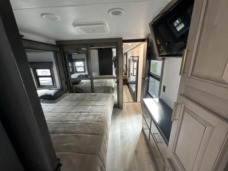 The perfect RV when you like to take "home"' with you when you travel! This Montana fifth wheel gives you the space you want and it feels like home with plenty of features to love and keep you comfortable when you are out enjoying your adventures. Four slides in total give each space plenty of room, the raised front kitchen has everything you need to cook up meals and snacks just like at home. An 18 cu. ft. residential refrigerator with an ice maker, convection microwave oven, and large sink, plus pantry space will make any chef happy. The mid-coach area just inside the door features a living room with dual opposing hide-a-bed slides as well as powered theater seating and a fireplace with Smart TV opposite. Step up to a bedroom with a king bed slide, a dresser, and closet featuring prep for a stackable washer and dryer. A sliding door leads into the rear spacious master bath featuring a 48" x 30" shower, a toilet, linen storage and a vanity with two sinks!