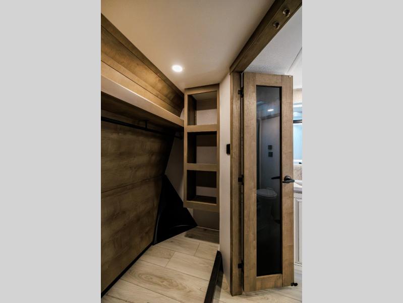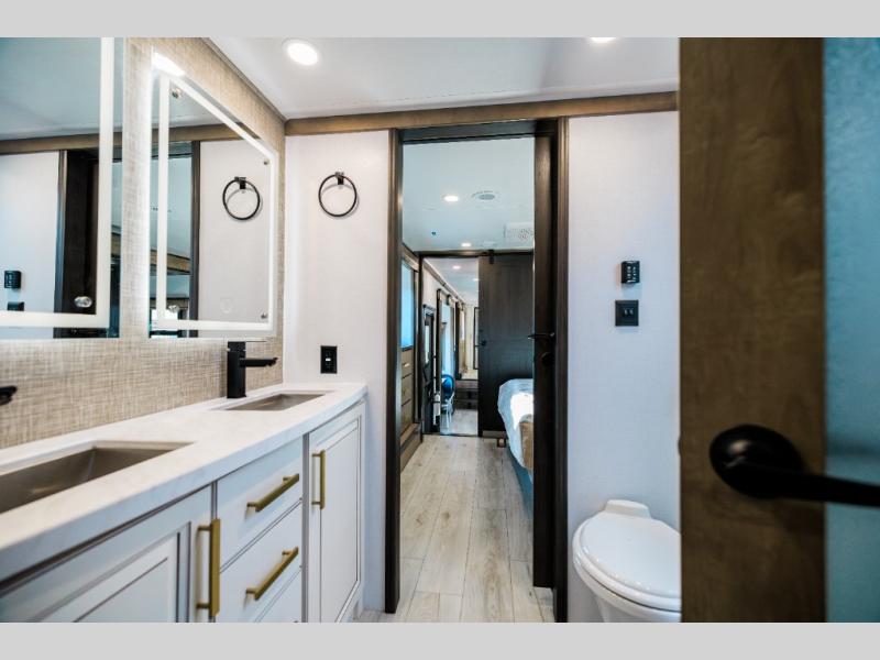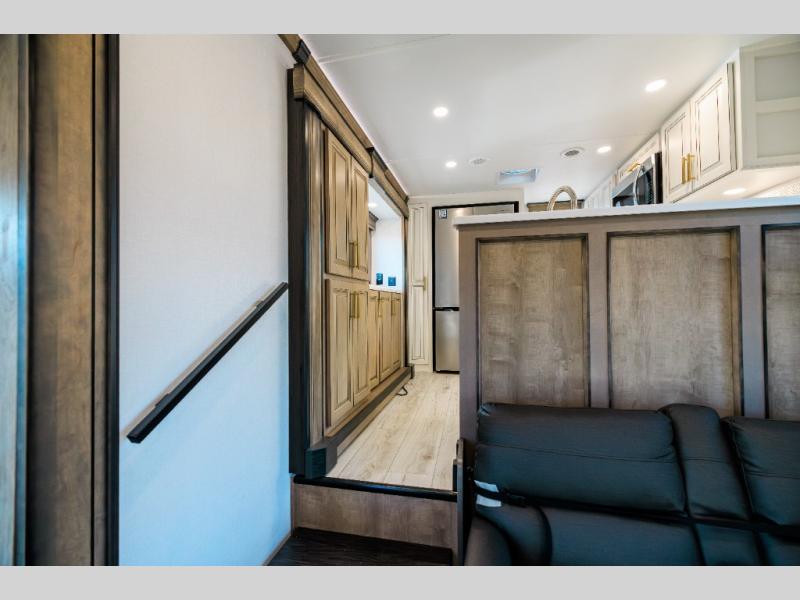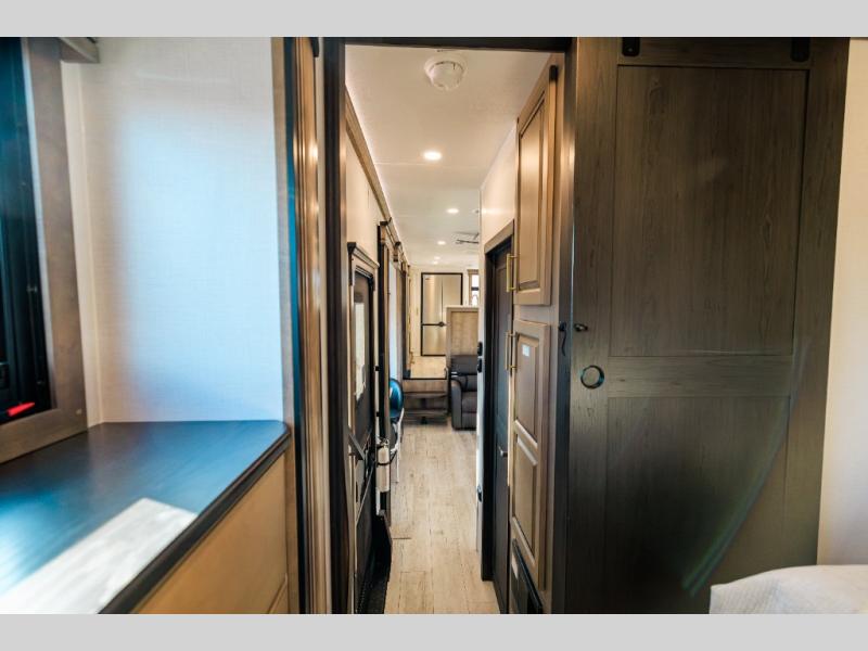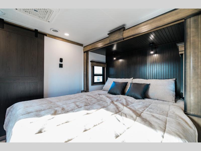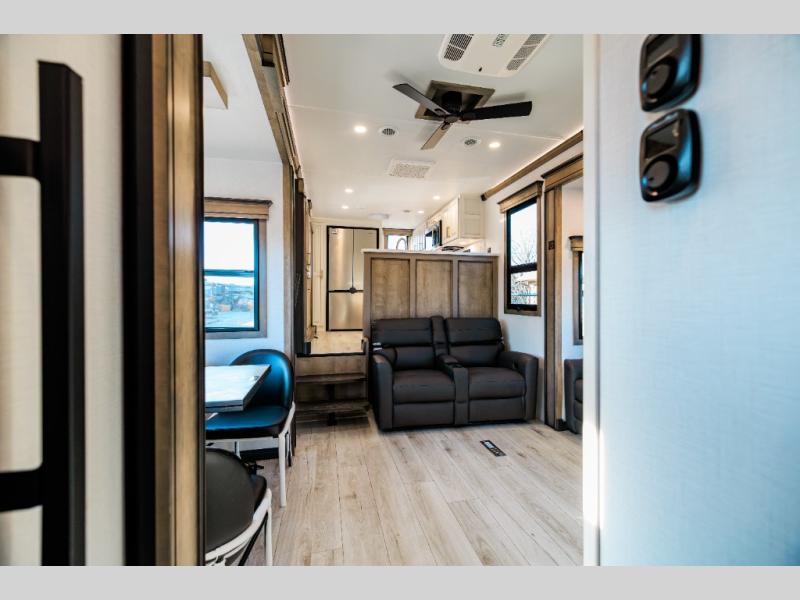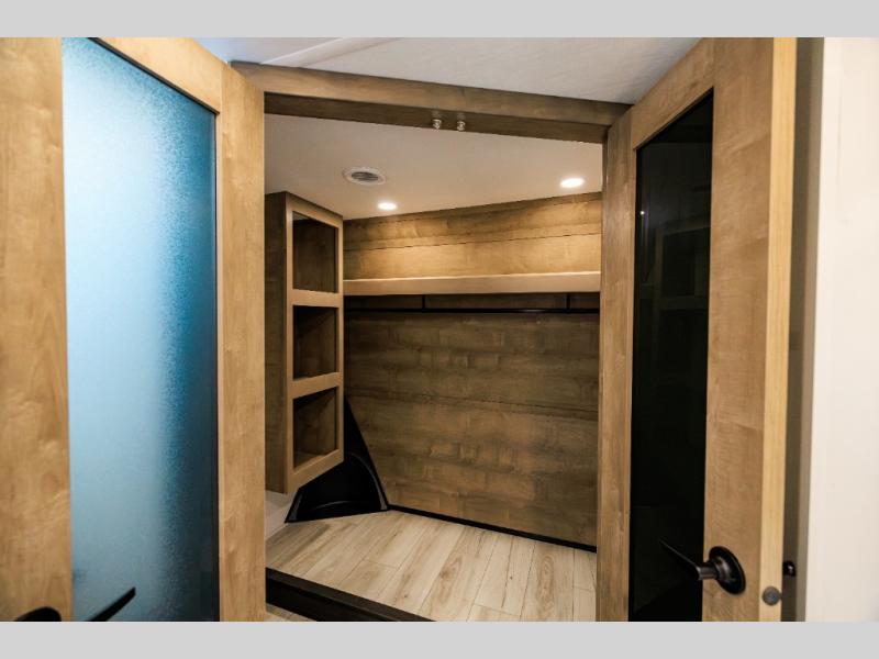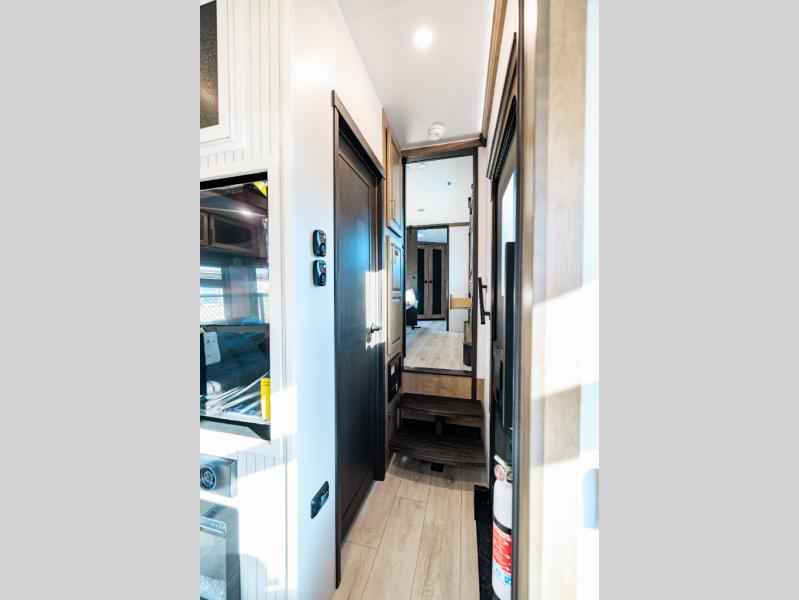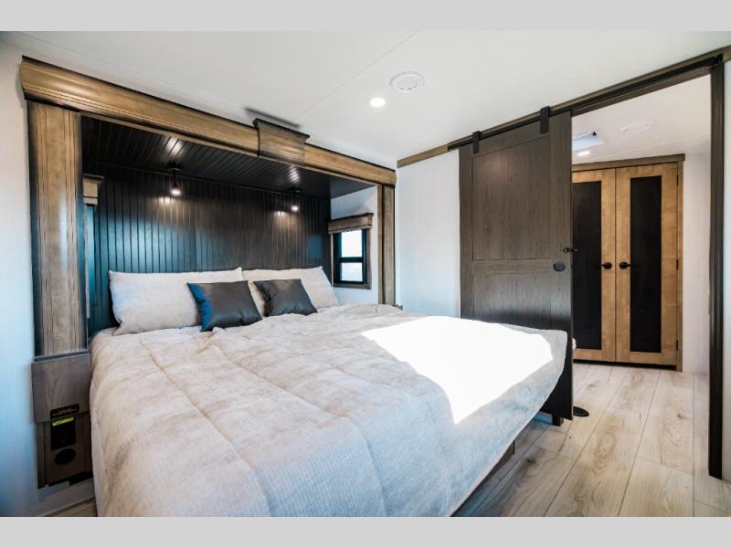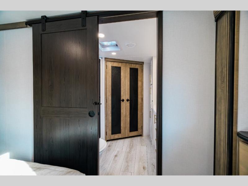 The perfect RV when you like to take "home"' with you when you travel! This Montana fifth wheel gives you the space you want and it feels like home with plenty of features to love and keep you comfortable when you are out enjoying your adventures. Five slides in total give each space plenty of room, the raised rear kitchen has everything you need to cook up meals and snacks just like at home. An 18 cu. ft. residential refrigerator with an ice maker, convection microwave oven and large sink, plus pantry space will make any chef happy. The mid-coach space just inside the door features a living room and half bath for convenience. There is also a pivot dinette within the roadside slide. Step up in front through a sliding barn door to a double slide space with a king bed and dresser. A second sliding door leads into the front spacious master bath featuring dual sinks, a 48" x 30" shower, and a large walk-in wardrobe with washer and dryer prep!