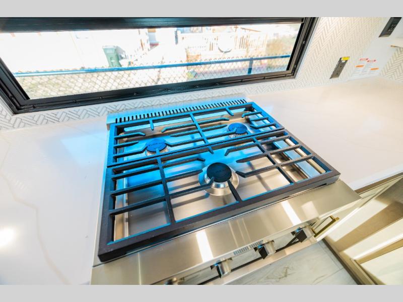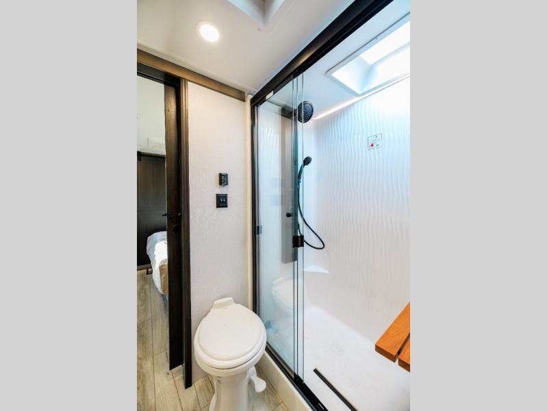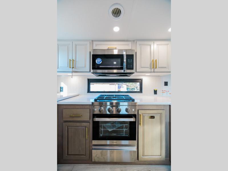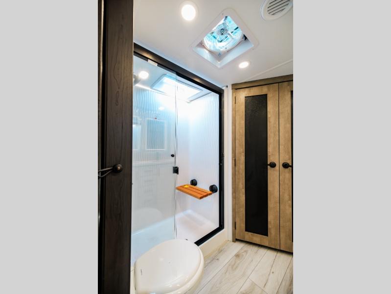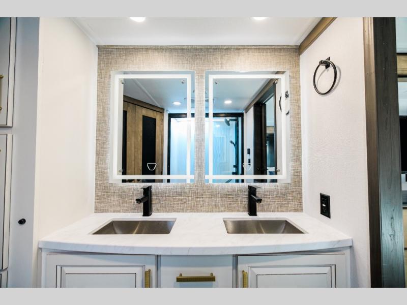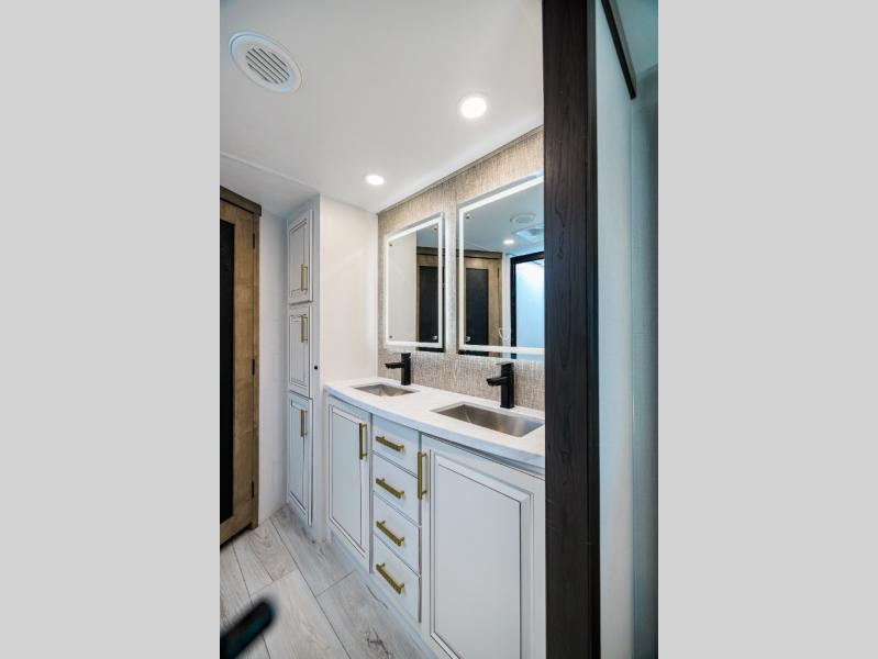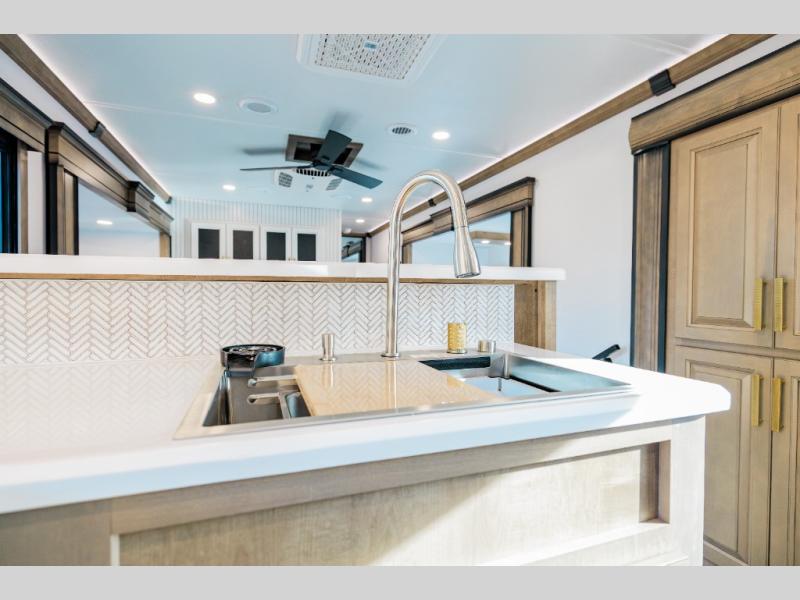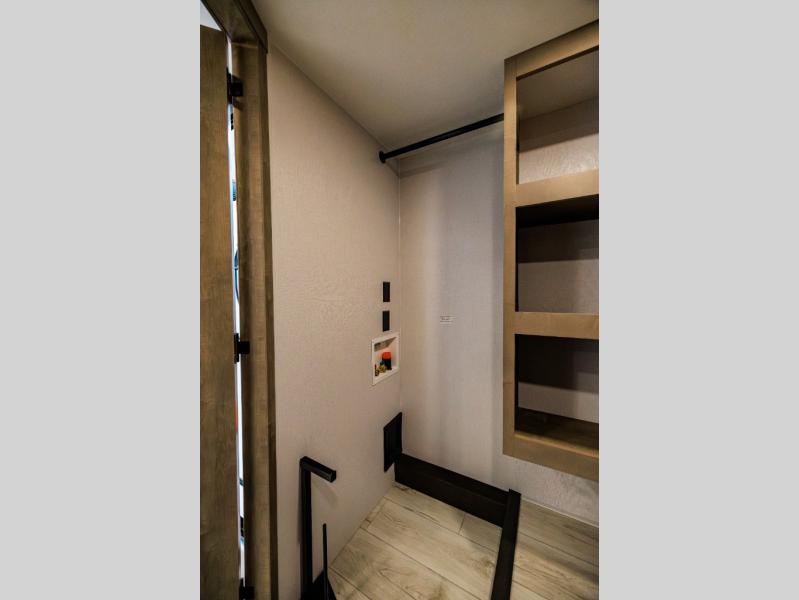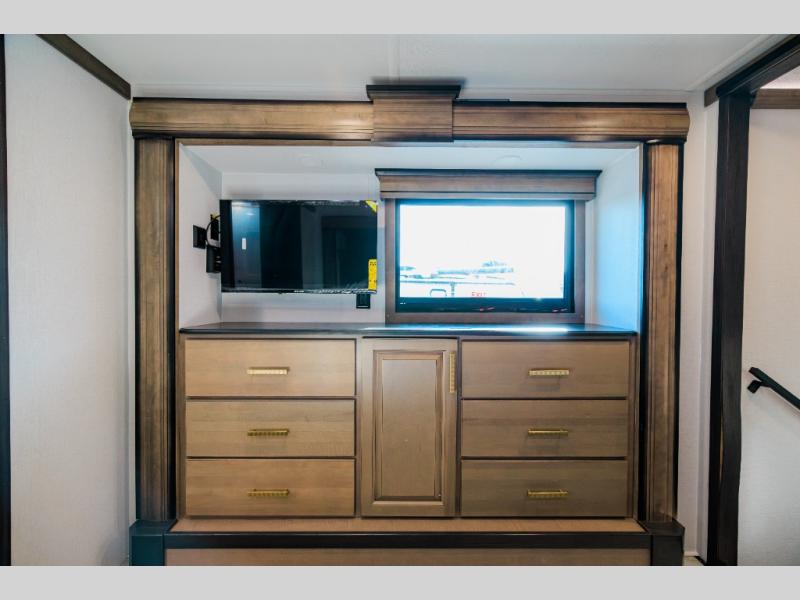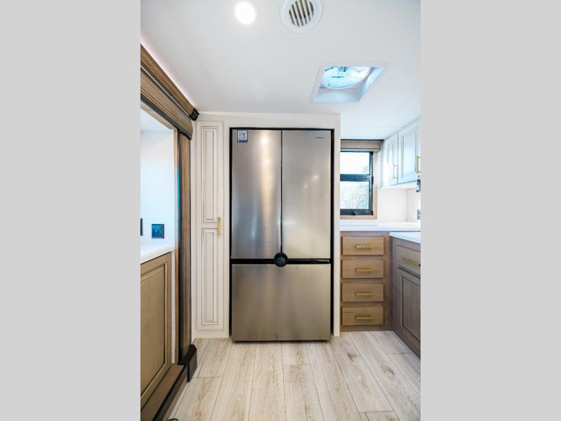 The perfect RV when you like to take "home"' with you when you travel! This Montana fifth wheel gives you the space you want and it feels like home with plenty of features to love and keep you comfortable when you are out enjoying your adventures. Five slides in total give each space plenty of room, the raised rear kitchen has everything you need to cook up meals and snacks just like at home. An 18 cu. ft. residential refrigerator with an ice maker, convection microwave oven and large sink, plus pantry space will make any chef happy. The mid-coach space just inside the door features a living room and half bath for convenience. There is also a pivot dinette within the roadside slide. Step up in front through a sliding barn door to a double slide space with a king bed and dresser. A second sliding door leads into the front spacious master bath featuring dual sinks, a 48" x 30" shower, and a large walk-in wardrobe with washer and dryer prep!