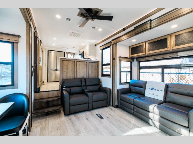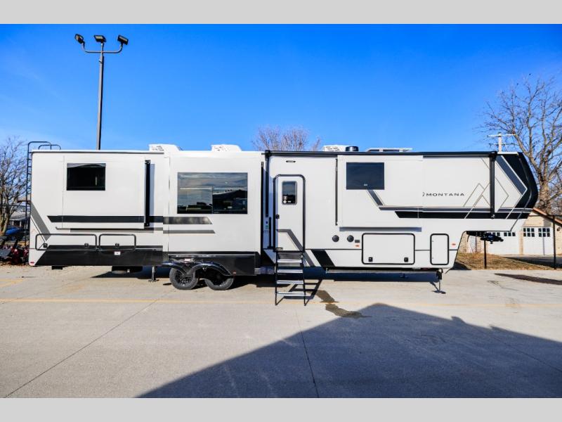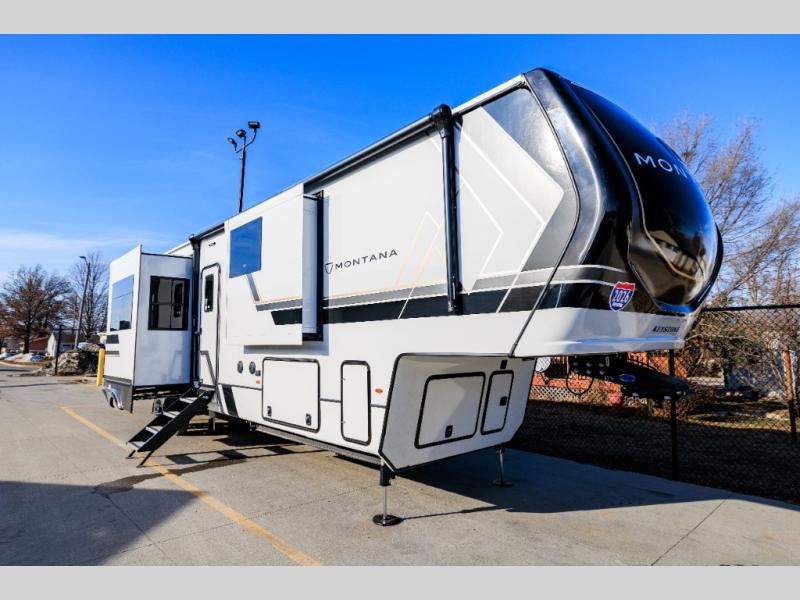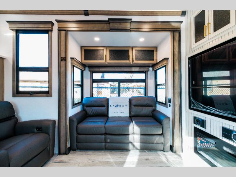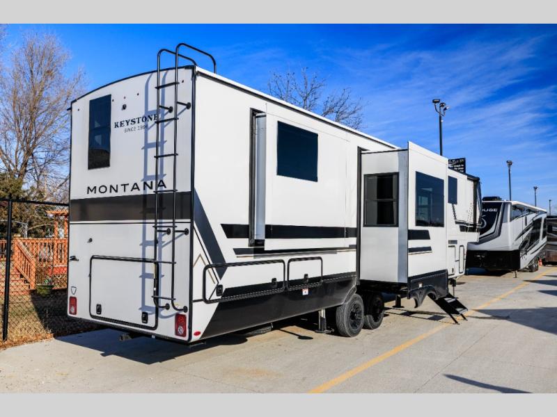 Enjoy luxury, innovation, and the outdoors in any one of Montana's finest fifth wheels. Each set the standard with exceptional features, and exciting factory installed options to provide you a great home on the road. Keystone's 12" I-beam chassis with z-frame technology provides a strong and durable foundation to your fifth wheel, and the four season living package will help extend your camping season. A few other construction features you will appreciate include a MORryde CRE3000 suspension, a fully walkable roof with an alpha seamless TPO membrane system, and 4k square frameless tinted safety glass windows. Each feature stylish interiors with two decor choices paired with beautiful hardwood cabinetry, Beauflor vinyl flooring throughout, central vacuum, plus a La-Z-Boy furniture package for all-around comfort!