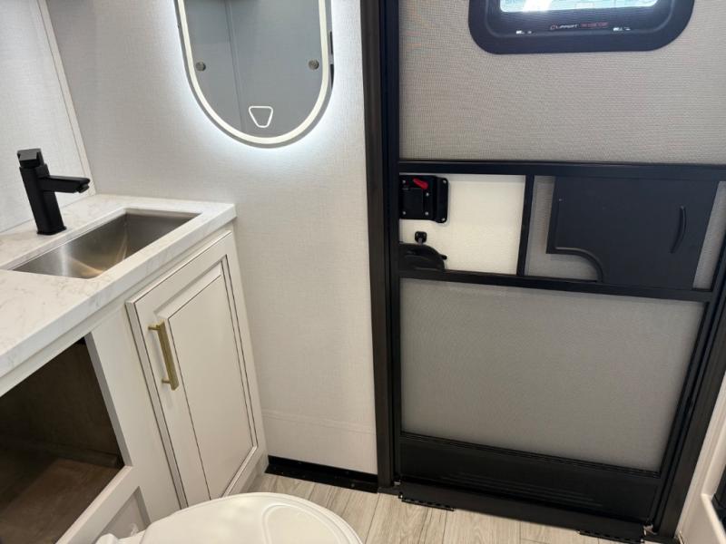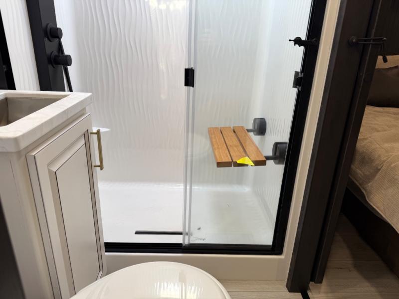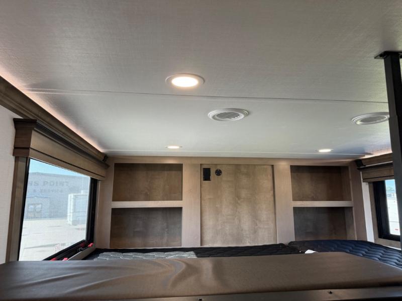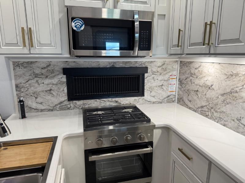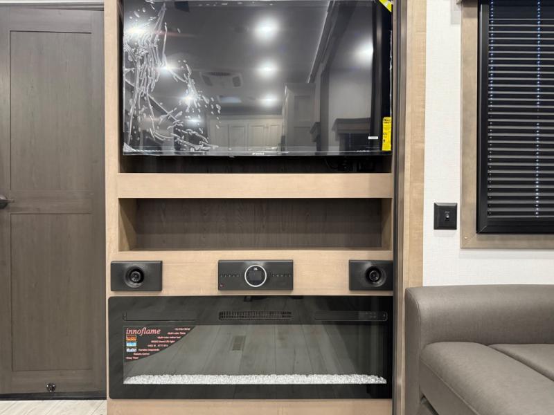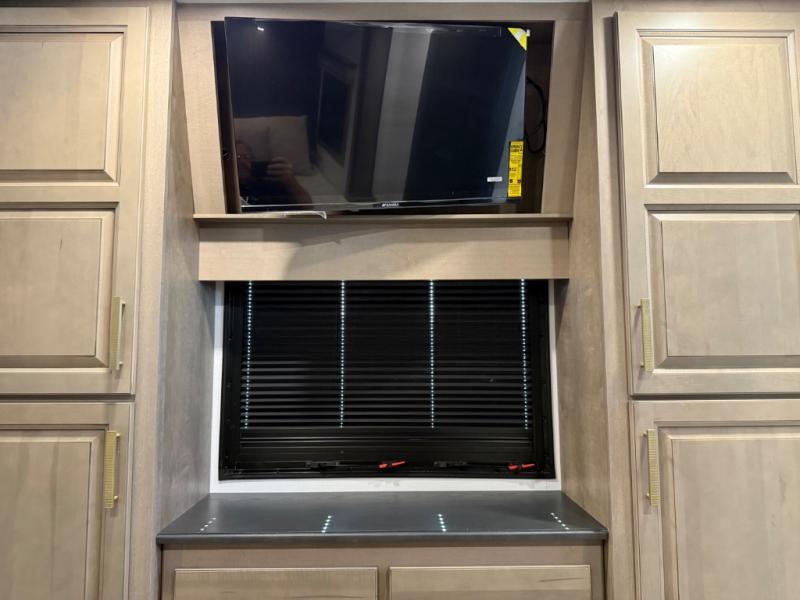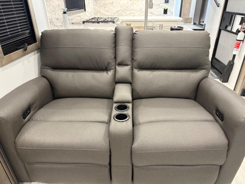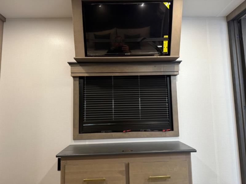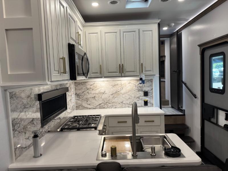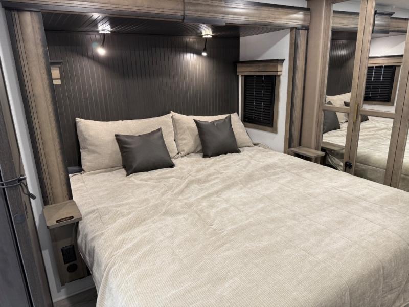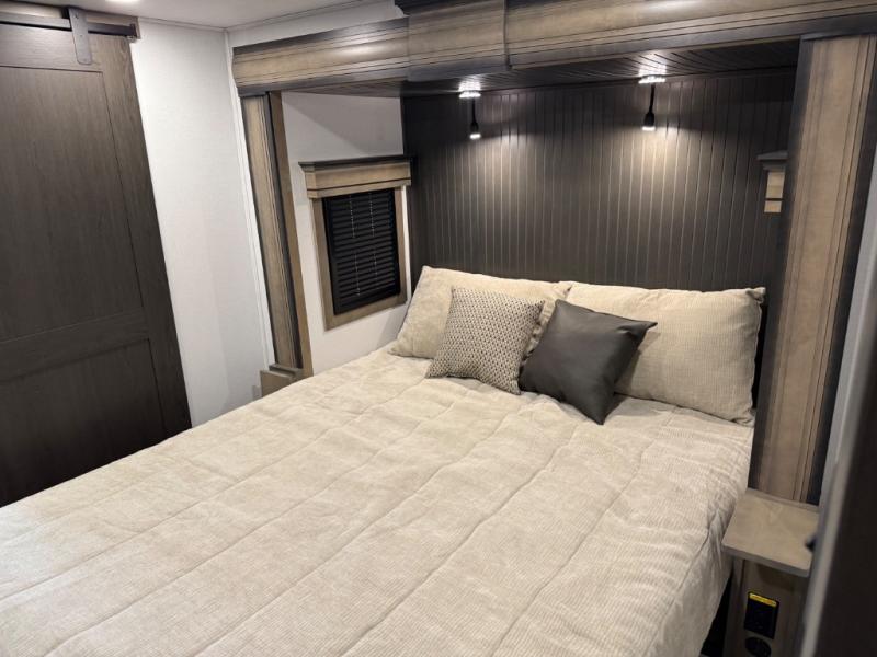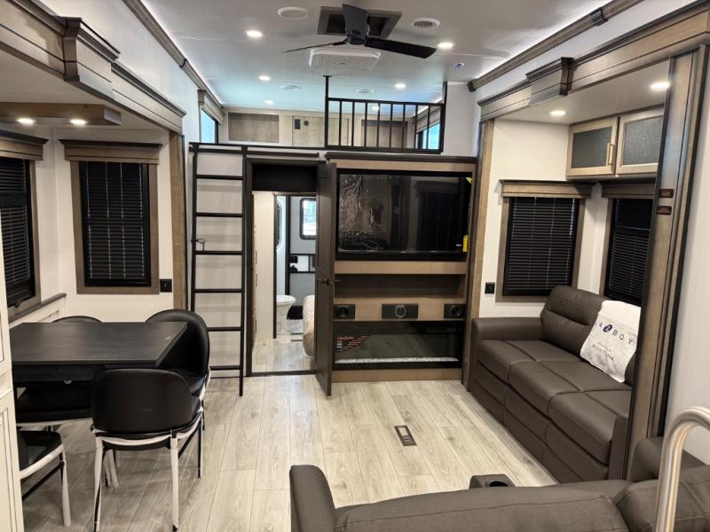 Traveling with friends and family is easier than ever with this fifth wheel in tow! There are two master suites; one for you and one for guests! The front master suite includes a king bed slide out, two closets plus additional storage, plus stackable washer/dryer prep if you want the option to make wash day easier. There is also convenient underbed storage, a dresser with a Smart HD TV, plus a private entrance into the dual entry bath. Head to the rear master suite to find just as much comfort with a queen bed slide out, dual closets and a dresser, plus a full rear bath where the second entry door is located. There is also a loft area above this room with three bunk mats for more campers! The middle kitchen and living area includes many comforts, like the power theater seating across from the 50" Smart TV and hide-a-bed sofa, plus the U-shaped kitchen with ample counter space and a 24" range. You'll also find food storage in the pantry and 18 cu. ft. residential refrigerator with an ice maker, or you can choose the slightly larger optional 20 cu. ft. refrigerator!