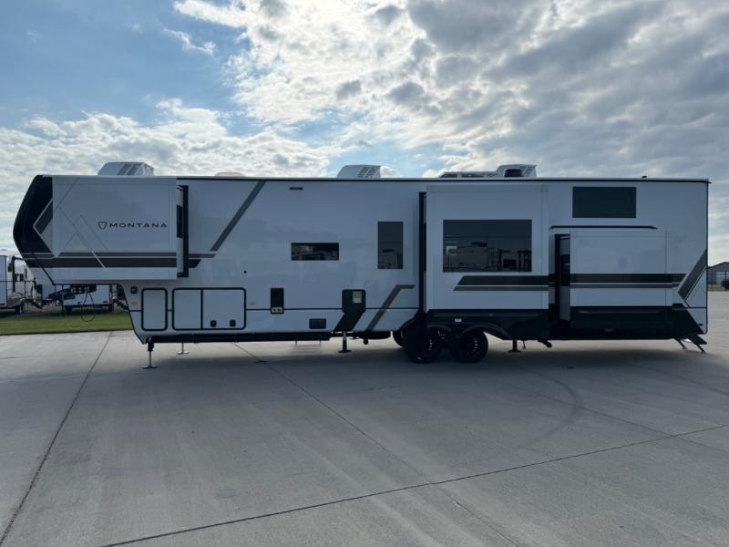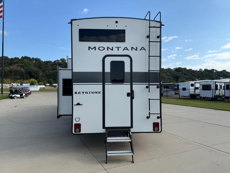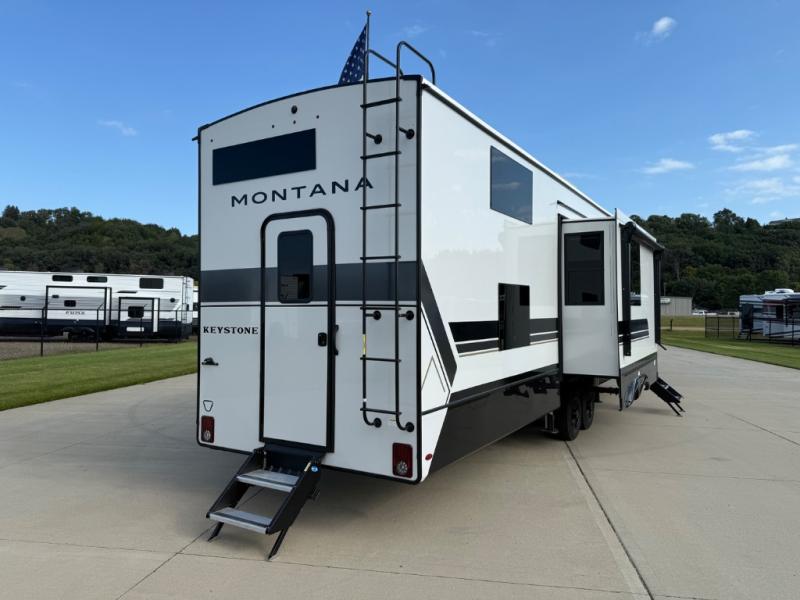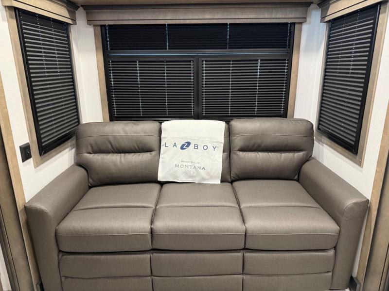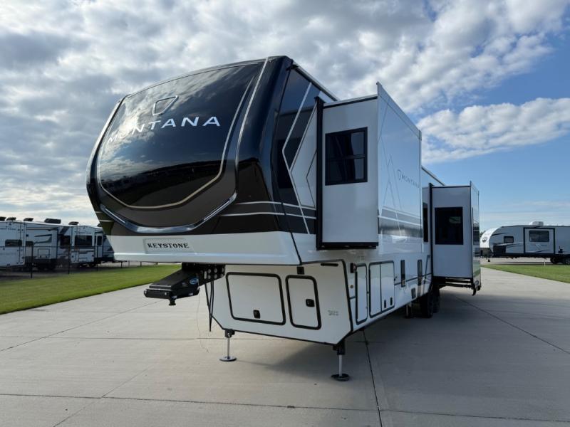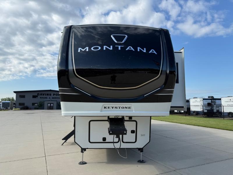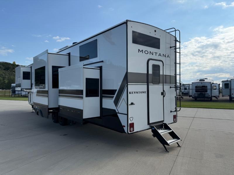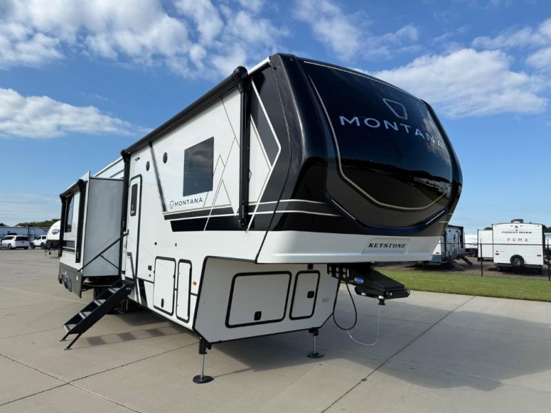 Enjoy luxury, innovation, and the outdoors in any one of Montana's finest fifth wheels. Each set the standard with exceptional features, and exciting factory installed options to provide you a great home on the road. Keystone's 12" I-beam chassis with z-frame technology provides a strong and durable foundation to your fifth wheel, and the four season living package will help extend your camping season. A few other construction features you will appreciate include a MORryde CRE3000 suspension, a fully walkable roof with an alpha seamless TPO membrane system, and 4k square frameless tinted safety glass windows. Each feature stylish interiors with two decor choices paired with beautiful hardwood cabinetry, Beauflor vinyl flooring throughout, central vacuum, plus a La-Z-Boy furniture package for all-around comfort!