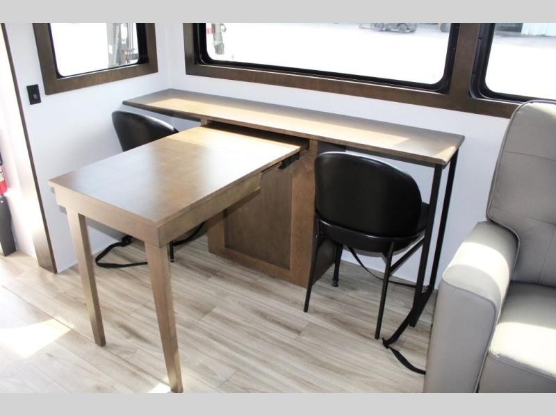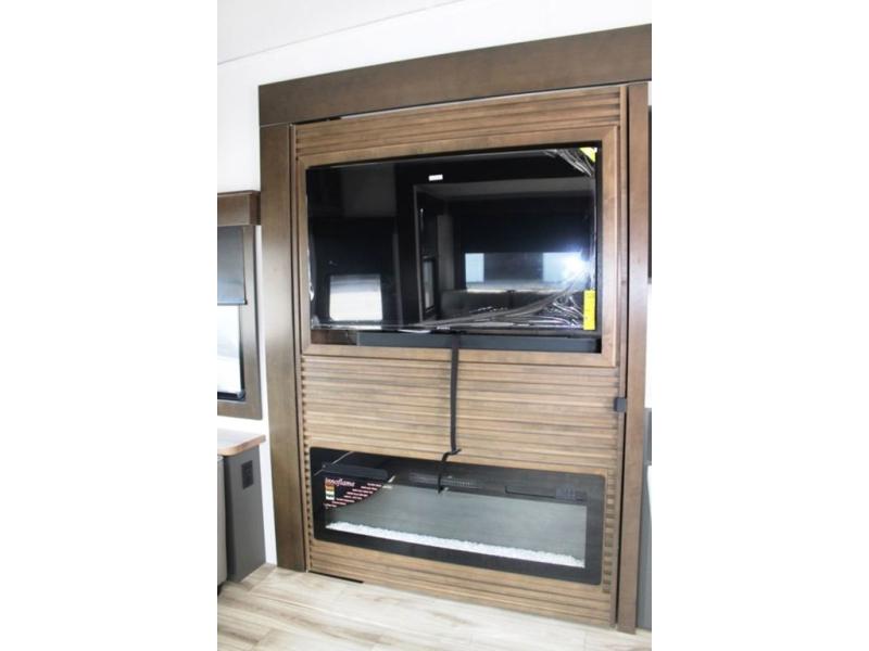 You'll love camping in this fifth wheel with a rear living room and triple slides for ample interior space! The sofa, theater seating, and adjustable sliding 'Deskette" with chairs will provide comfortable seating, dining, and working space, and the entertainment center with a fireplace will make it feel more like home. A large kitchen island gives you more counter space when making meals in the full kitchen, and the spacious full bath is a comfort you won't want to camp without. Up front, you'll find a private bedroom with a king bed slide, storage space and TV prep if you want the option to watch movies in bed.