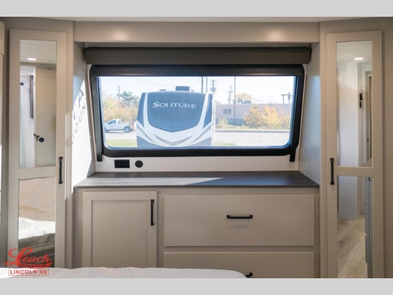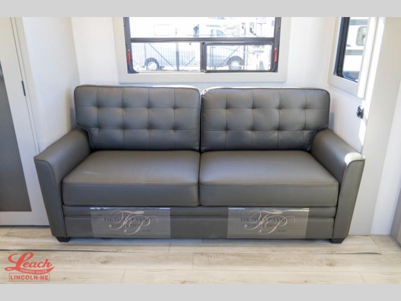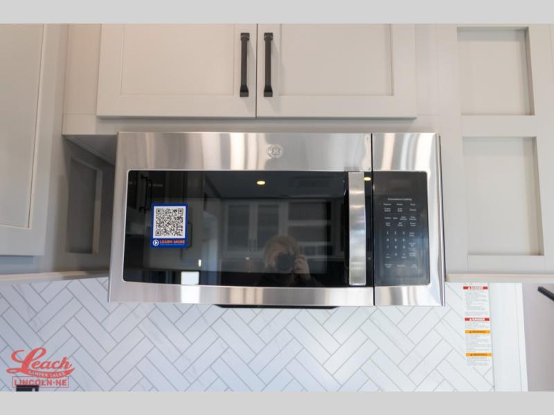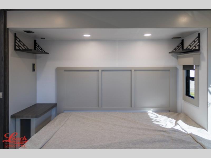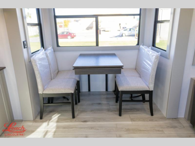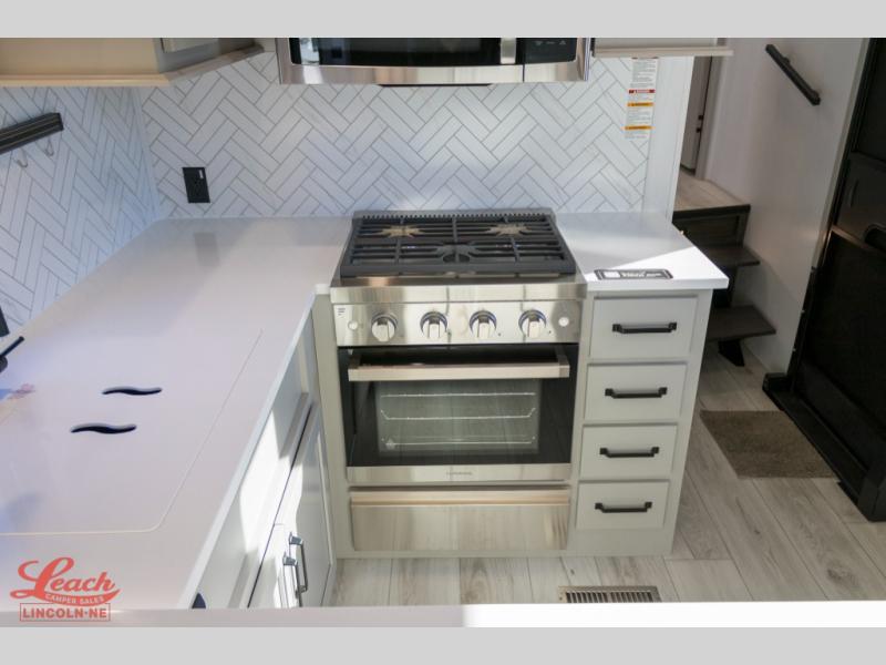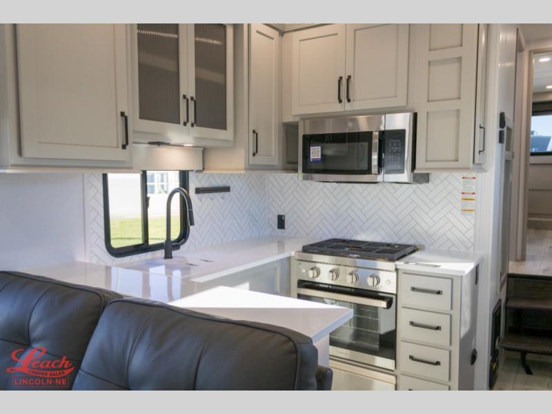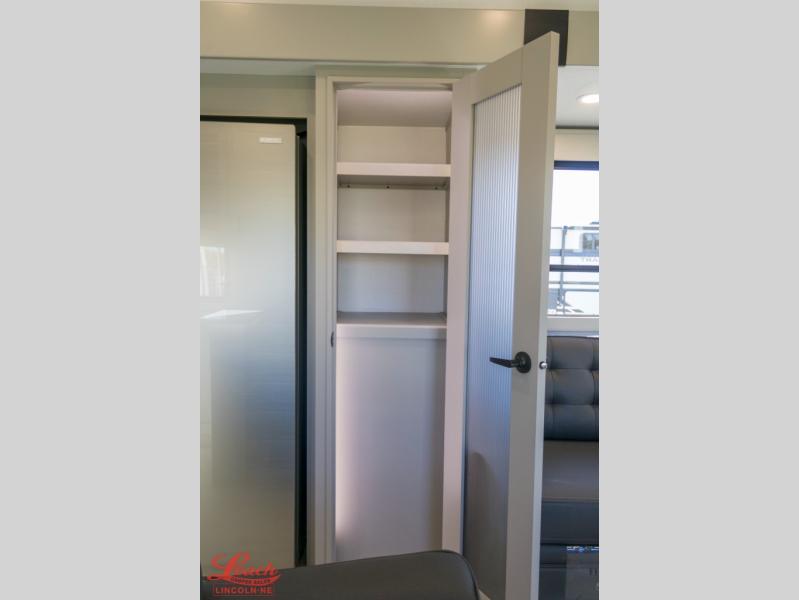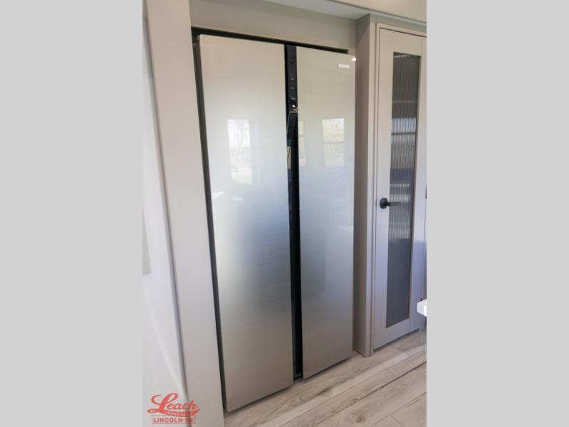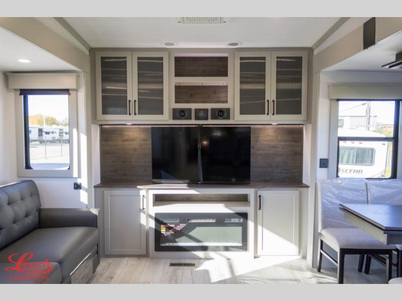 This couples coach will have you excited about traveling to all of your favorite places, and new locations too! The triple slide unit features an open concept living/dining area with dual opposing slides at the very back featuring a hide-a-bed sofa along the curbside, and a dining space opposite with a booth dinette or choose the optional table and four chairs. Power theater seats will be a comfortable place to kick back for a movie, and you will love the all-new entertainment center design featuring a fireplace, Smart TV, and overhead cabinets. In the evening, head up to your private retreat with a spacious bath including dual entry doors from the hall at the top of the stairs or from within the private bedroom. Get cleaned up in the large radius shower with seat and snuggle up in a king bed slide. The bedroom slide also features a large wardrobe that has been prepped for a washer/dryer if you choose to add the convenience. You will find plenty more storage spaces for your clothing and belongings in the two dressers or dual wardrobes along the full front wall. Another bonus with this unit is the outdoor kitchen which gives you a choice to cook inside or out!