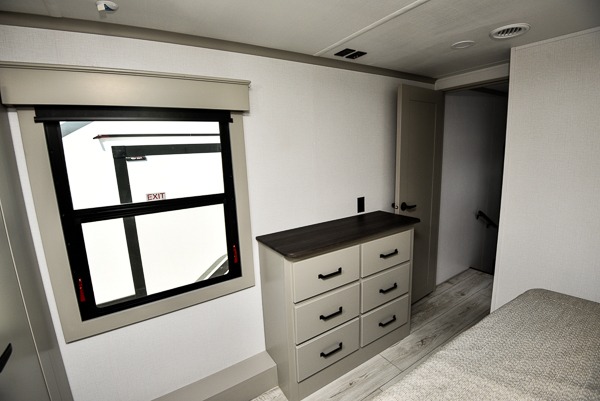 This rear kitchen fifth wheel features ample counter space, an L-shaped counter, plus a spacious pantry and residential refrigerator for food storage. Your crew can relax on the hide-a-bed sofa and power theater seating, or dine at the booth dinette. There is also an entertainment center and fireplace with a hidden pantry behind it for board games and movies. A full bath includes a shower with a seat for added comfort, and the front private bedroom with a king bed slide is sure to bring a great night's rest. You'll find a spacious wardrobe and a dresser to keep your clothes organized, plus washer and dryer prep if you want to add these appliances.