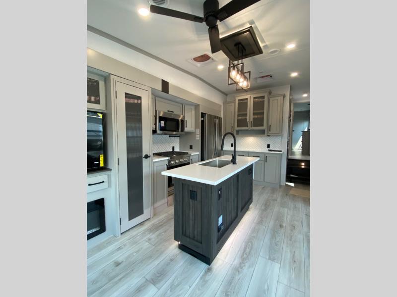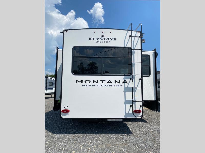 Live the high life with a Keystone Montana High Country fifth wheel! You'll have all the luxury you need with these units. They come with a MaxTurn™ front cap with KeyShield™ automotive-grade paint, a fully walkable roof with Alpha seamless TPO membrane system, and an insulated underbelly with forced hot air and electric tank heaters. The MORryde CRE3000 suspension with wet bolts helps provide a smooth tow, and the Ground Control® four-point electric auto-leveling with hitch memory will make set-up quite easy. The interior is elegantly appointed with the Thomas Payne Collection furniture, hardwood decorative slide-out fascia, Beauflor® vinyl throughout, accent crown molding, and premium solid surface kitchen countertops.