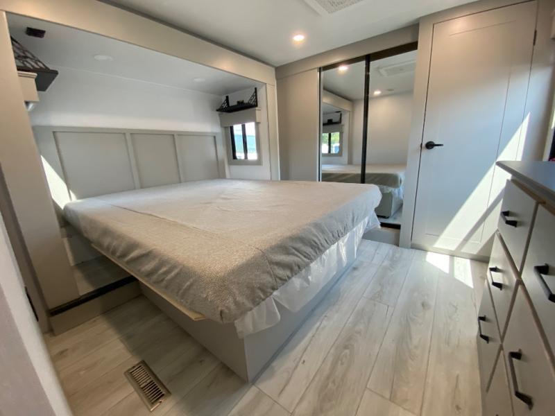 You can live life to its fullest in this Montana High Country fifth wheel! There are opposing slides in the main living area for more space, and the fireplace adds coziness to this space. Spend time relaxing on the power theater seating, and use the hide-a-bed sofa as an extra bed when you have friends turn into overnight guests. The pantry will help you keep your snacks stored away, and full bathroom has a dual-sink vanity and 48" x 30" shower with seat for a convenient way to get clean. The front bedroom has a king bed slide with storage underneath the bed, and the wardrobe and dresser provide more storage space.