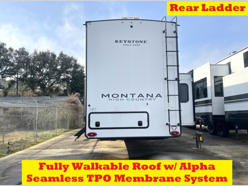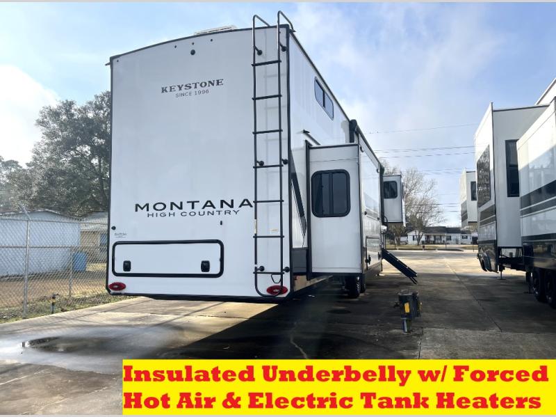 Live the high life with a Keystone Montana High Country fifth wheel! You'll have all the luxury you need with these units. They come with a MaxTurn™ front cap with KeyShield™ automotive-grade paint, a fully walkable roof with Alpha seamless TPO membrane system, and an insulated underbelly with forced hot air and electric tank heaters. The MORryde CRE3000 suspension with wet bolts helps provide a smooth tow, and the Ground Control® four-point electric auto-leveling with hitch memory will make set-up quite easy. The interior is elegantly appointed with the Thomas Payne Collection furniture, hardwood decorative slide-out fascia, Beauflor® vinyl throughout, accent crown molding, and premium solid surface kitchen countertops.