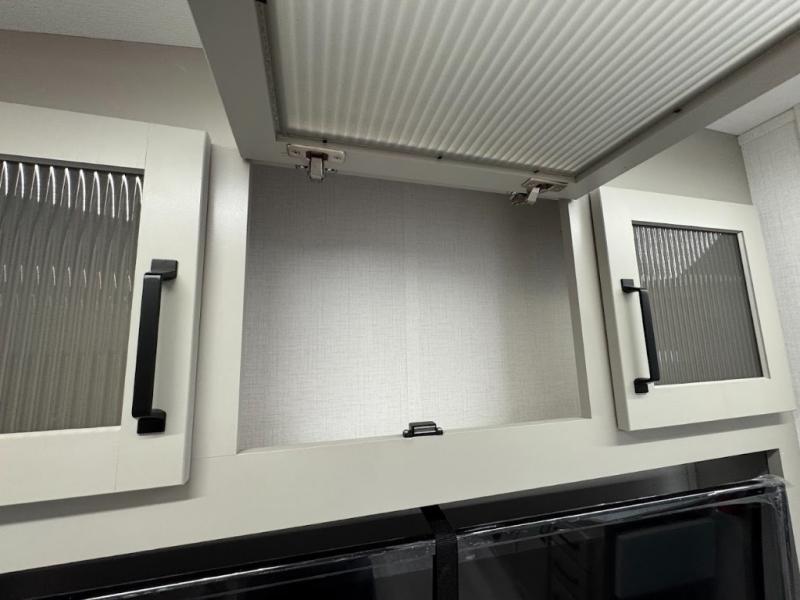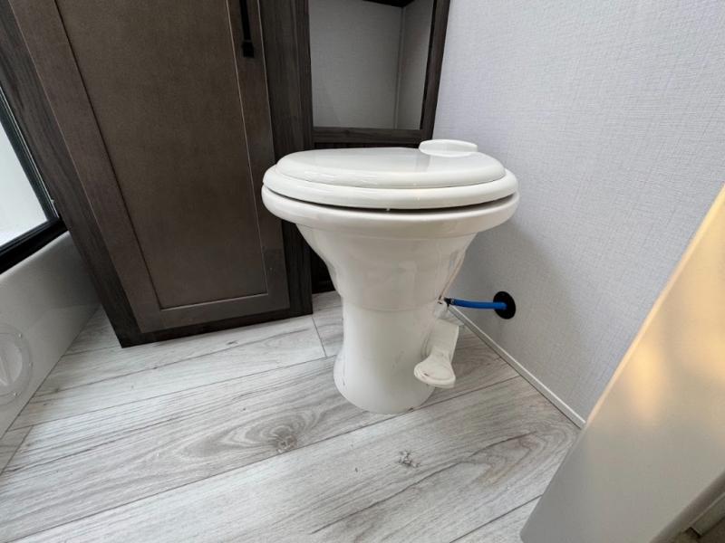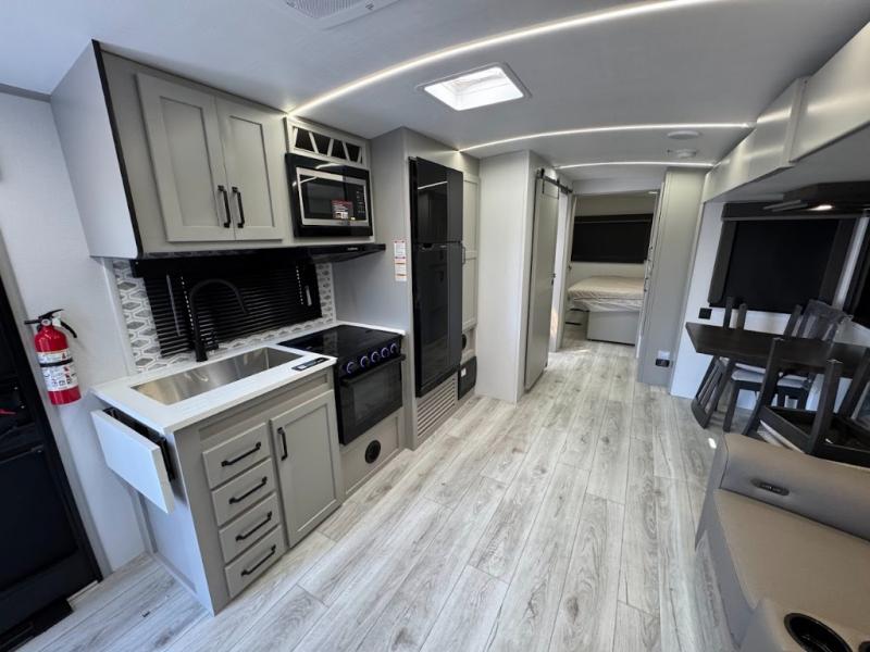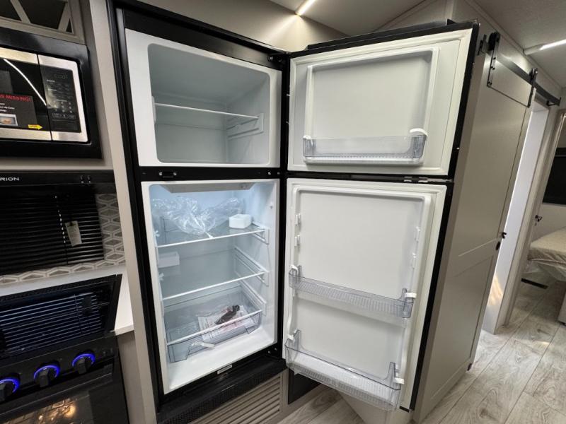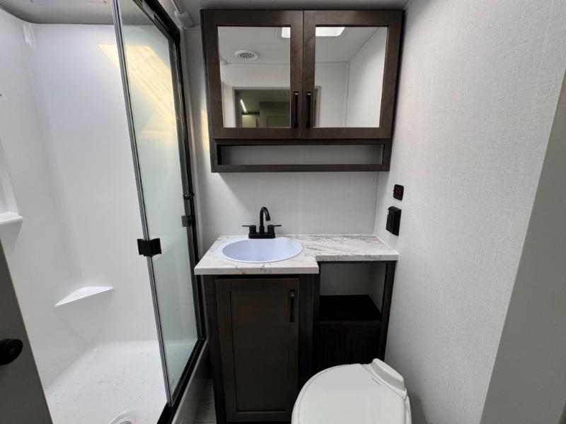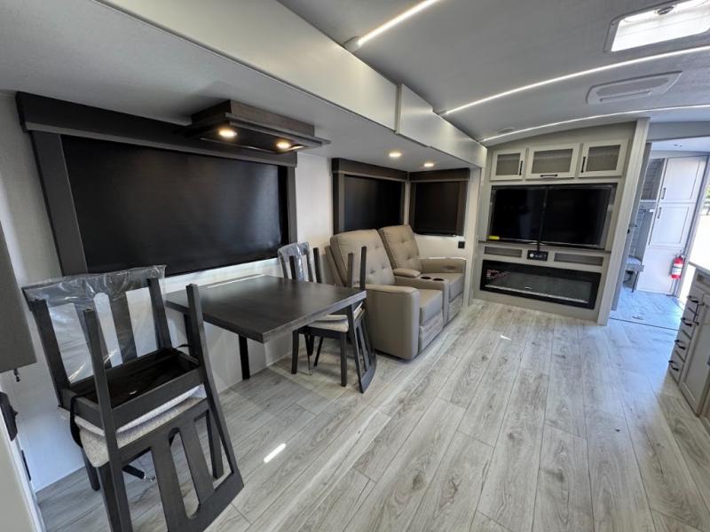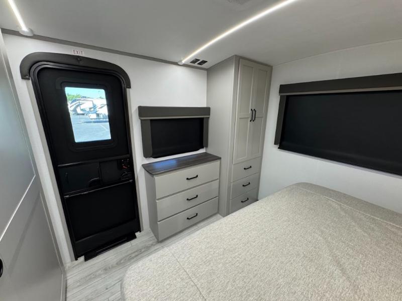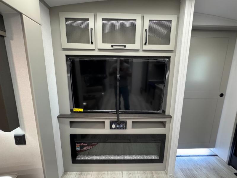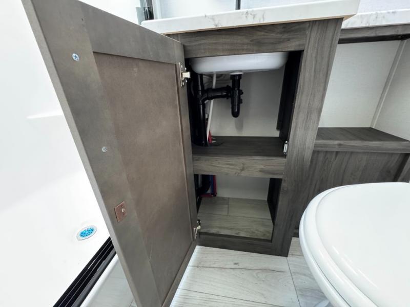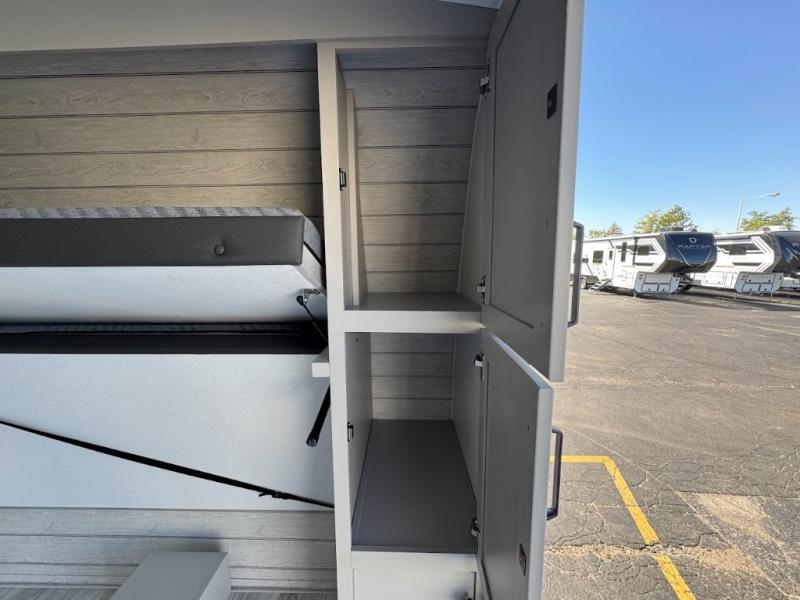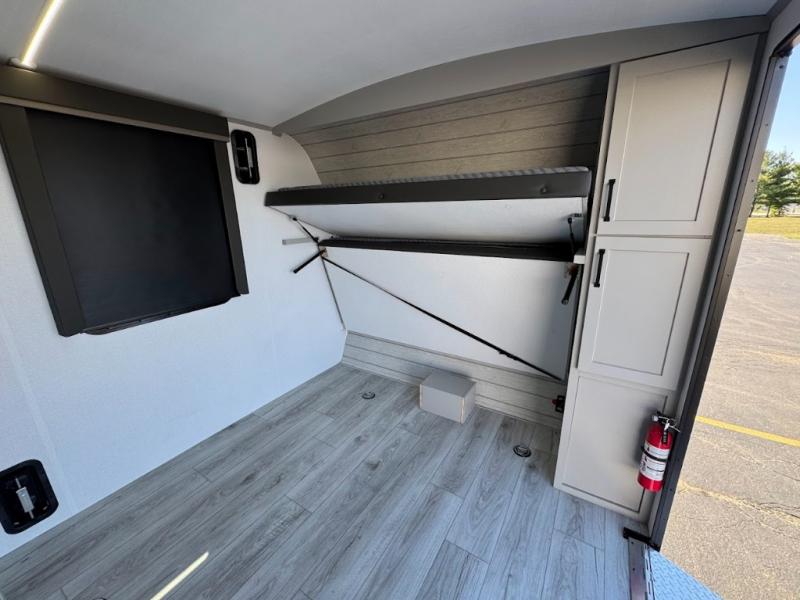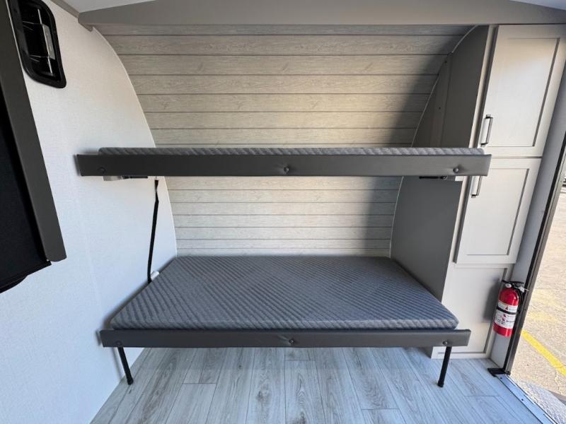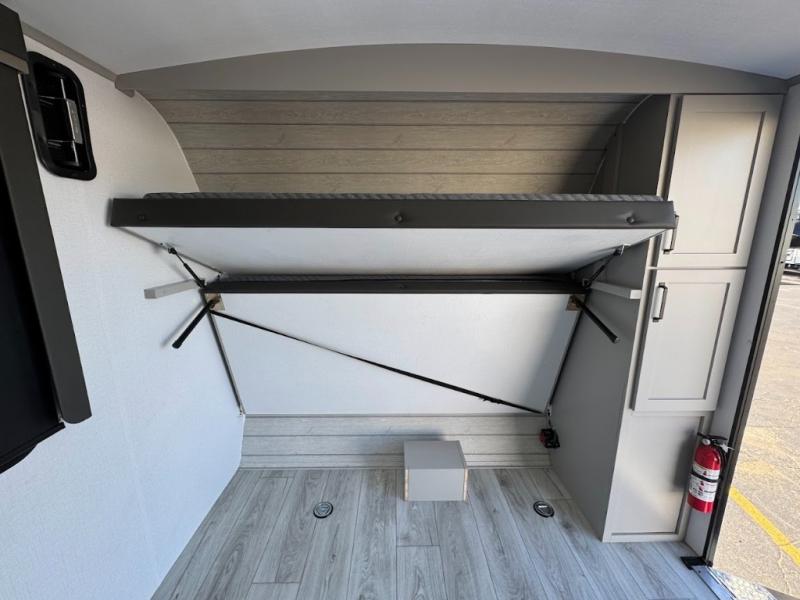 This travel trailer toy hauler allows you to load up your toys along the side using the 56" ramp door with an extension as well as allows a person in a wheelchair access inside through the front cargo garage, plus there are flip-down bunk beds, a wardrobe and a barn slider door leading into the main living and kitchen area. You will find a sofa sleeper and booth dinette slide, a 50" HDTV with a fireplace below, and full kitchen amenities for the cook to make meals, store leftovers and clean up dishes. The spacious full bathroom will keep everyone clean after the rides or hikes, and the rear master bedroom allows you to sleep like royalty while your pet has their own space in the built-in pet kennel. Having dual entry doors makes loading and unloading easy and provides a smooth flow of traffic. There are options to choose from if you would prefer a table and chairs in place of the booth dinette or theater seating in place of the sofa sleeper.