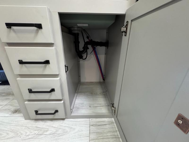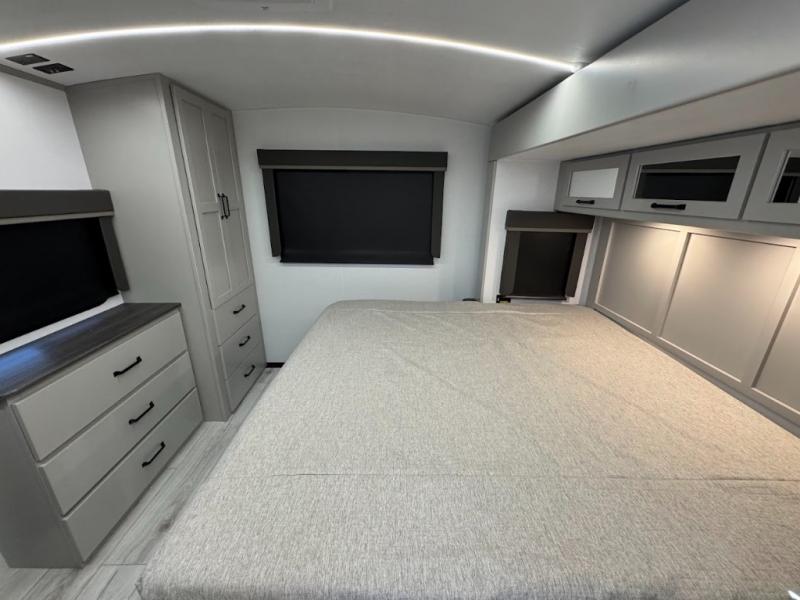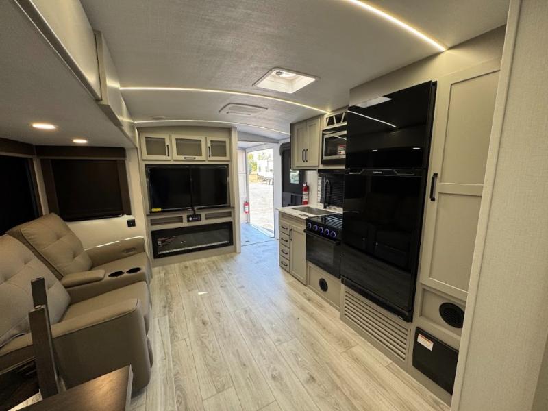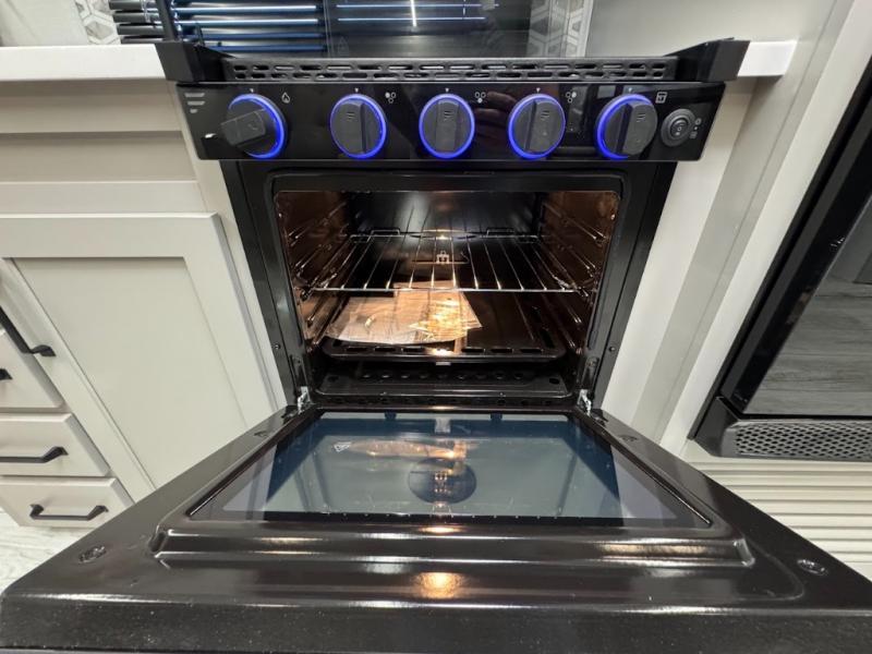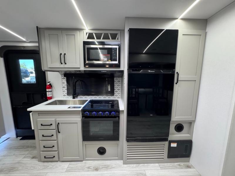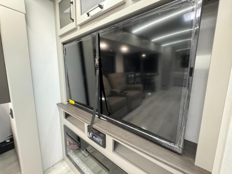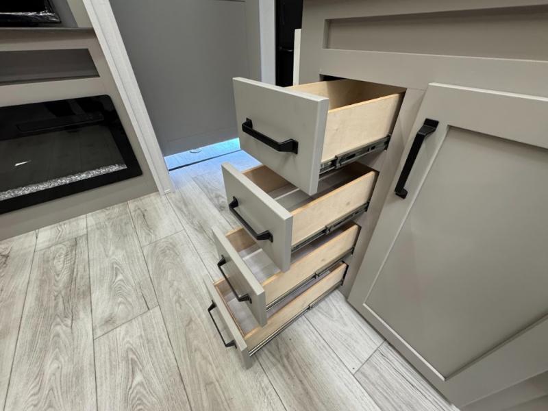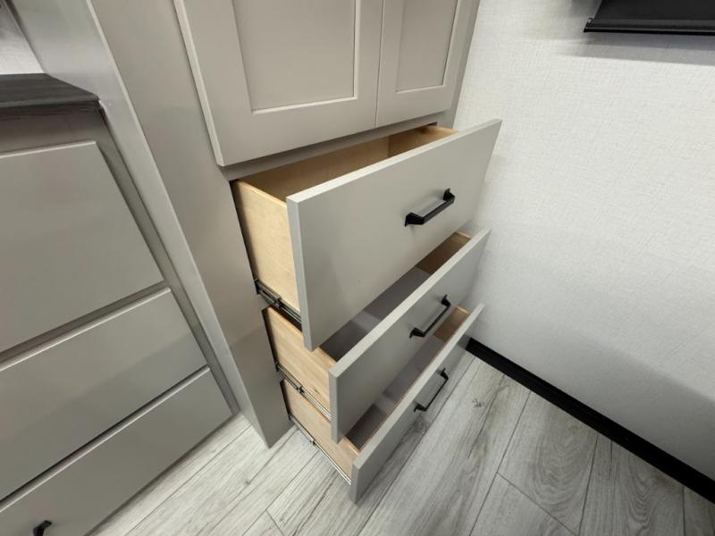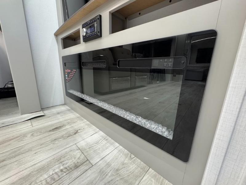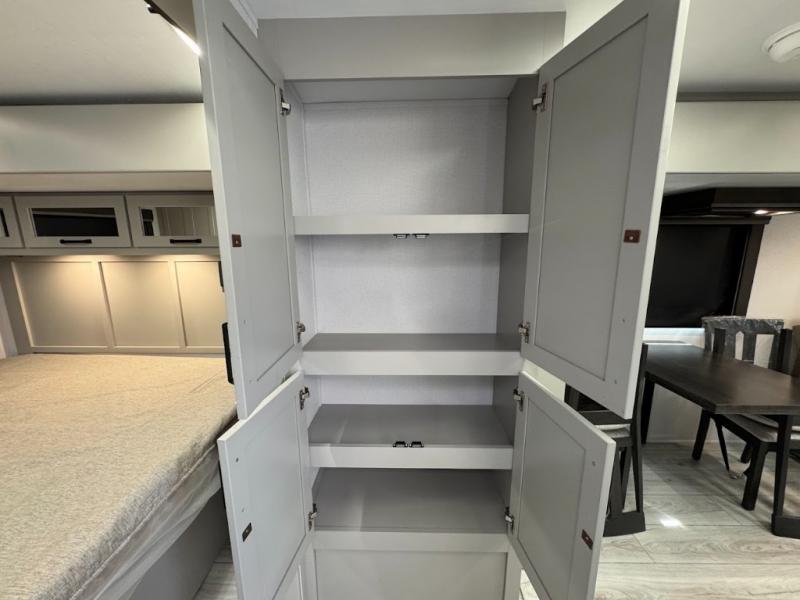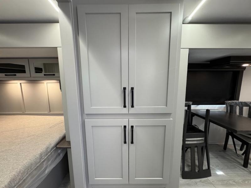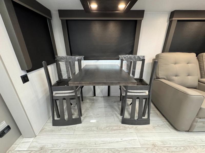 This travel trailer toy hauler allows you to load up your toys along the side using the 56" ramp door with an extension as well as allows a person in a wheelchair access inside through the front cargo garage, plus there are flip-down bunk beds, a wardrobe and a barn slider door leading into the main living and kitchen area. You will find a sofa sleeper and booth dinette slide, a 50" HDTV with a fireplace below, and full kitchen amenities for the cook to make meals, store leftovers and clean up dishes. The spacious full bathroom will keep everyone clean after the rides or hikes, and the rear master bedroom allows you to sleep like royalty while your pet has their own space in the built-in pet kennel. Having dual entry doors makes loading and unloading easy and provides a smooth flow of traffic. There are options to choose from if you would prefer a table and chairs in place of the booth dinette or theater seating in place of the sofa sleeper.