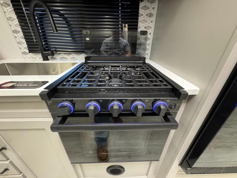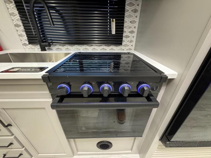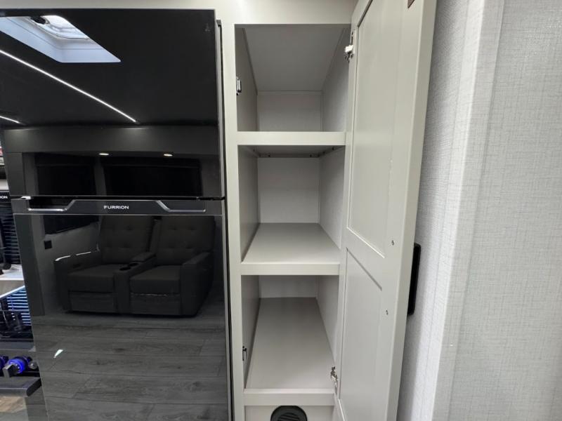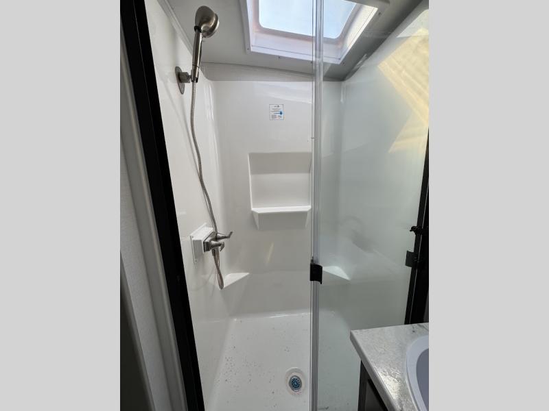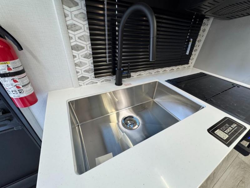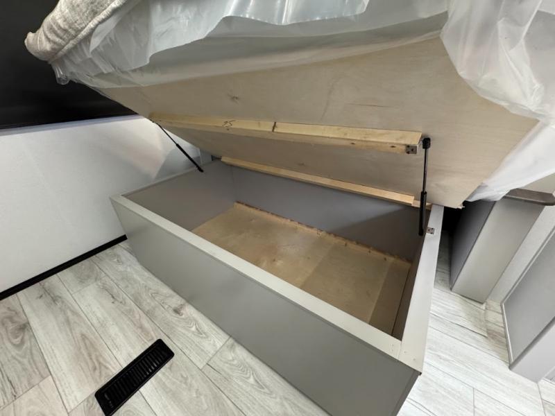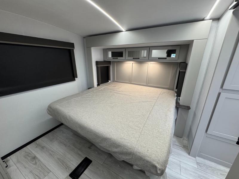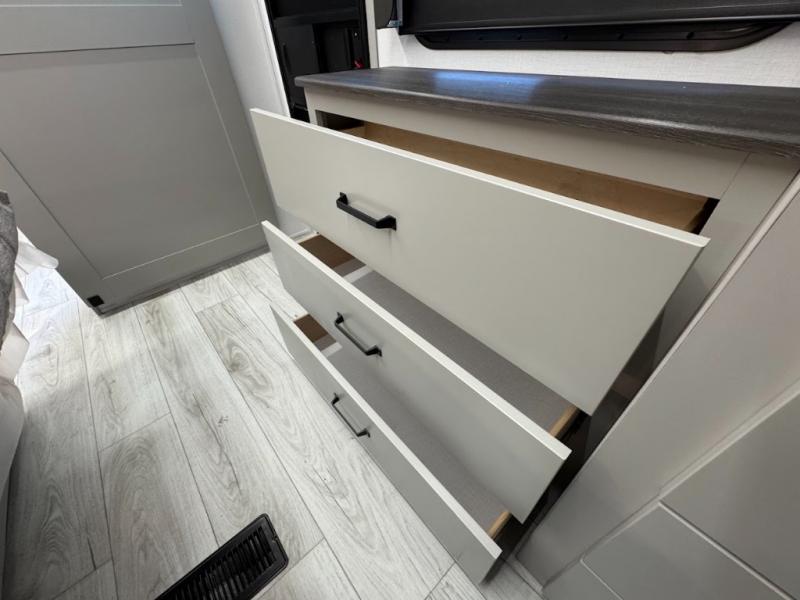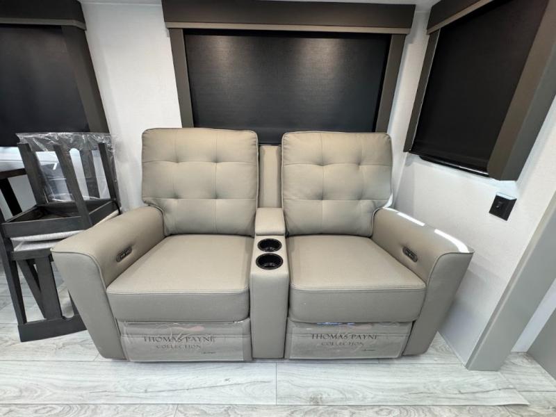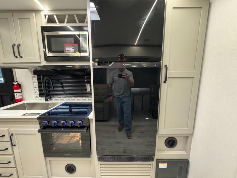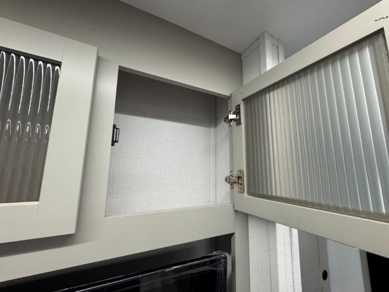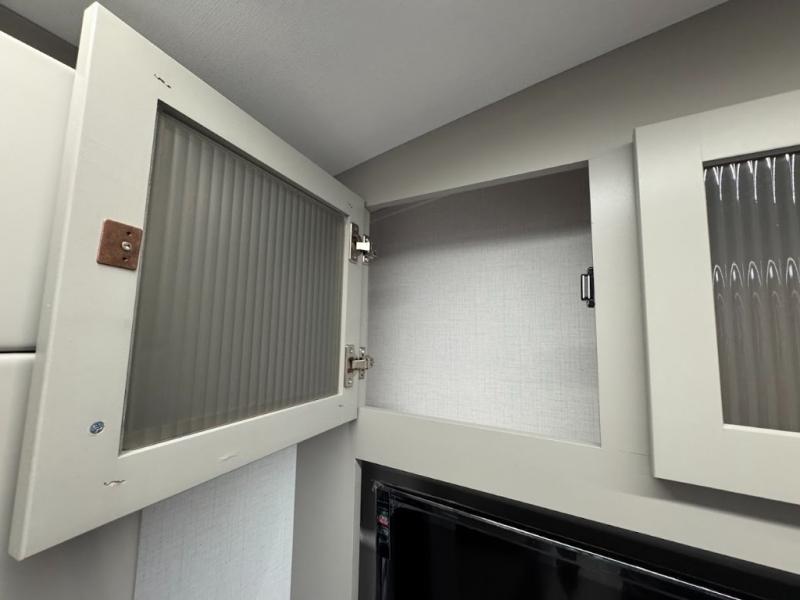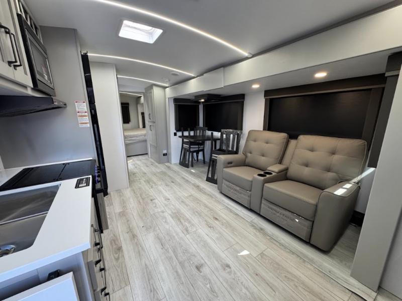 This travel trailer toy hauler allows you to load up your toys along the side using the 56" ramp door with an extension as well as allows a person in a wheelchair access inside through the front cargo garage, plus there are flip-down bunk beds, a wardrobe and a barn slider door leading into the main living and kitchen area. You will find a sofa sleeper and booth dinette slide, a 50" HDTV with a fireplace below, and full kitchen amenities for the cook to make meals, store leftovers and clean up dishes. The spacious full bathroom will keep everyone clean after the rides or hikes, and the rear master bedroom allows you to sleep like royalty while your pet has their own space in the built-in pet kennel. Having dual entry doors makes loading and unloading easy and provides a smooth flow of traffic. There are options to choose from if you would prefer a table and chairs in place of the booth dinette or theater seating in place of the sofa sleeper.