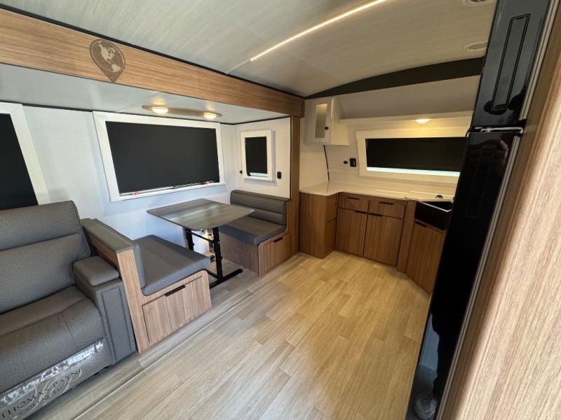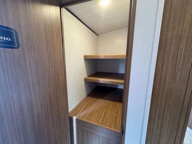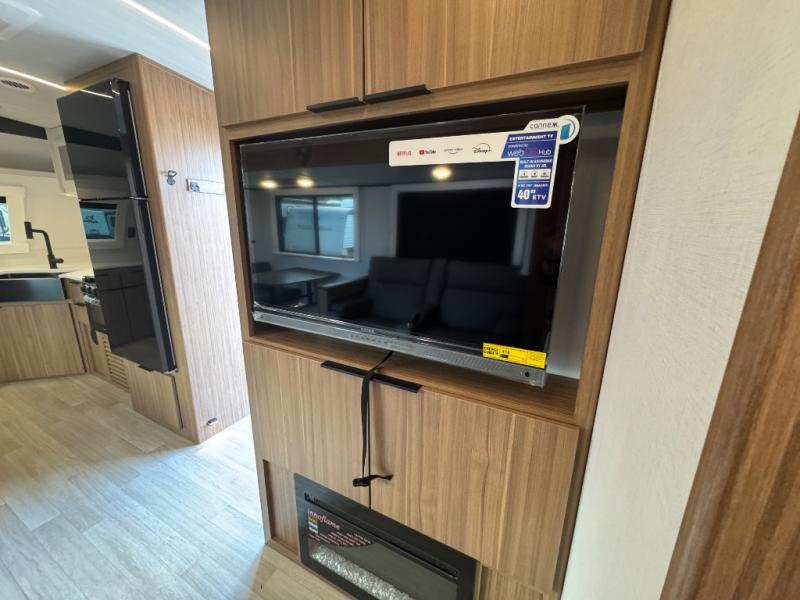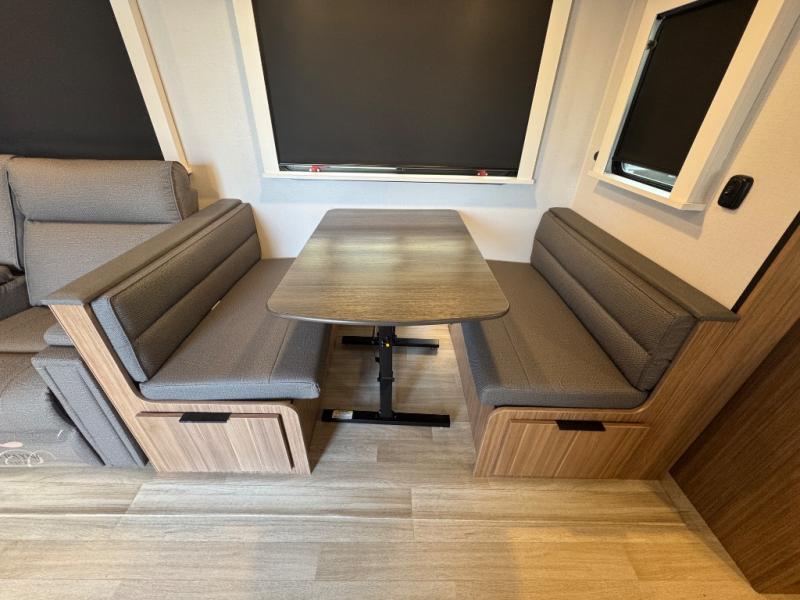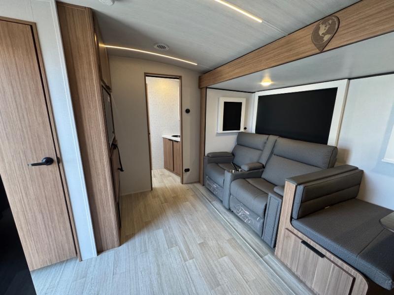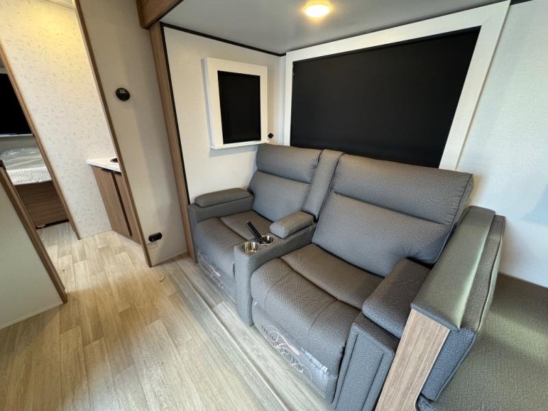 Pack your bags and hitch up this travel trailer! The dual entry doors make it easy to enter and exit especially from the rear private bedroom which has a king bed slide plus a dresser and a wardrobe. The bedroom also has an entrance into the dual entry bathroom where you will find a spacious shower to freshen up in each morning. After a fun day outdoors, you can relax on the tri-fold sofa across from the entertainment center with a fireplace or you can play a game or two at the Do-More dinette table. You can also choose the optional luxury cinema theater seating in place of the sofa and the optional free-standing dinette in place of the standard dinette depending on your needs. The chef will enjoy all of the space provided with the front kitchen with generous counter space!