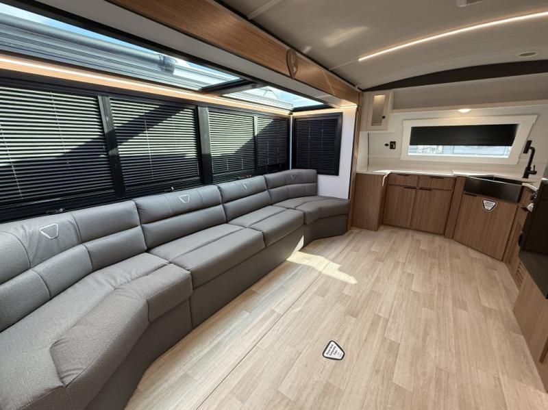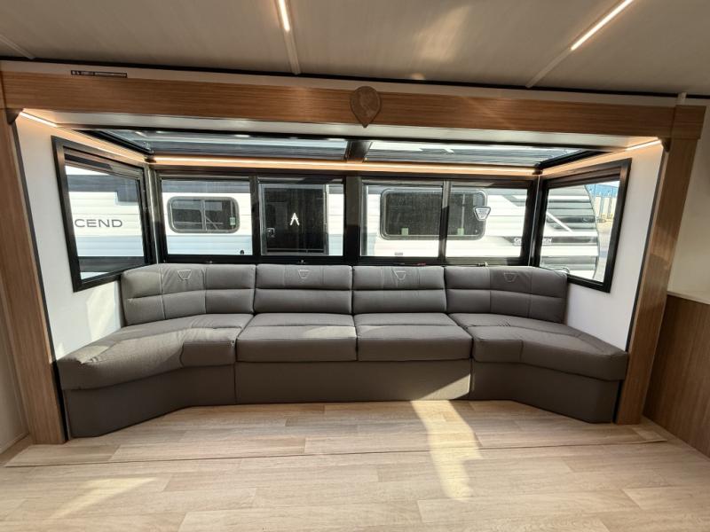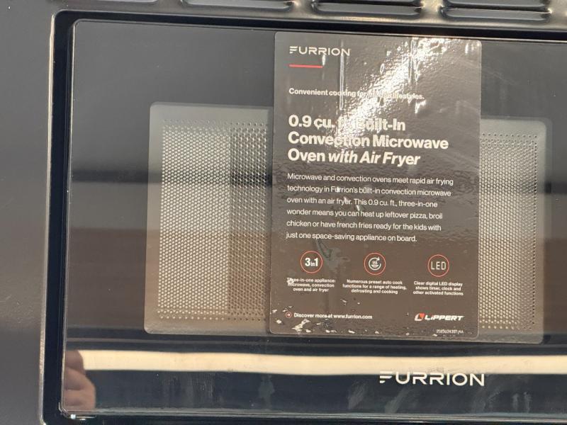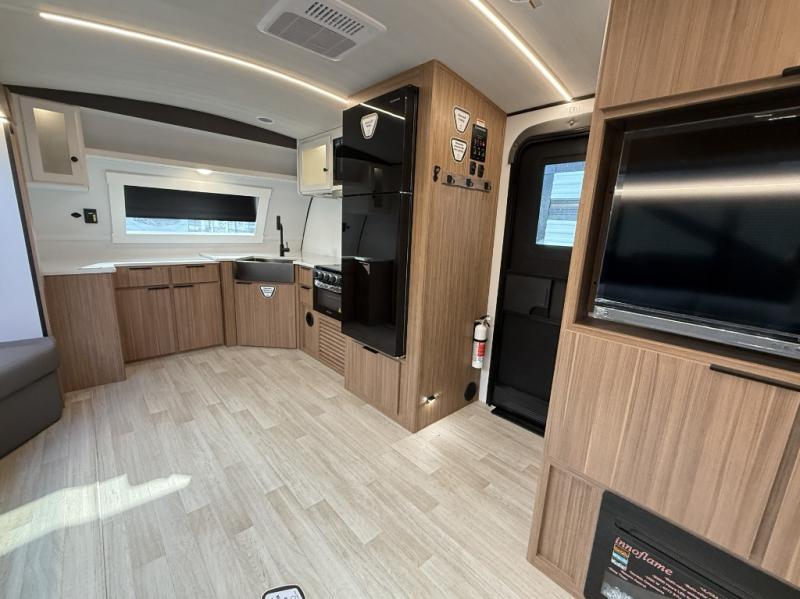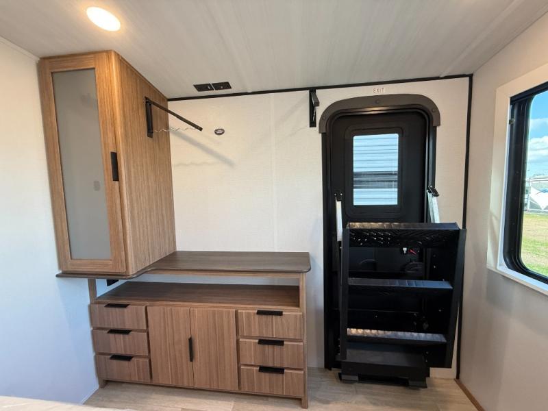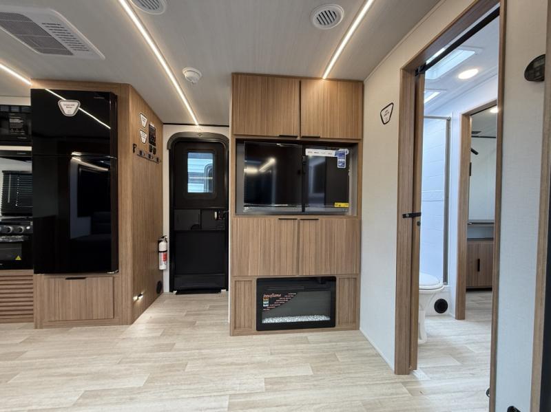 Pack your bags and hitch up this travel trailer! The dual entry doors make it easy to enter and exit especially from the rear private bedroom which has a king bed slide plus a dresser and a wardrobe. The bedroom also has an entrance into the dual entry bathroom where you will find a spacious shower to freshen up in each morning. After a fun day outdoors, you can relax on the tri-fold sofa across from the entertainment center with a fireplace or you can play a game or two at the Do-More dinette table. You can also choose the optional luxury cinema theater seating in place of the sofa and the optional free-standing dinette in place of the standard dinette depending on your needs. The chef will enjoy all of the space provided with the front kitchen with generous counter space!